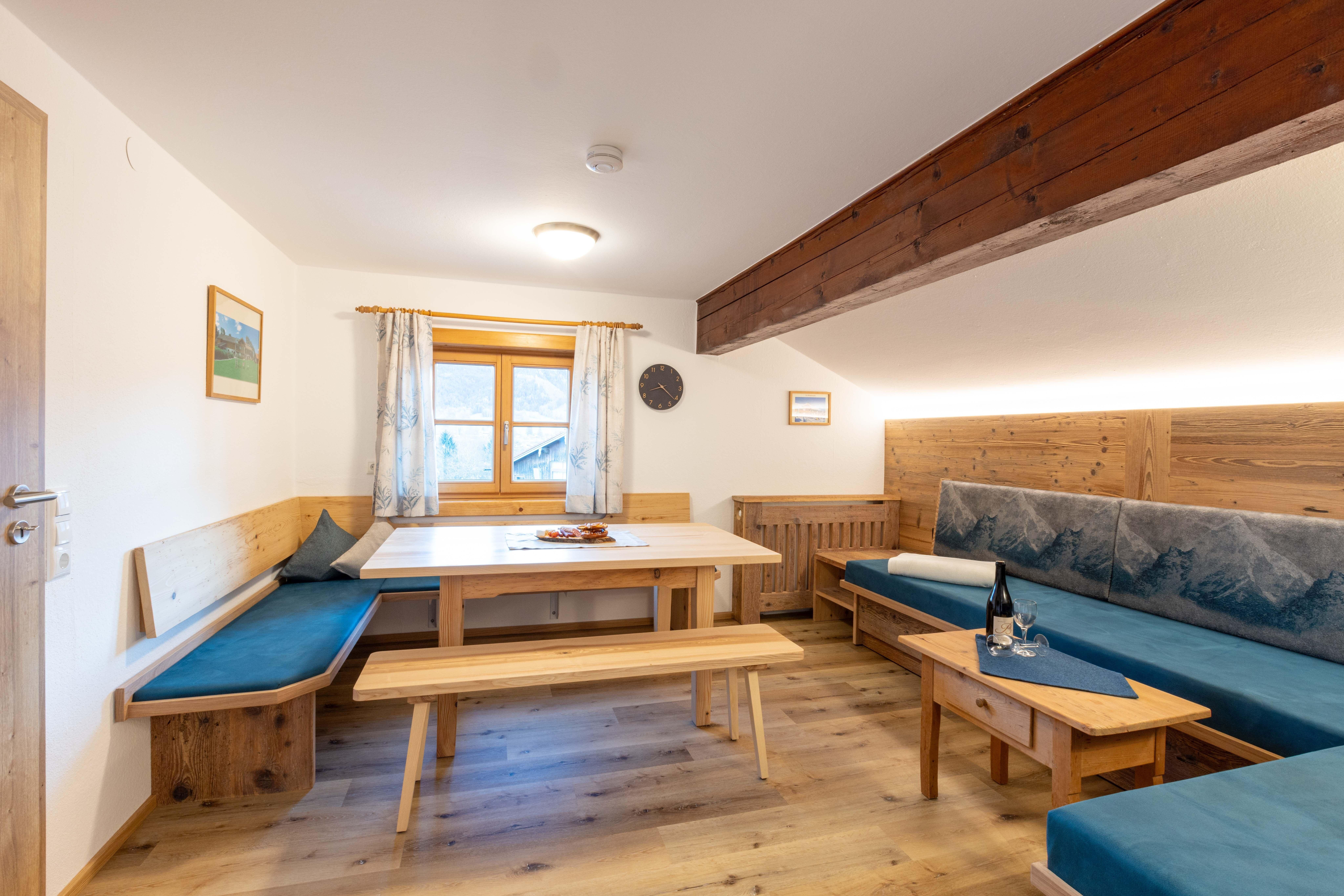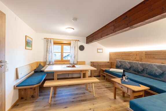 Mit ca. 70 qm Wohnfläche umfasst sie zwei getrennte Schlafzimmer, Wohnzimmer mit Couch und Essecke, Küche mit Spülmaschine, Flur, große Dusche/WC und Balkon über die Vorderseite unseres Bauernhofes mit herrlichem Ausblick auf Lenggries.