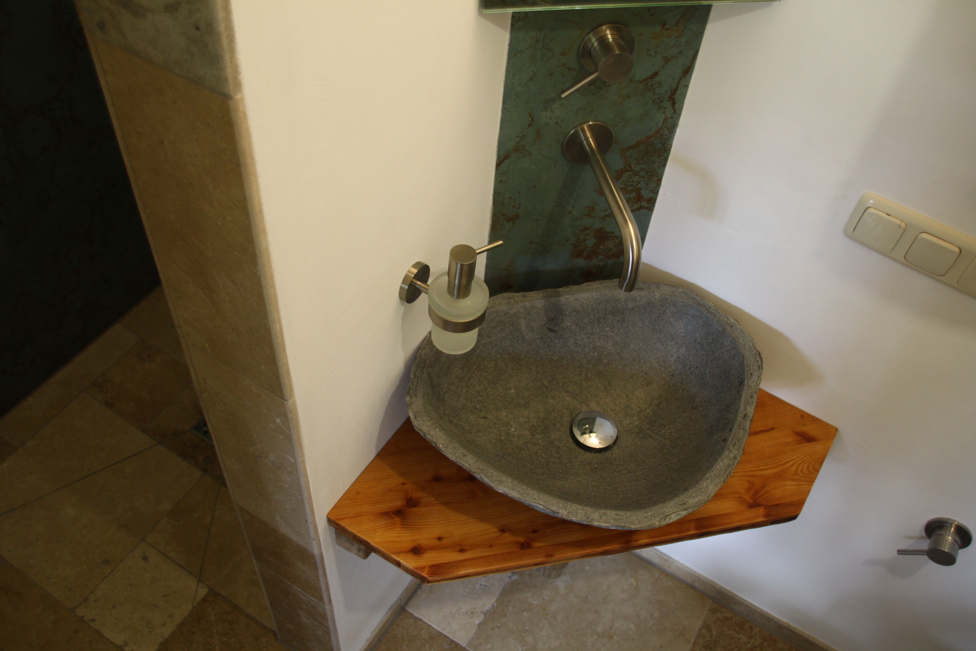Der Naßbereich (Badezimmer) wurde mit einer begehbaren Dusche, Taharet Dusch WC und Steinwaschbecken ausgestattet. Es wurde eine Fußbodenheizung sowie eine Wandheizung installiert, welches für ein angenehmes Duscherlebnis mit Blick in den Wohnbereich sorgt.