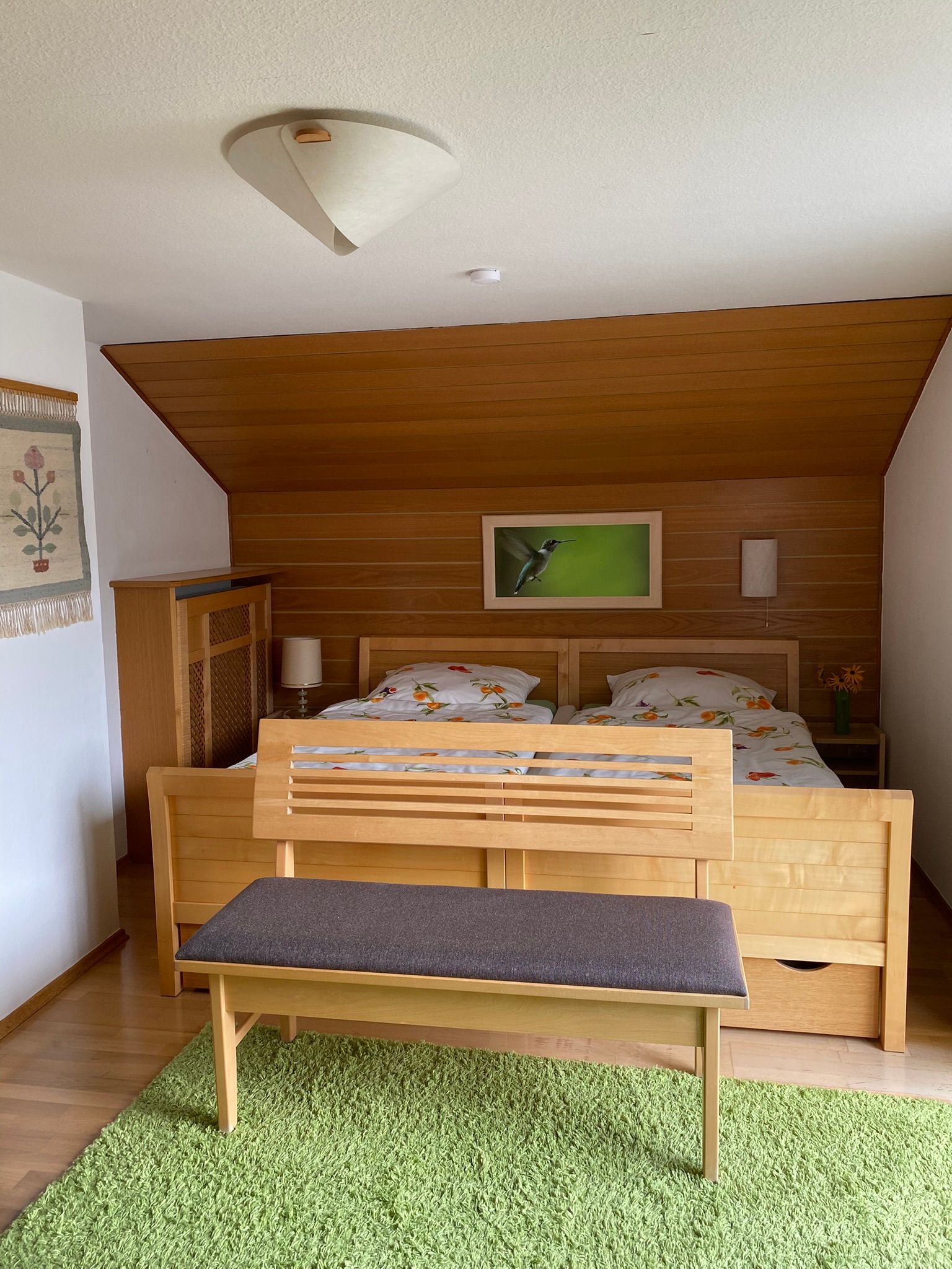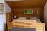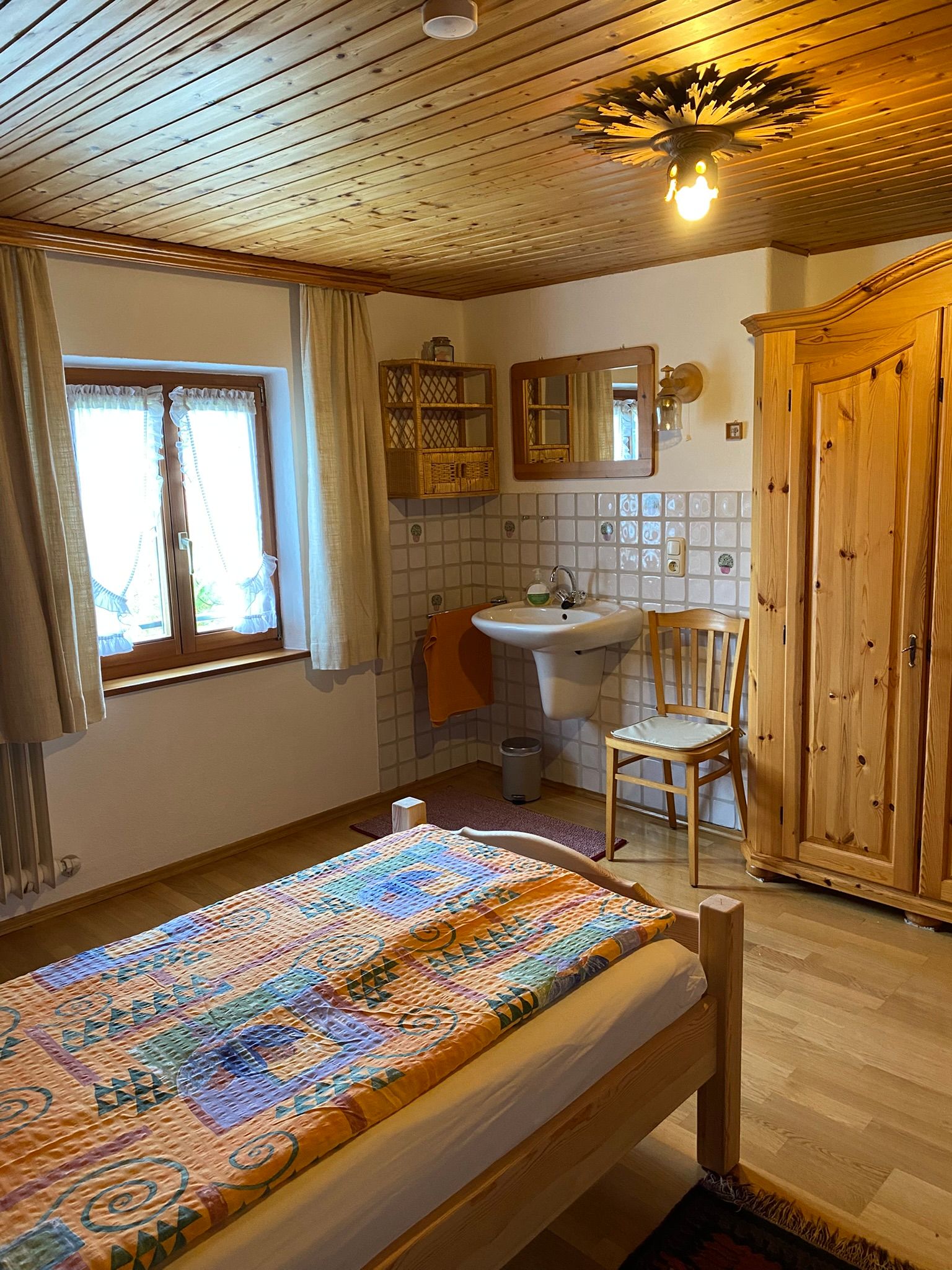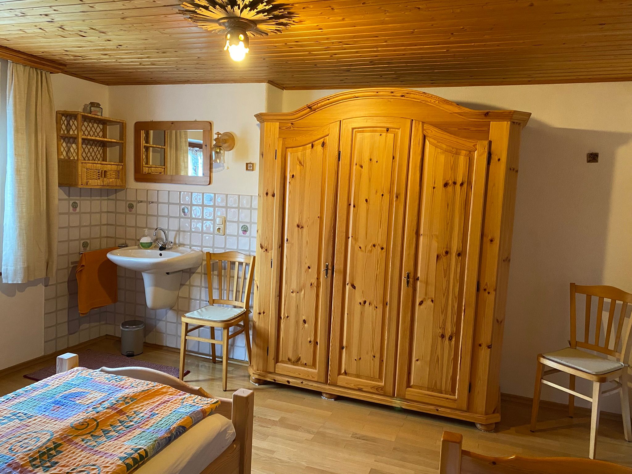 Im Elternschlafzimmer befindet sich ein Doppelbett mit den Maßen 2 x 2 Meter. Die Gewählte Holzart ist hier heimischer Ahorn. Eine große Schrankwand und eine Bank runden das Ensemble ab, welches über einen eigenen Balkon mit Bergblick verfügt. Ein sogenanntes „Bettstadl“, Kinderhochstuhl und ein Wickeltisch für unsere kleinsten Gäste kann auf Anfrage zur Verfügung gestellt werden.