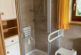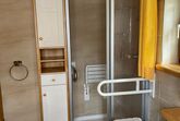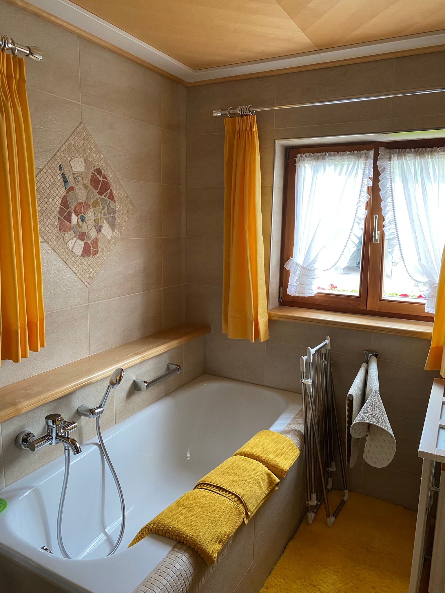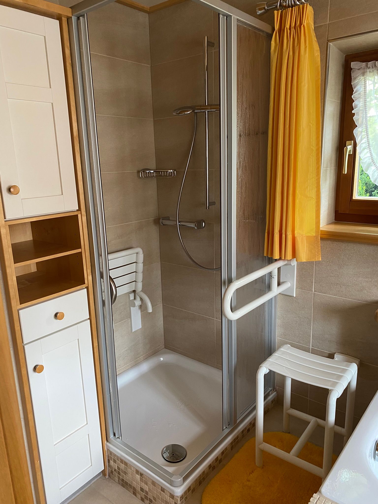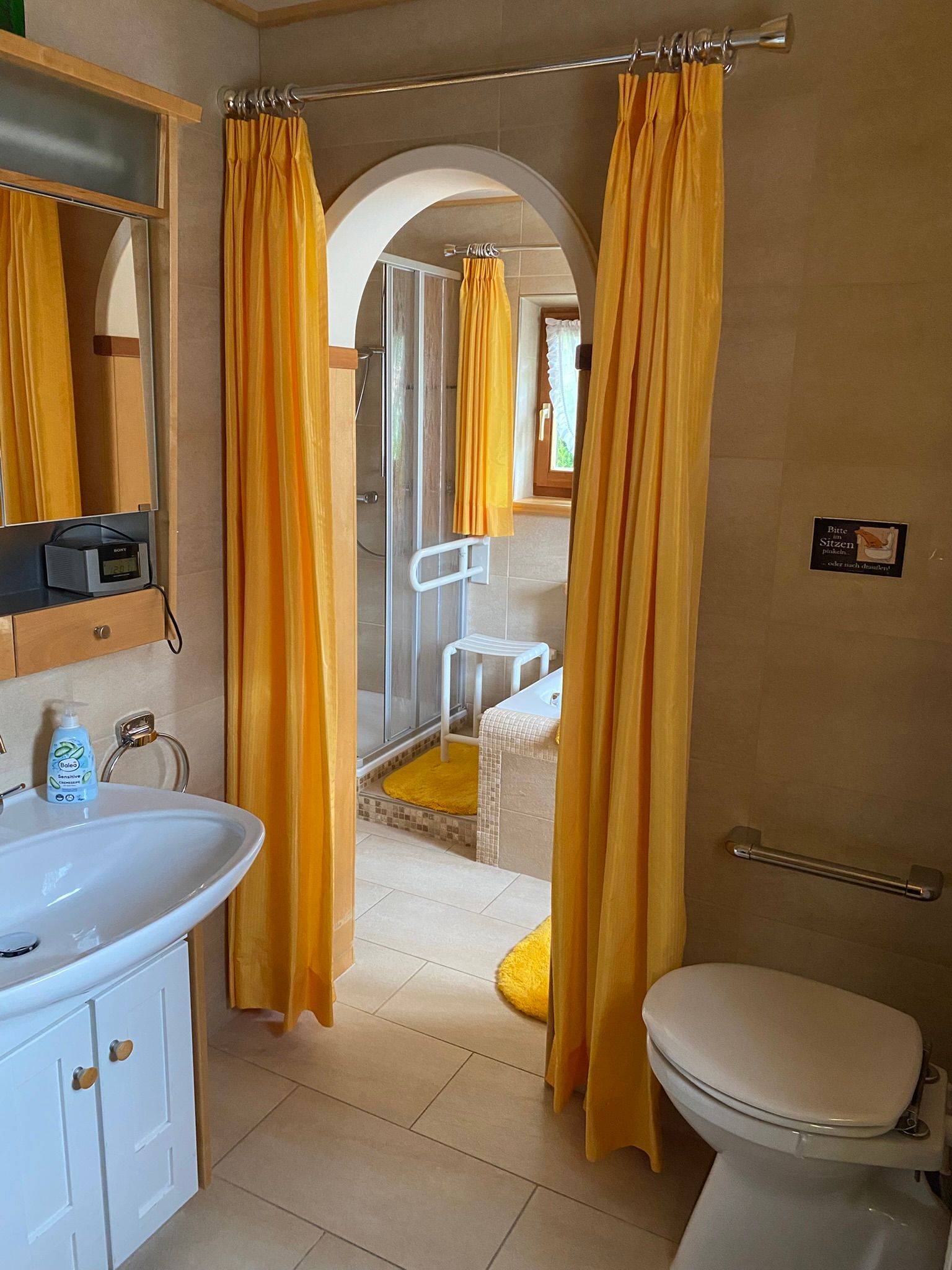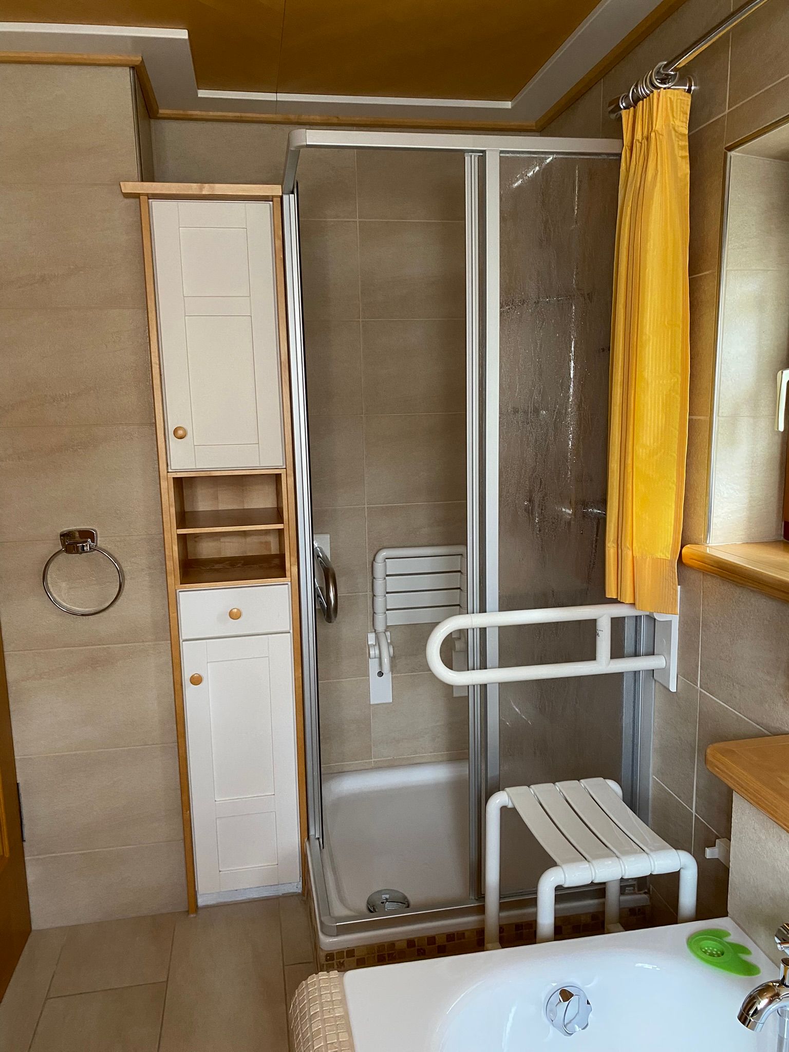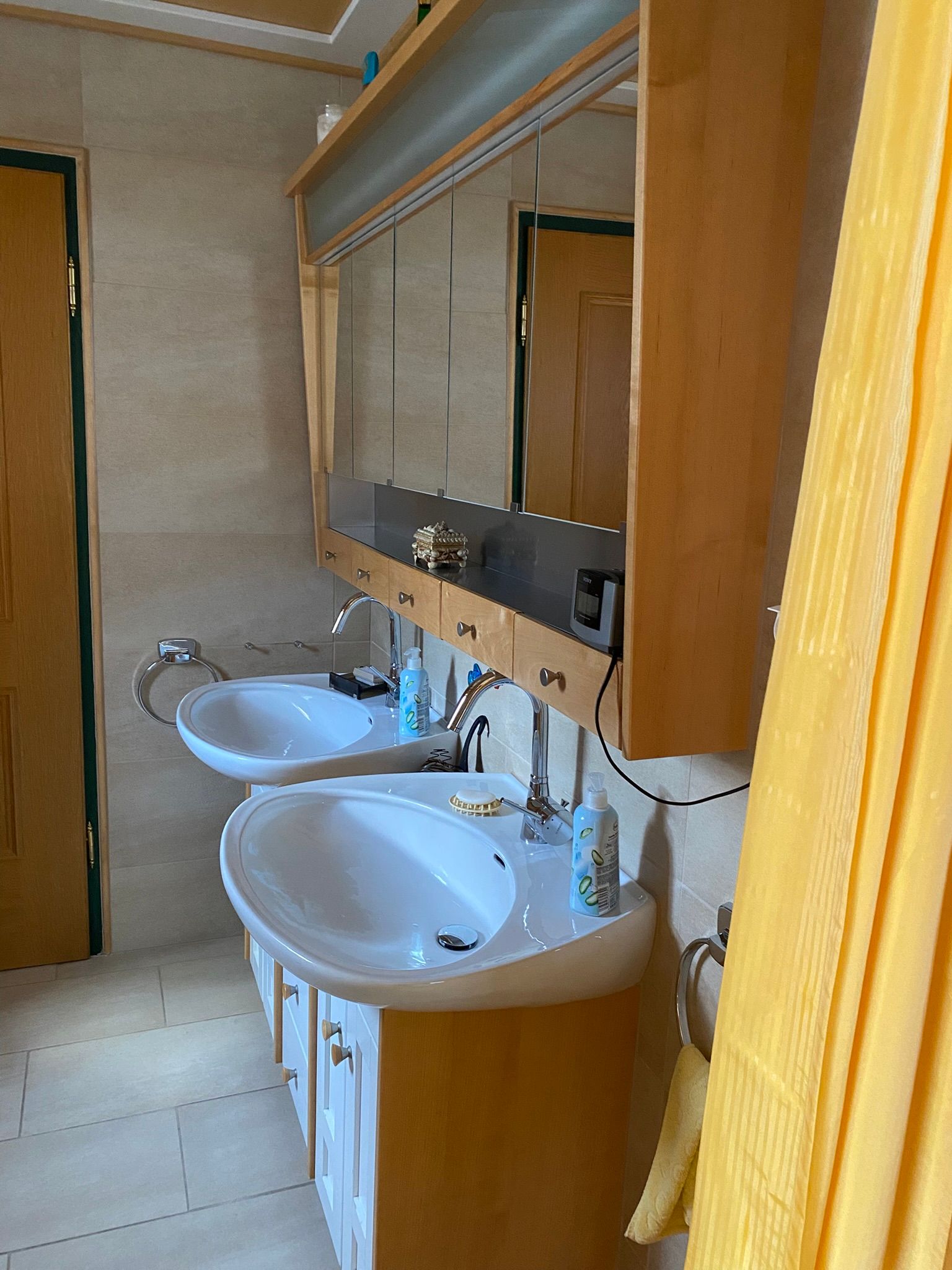 Auch im Badezimmer setzten wir auf Holz in Kombination mit zeitlosen Farben. Neben zwei separaten Waschtischen, einer Toilette sowie einer Badewanne befindet sich dort zusätzlich eine Dusche. Für eingeschränkte oder ältere Gäste befindet Sie hier eine festmontierte, ausklappbare Sitzmöglichkeit in der Duschkabine.