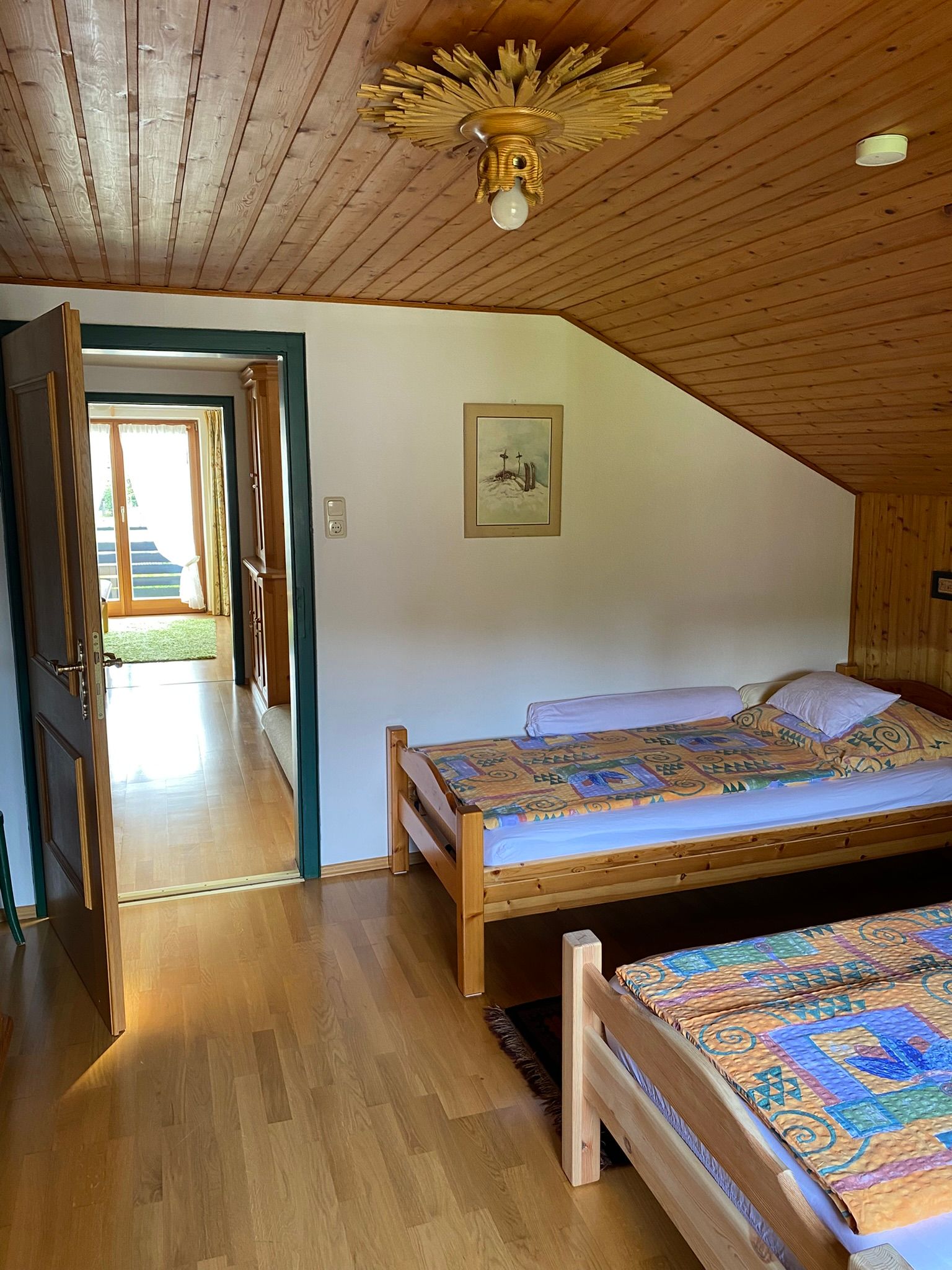 Unser Kiefernzimmer, aus massivem, heimischen Nadelholz sorgt bei Groß und Klein für besonders erholsamen Schlaf. Die Maße der Betten betragen jeweils 2 Meter auf 90 Centimeter. Ein extra Waschtisch und ein Großer Kleiderschrank, ein Nachtisch und eine Kommode sowie Stühle runden die Einrichtung ab. Wie bei all unseren Zimmern sind auch hier Steckdosen zum Laden von Smartphones oder für die Nutzung der Nachttischlampen vorhanden.