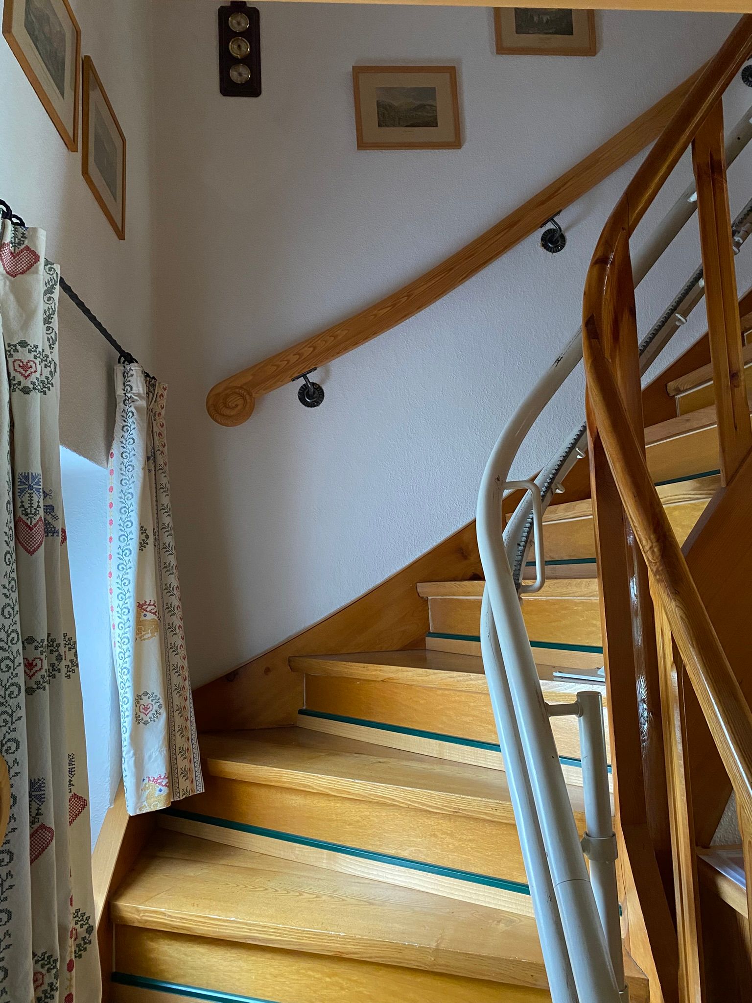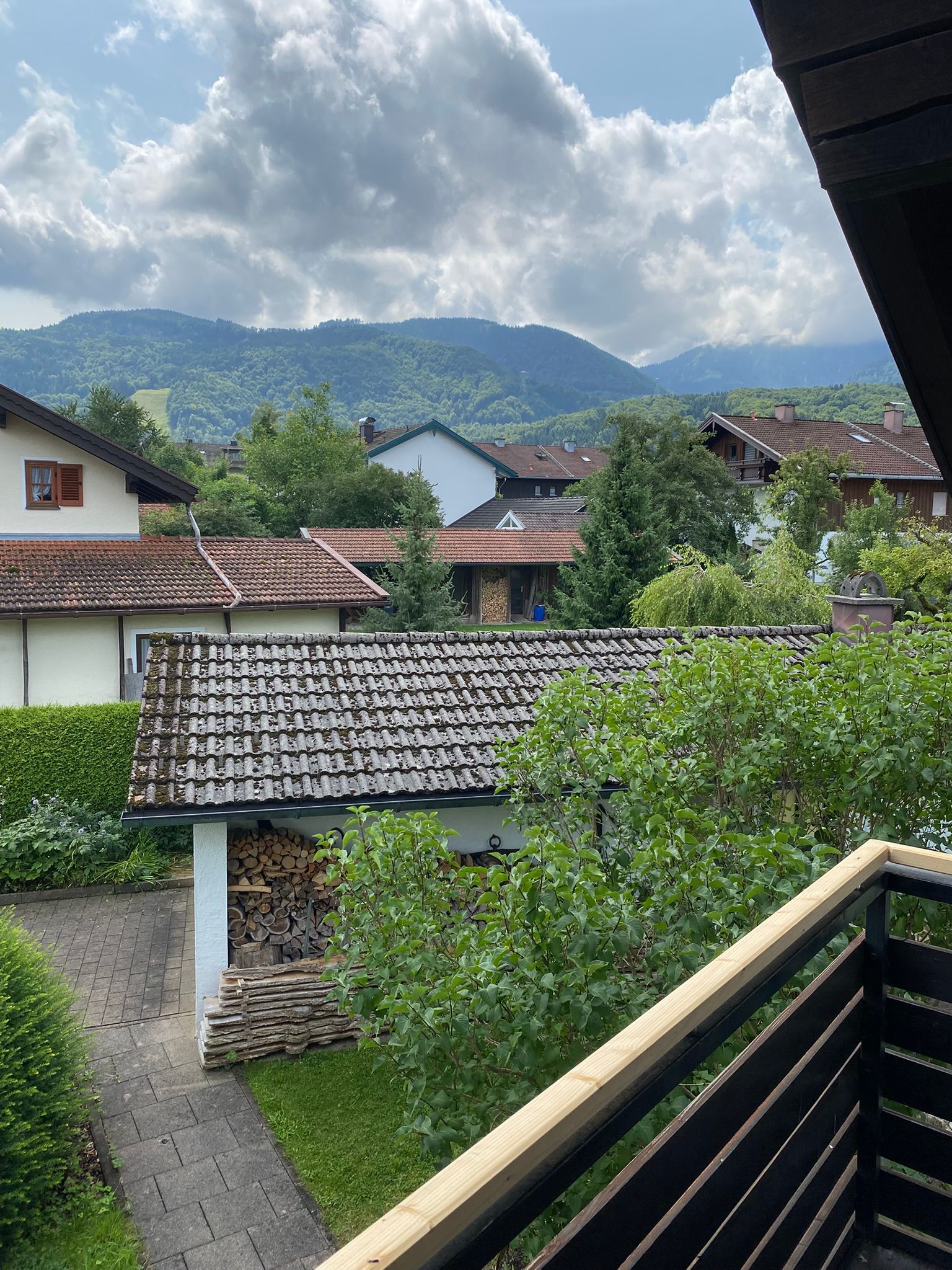 Vom kleinen Balkon des Elternschlafzimmers aus, lässt sich bei schönem Wetter der Gipfel des Hausberges erspähen. Mitreisende Kinder, können sich am Schauspiel der hin und her fahrenden Seilbahn, unseren Spielmöglichkeiten oder den teils schnatternd vorbeiwatschelnden tierischen Besuchern aus den Nachbargärten erfreuen.