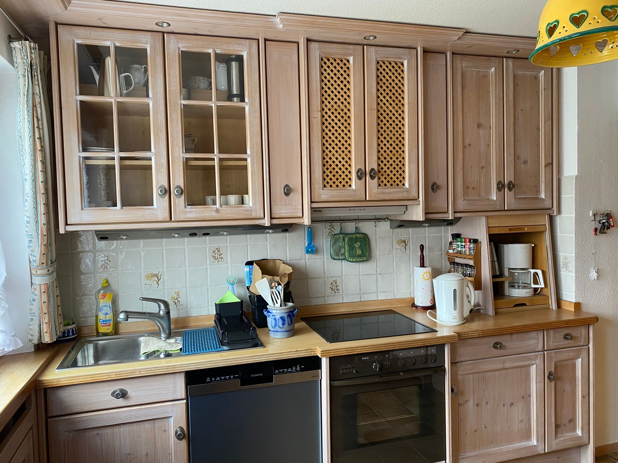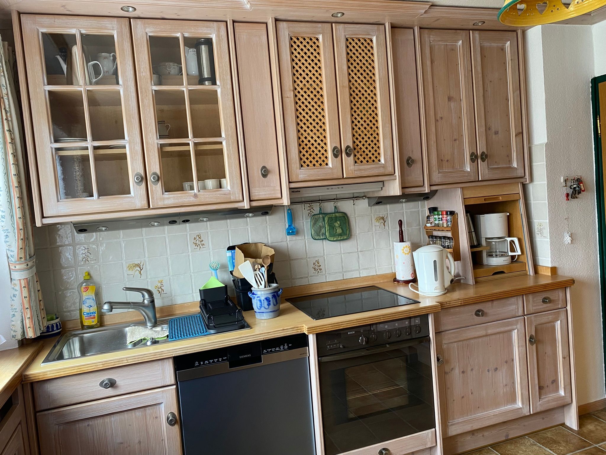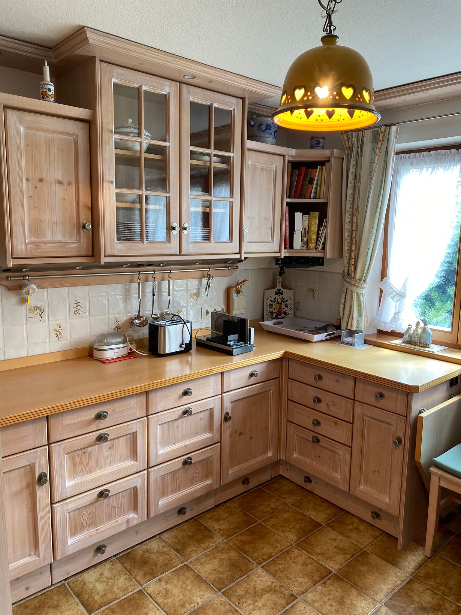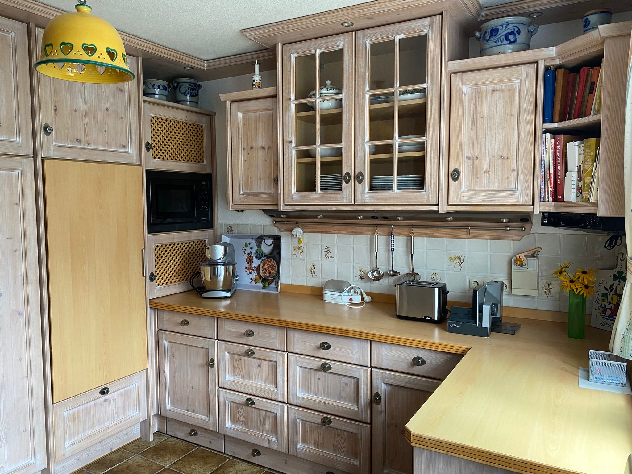 Unsere großzügige, gut ausgestattete Massivholzküche, ist besonders für Familien mit Kindern bestens geeignet. Ob große Arbeitsfläche, Backofen, Mikrowelle, Toaster, Brotschneidemaschine, Eierkocher, Multifunktionsrührer, Kühl-Gefrierkombination oder Gewürze – zum gemeinsam Loskochen und Genießen lädt unsere Küche allemal ein.