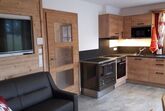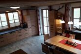 Wohnküche: E-Herd mit Backofen, Kühlschrank mit Gefrierfach, Holzofenherd mit Sichtfenster, Mikrowelle, Filter-Kaffeemaschine, Nespresso-Kaffeemaschine, Geschirrspüler und Wasserkocher