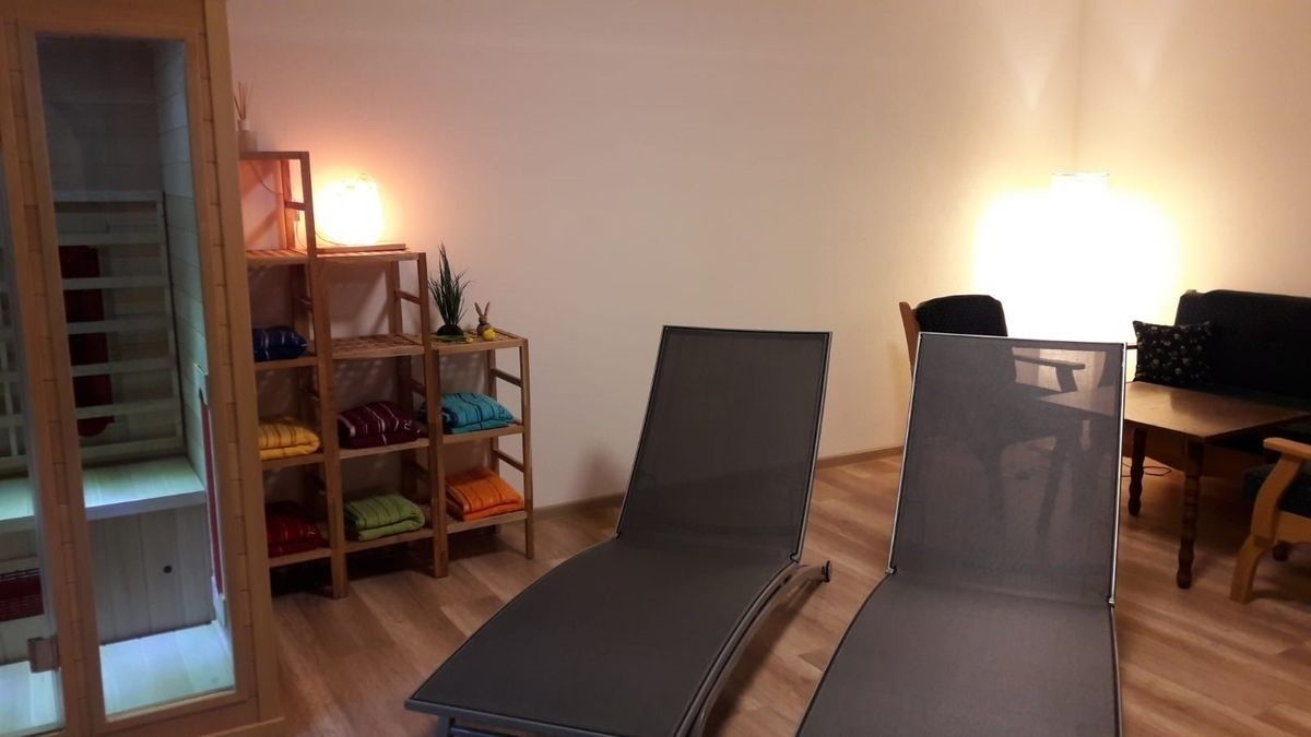 großer gemütlicher Wellnessbereich mit einer Infrarot-Sauna, Dusche und Ruhebereich