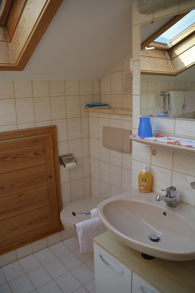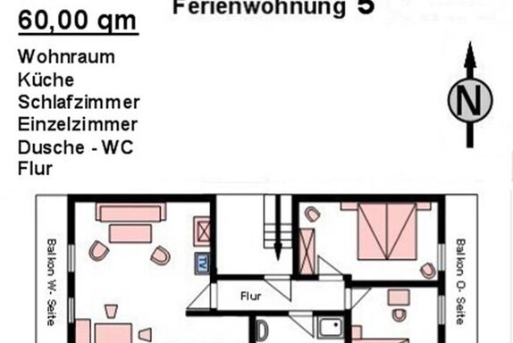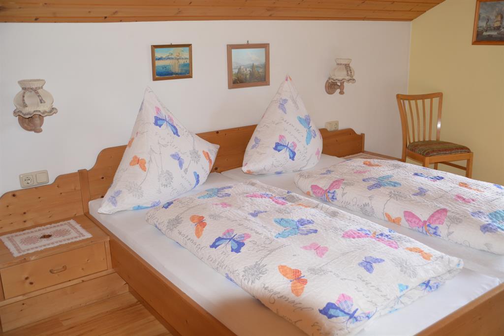 Unsere Ferienwohnung Nr. 5 befindet sich im 2. Stock. Sie hat ein Doppelzimmer und ein Einzelzimmer mit Balkon zur Ostseite, mit Blick auf die Berge. Neu-Bettenhöhe altersgerecht.Diese Wohnung bietet sich für Gäste an, die gerne getrennt schlafen möchten. Der Wohnungspreis erhöht sich bei Benutzung des 2ten Schlafzimmers ab 5,00 € pro Tag. Dusche/WC mit Dachfenster. Flur mit Garderobe und Ablagen. W-lan kostenlos!