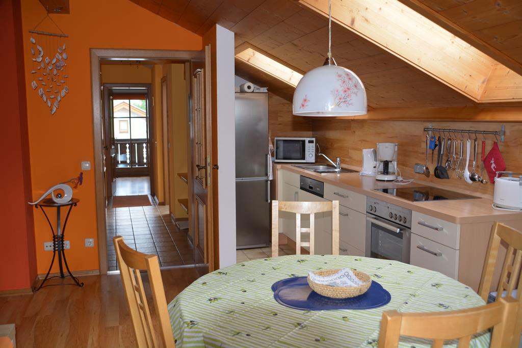 Die Küche ist ausgestattet - Elektroherd mit Backofen, Kühlschrank mit Gefrierfach, Spülmaschine Toaster, Wasserkocher, Eierkocher, und Mikrowelle. Ein runder Esstisch mit 4 Stühlen. Das Wohnzimmer hat eine schönes Sofa mit einem Tisch, Flachbildfernseher, CD-Player. Auf dem Balkon zur Süd-Westseite können Sie die Abendstunden noch genießen. Als Willkommensgruß gibt es selbstgebackene Kuchenstücke.