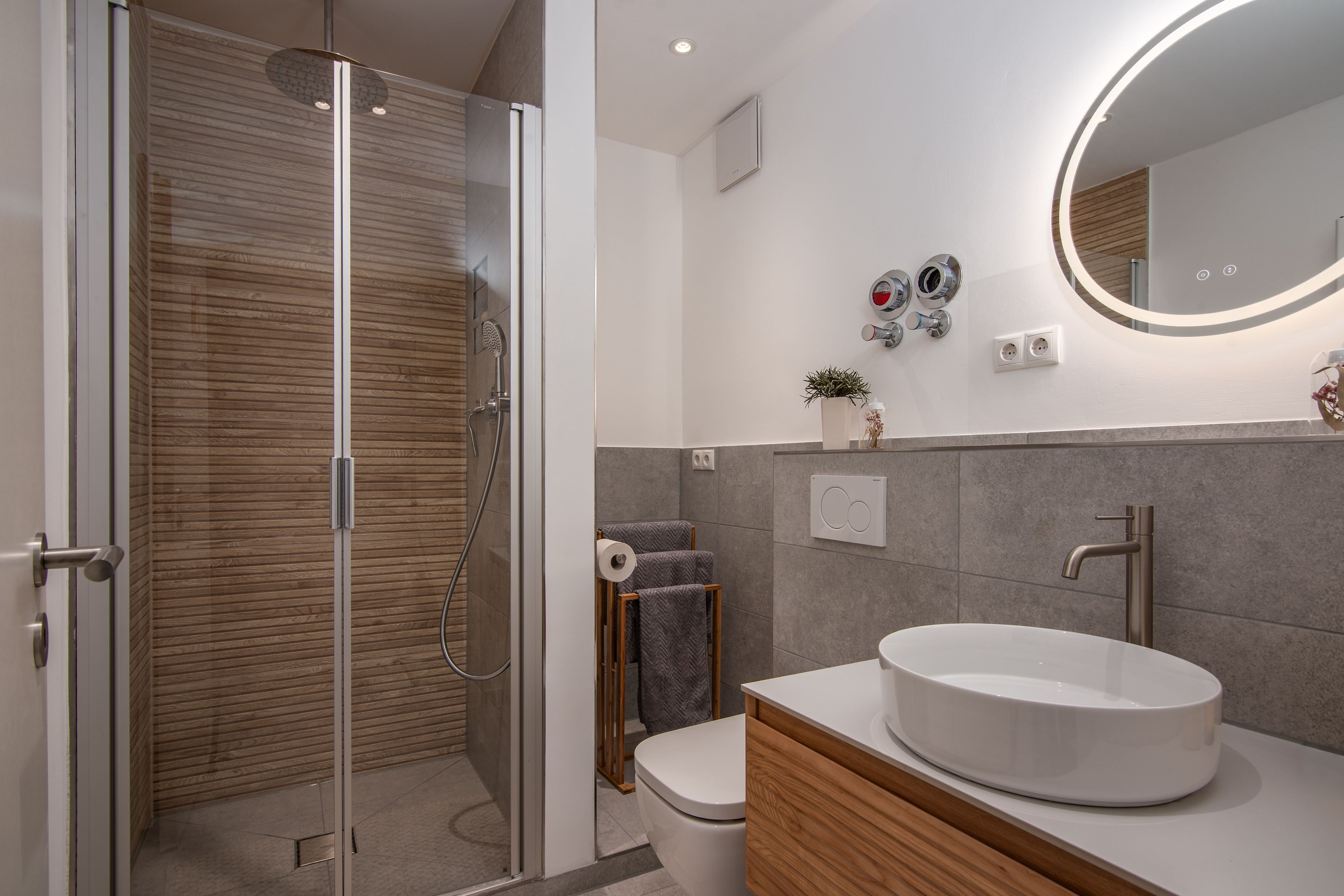 - helles, modernes Badezimmer mit Dusche. Duschgel und Handseife sind genauso wie Handtücher, Kaffee und Tee immer inklusive und kostenlos
