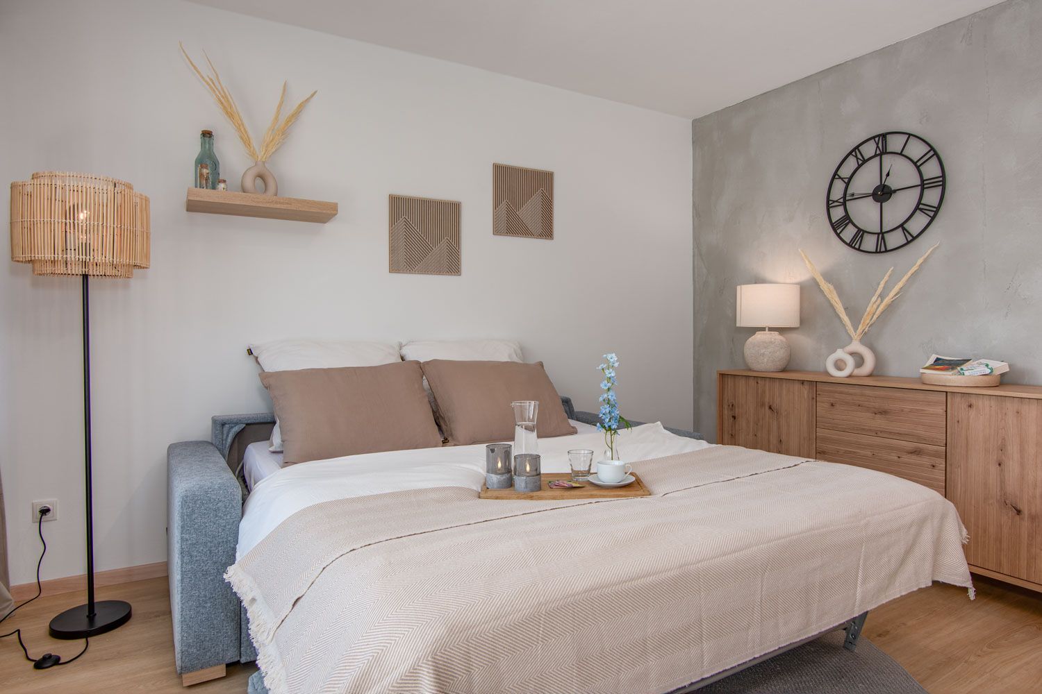 Am Abend machst du es dir dann in unserem Queensize-Bett im Schlafzimmer mit Matratze in Hotelqualität und Bettwäsche aus reiner Baumwolle bequem. Zwei weitere Personen können ganz bequem auf dem Queensize-Bett der Marke Sits schlafen, welches du im großzügigen Wohnzimmer mit nur zwei Handgriffen ganz einfach von einer Designercouch in ein vollwertiges Bett mit eigenem Lattenrost und hochwertiger Matratze verwandelst. Auch hier lässt sich der Tag ganz wunderbar in Gedanken Revue passieren.