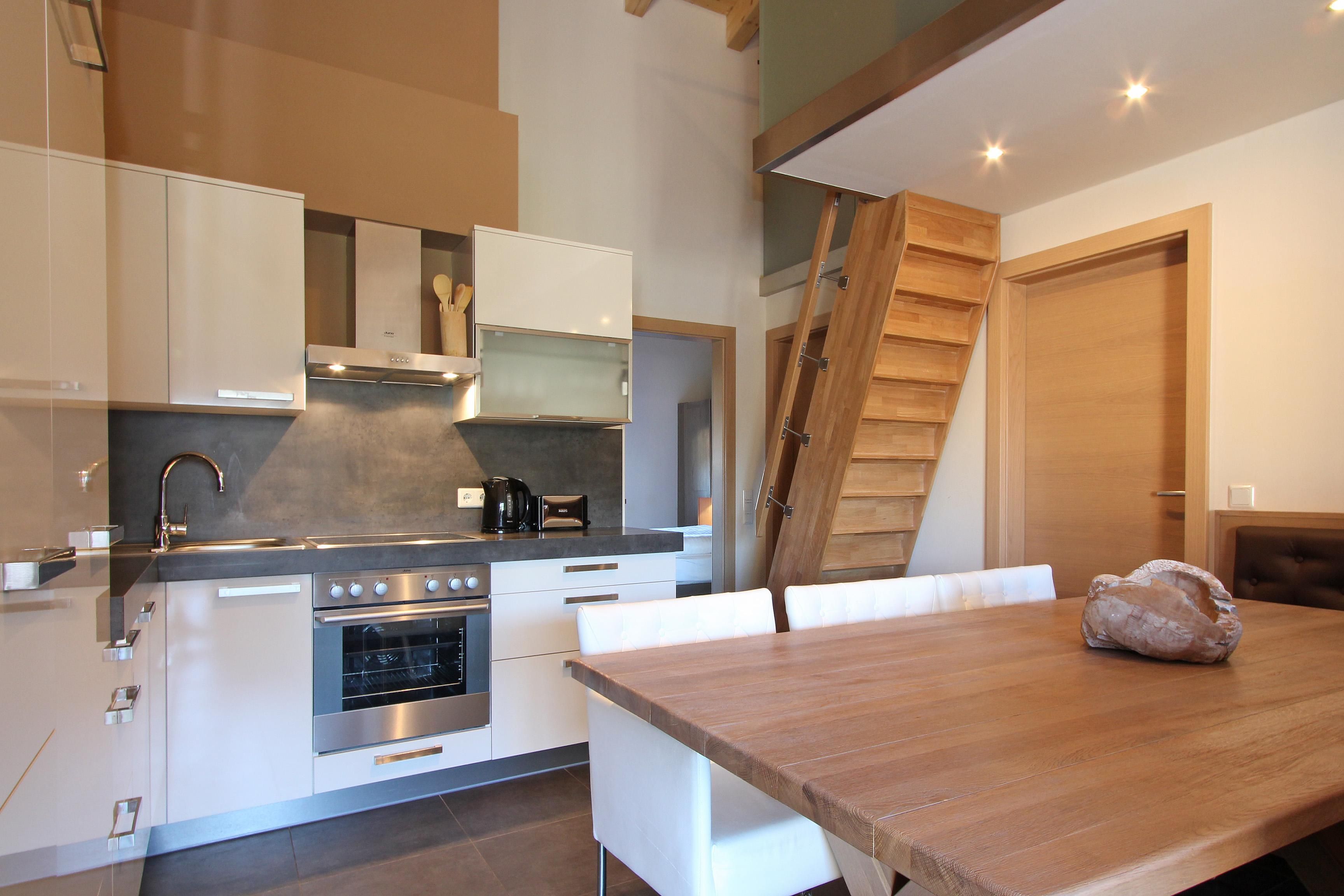 Das designorientierte Penthouse mit wunderschöner Holzdecke besteht aus zwei großen Schlafzimmern mit jeweils einem Doppelbett und zwei Badezimmern, wovon eines mit Badewanne und separater Toilette ausgestattet ist. Das Wohnzimmer ist sehr großzügig konzipiert mit einem großen Esstisch und einer offenen Design-Küche. In der Sitzecke lässt es sich am Kamin gemütlich entspannen. Vom Wohnzimmer aus gelangt man direkt zum großen Balkon mit toller Aussicht.