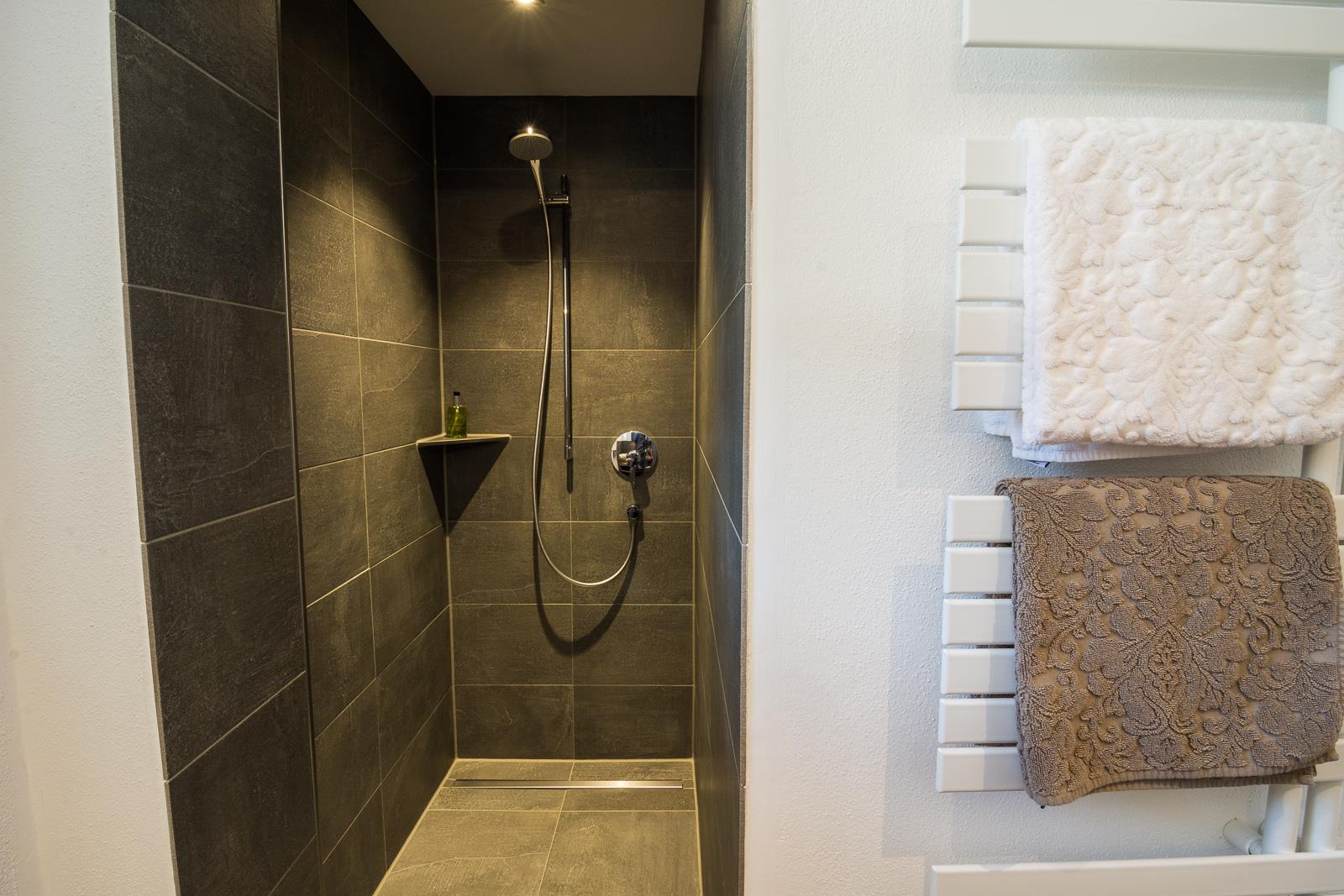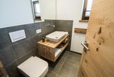 • Badezimmer mit Walk-in-Dusche und WC im Tiefparterre