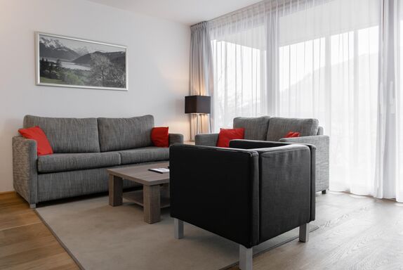 Erleben Sie das Bellevue-Gefühl: Die majestätische Schmittenhöhe umrahmt den klaren Zeller See direkt vor der Residenz. Entspannen Sie auf der eleganten Sonnenterrasse und genießen Sie den atemberaubenden Blick auf das Wasser und die umliegenden Berge.