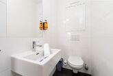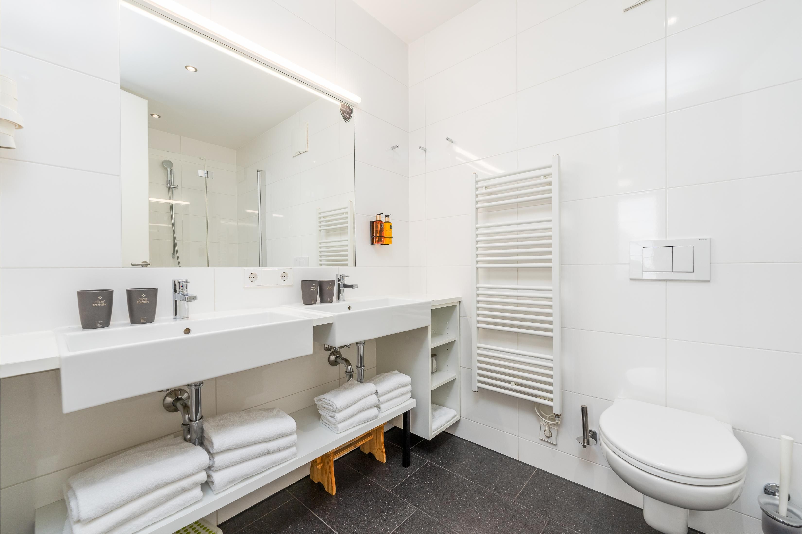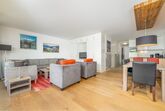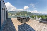 Das Penthouse mit drei Schlafzimmern befindet sich im siebten und zugleich obersten Stockwerk. Es gibt zwei Schlafzimmer mit jeweils einem Doppelbett und ein Schlafzimmer mit zwei Einzelbetten. Zusätzlich gibt es zwei Badezimmer mit Badewanne oder Dusche und WC. Das geräumige Wohnzimmer verfügt über einen großen Esstisch und eine offene Designer-Küche. In der gemütlichen Sitzecke sorgt eine ausziehbare Schlafcouch für weiteren Platz. Der 56 m² große Balkon ist vom Wohnzimmer aus zugänglich und bietet einen herrlichen Blick auf den See.