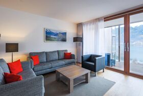 Das Apartment mit drei Schlafzimmern befindet sich auf der zweiten Etage der Residence Bellevue. Die Schlafzimmer sind jeweils mit einem Doppelbett ausgestattet. Zusätzlich gibt es ein Badezimmer mit Badewanne / Dusche und WC. Das geräumige Wohnzimmer verfügt über einen großen Esstisch und eine offene Designerküche. Am Balkon eröffnet sich ein atemberaubender Blick auf die Berge und den See.