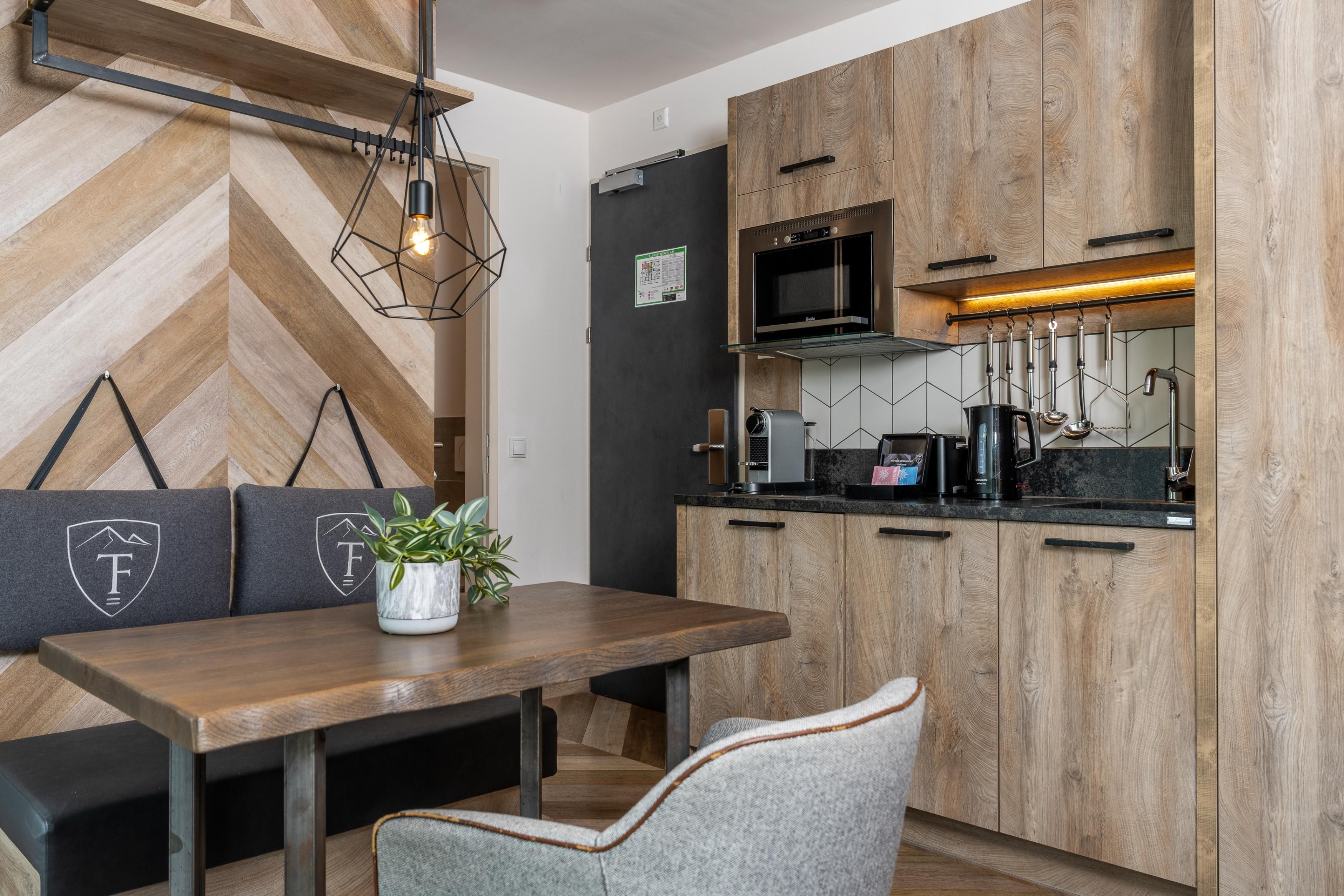 Unser Studio eignet sich perfekt für den Urlaub zu zweit. Die Einrichtung im modernen alpinen Stil schafft eine helle Atmosphäre. Eine kleine Kochnische und eine gemütliche Sitzbank machen den Raum neben einem komfortablen Bett und einem Bad mit Dusche und WC komplett. Der private Balkon lädt dazu ein, den Abend bei einem guten Glas Wein ausklingen zu lassen.