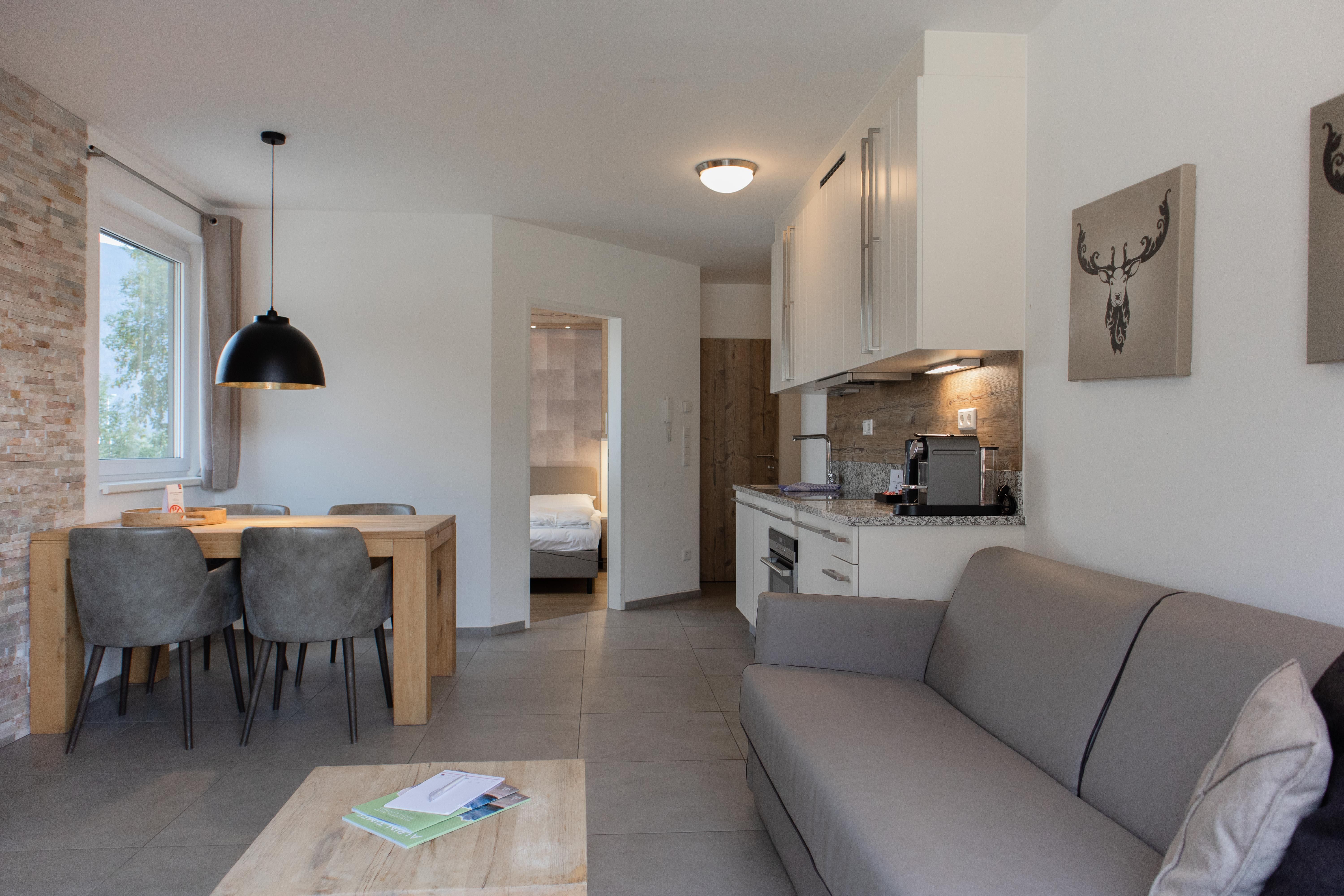 Dieses Ein-Schlafzimmer Apartment befindet sich im ersten Stock der Ski & Golf Suites. Das Schlafzimmer ist mit einem Doppelbett ausgestattet und es gibt ein Badezimmer mit Dusche. Das Wohnzimmer verfügt über einen Esstisch und eine offene Designer Küche. Die gemütliche Sitzecke mit einem bequemen Sofa-Bett lädt zum Entspannen ein. Der Balkon ist vom Wohnzimmer aus zugänglich.
