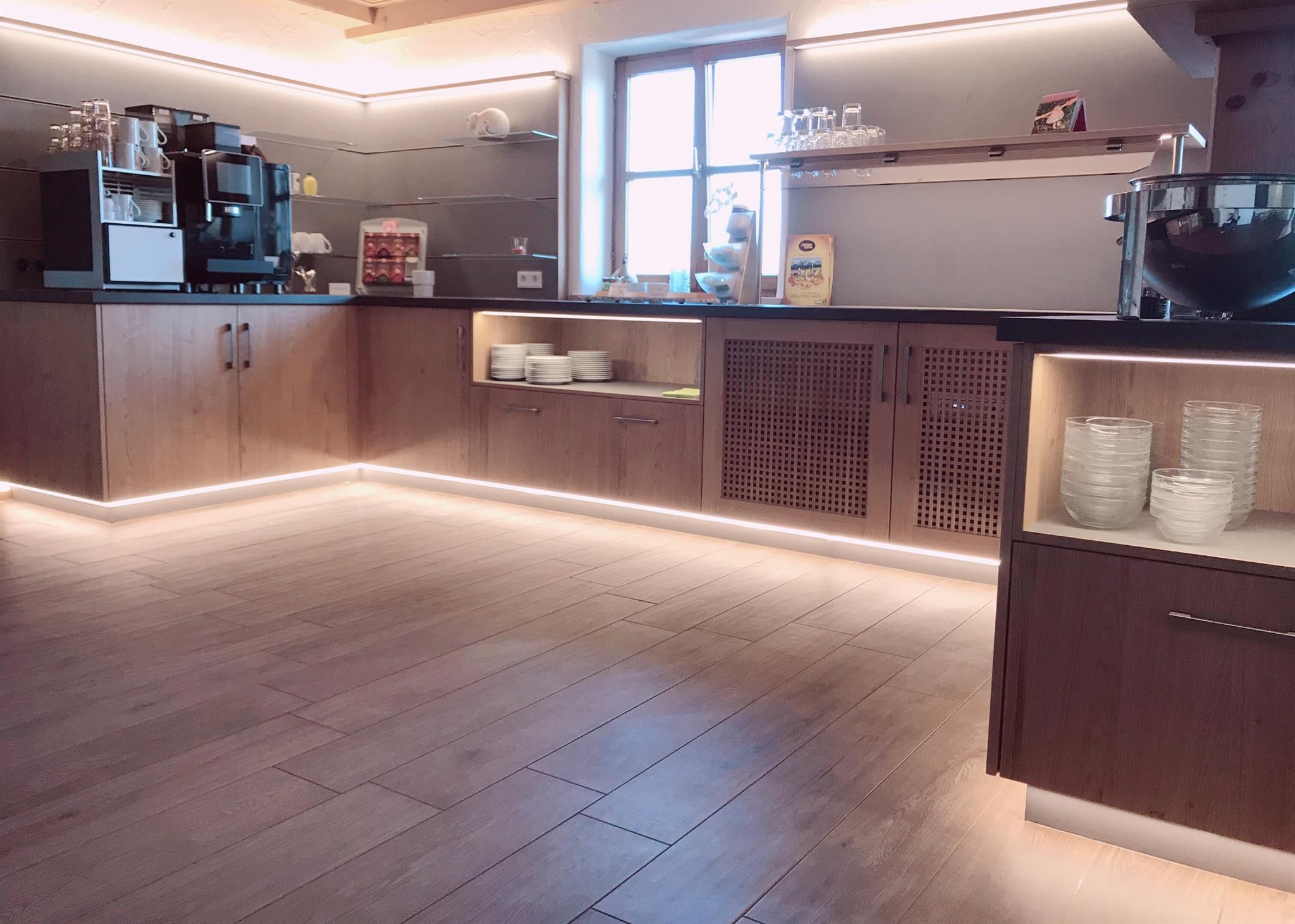 Die Gäste in den Fewos erhalten jeden morgen frische Semmeln an die Türe, spontane Teilnahme am Frühstücksbuffet ist jederzeit zubuchbar (gegen Gebühr).