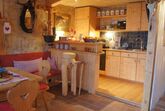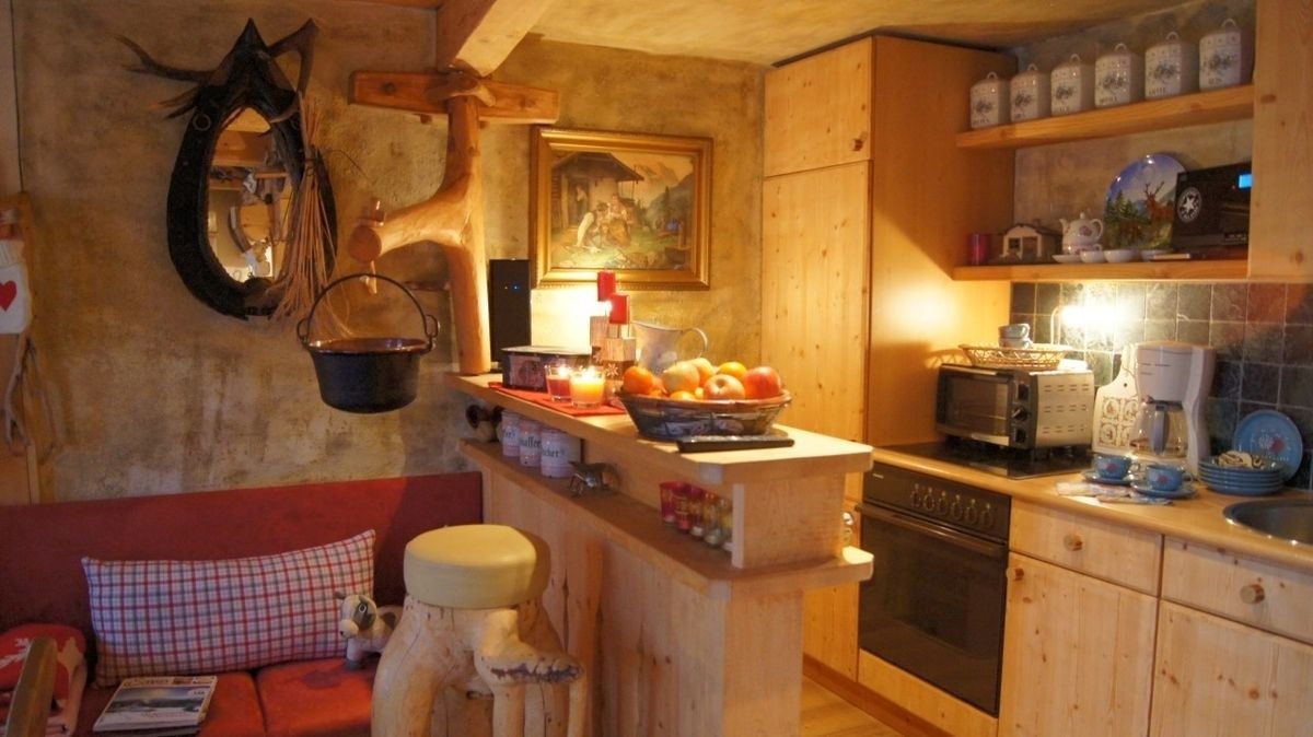 Gemütliche Wohnstube: Mit Küchenzeile, Elektroherd, Backofen, Kühlschrank, Kaffeemaschine und mehr.