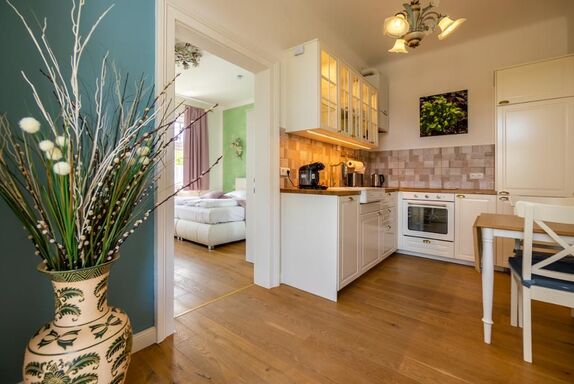 Apartment Lara im zweiten Obergeschoss überzeugt mit seinem kompakten, charmanten Grundriss auf ca. 35 m² und ist über eine traditionelle Pawlatsche erreichbar. Nach einem kleinen Eingangsbereich öffnet sich eine gut ausgestattete Küche, die in ein gemütliches Schlafzimmer mit komfortablem Doppelbett übergeht – ein idealer Rückzugsort für Paare oder Alleinreisende, die stilvolle Schlichtheit und behagliche Ruhe im Herzen des Hauses genießen möchten.