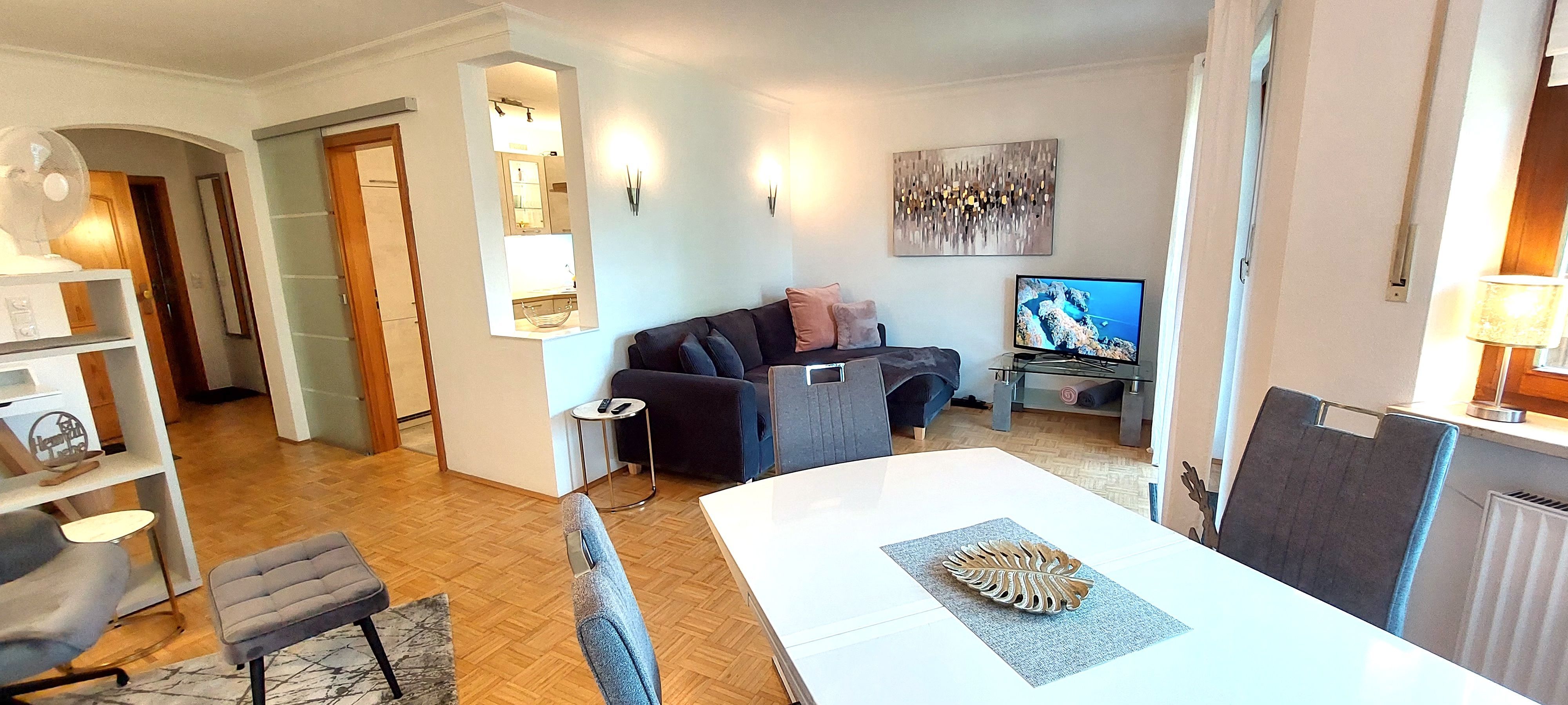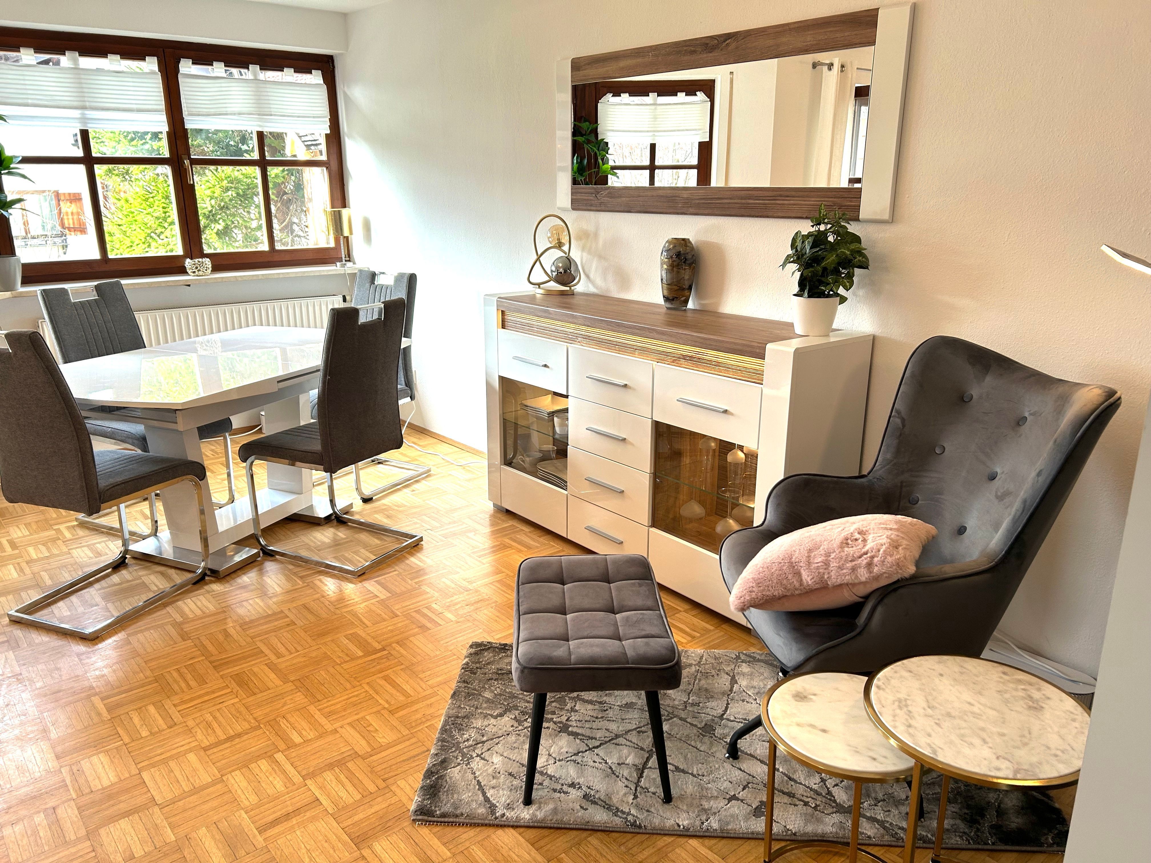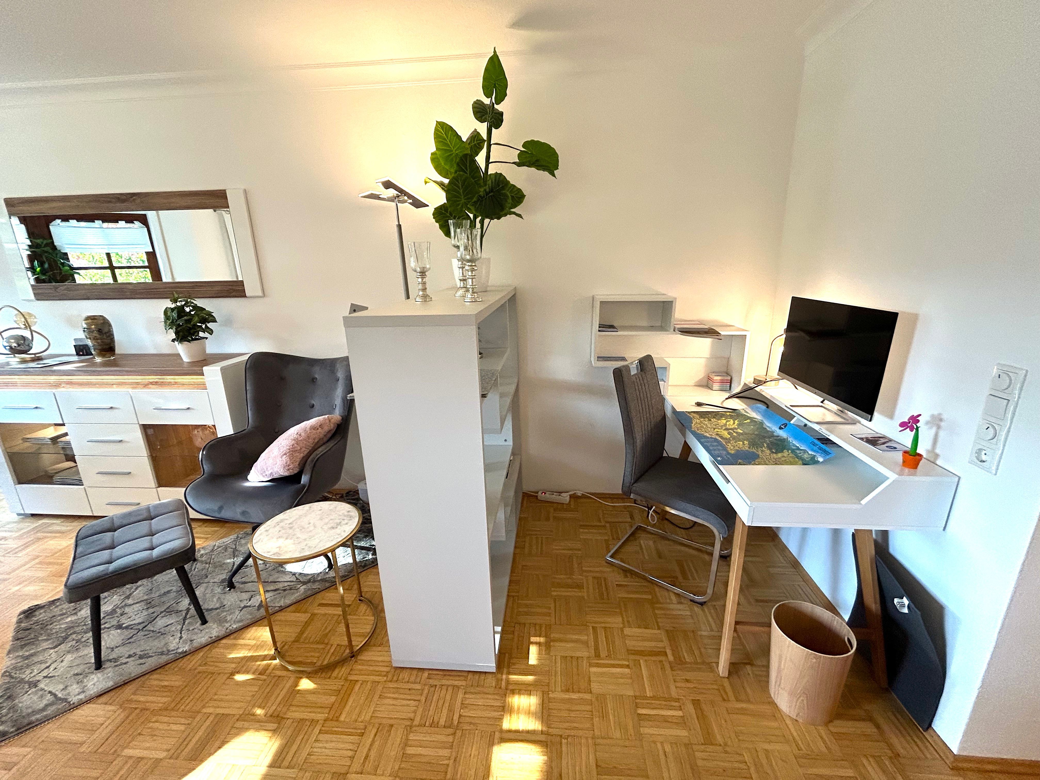 Vom Eingangsbereich mit Garderobe erreichen Sie alle Räume der Wohnung. Das geräumige Wohn- und Esszimmer ist mit einer bequemen Wohnlandschaft (Schlafcouch für eine zusätzliche Person), einer gemütlichen Leseecke sowie einem separaten Schreibtischbereich ausgestattet, ideal für konzentriertes Arbeiten. Das schnellste WLan ermöglicht auch die Nutzung als Homeoffice. Vom Wohnzimmer aus gelangen Sie auf die teilüberdachte Lounge-Terrasse, mit Blick wunderbaren Blick ins Grüne.