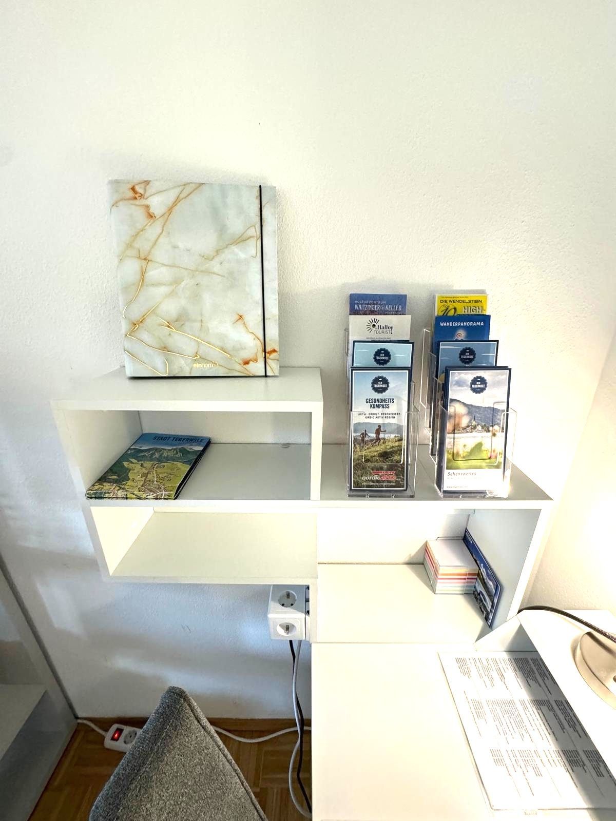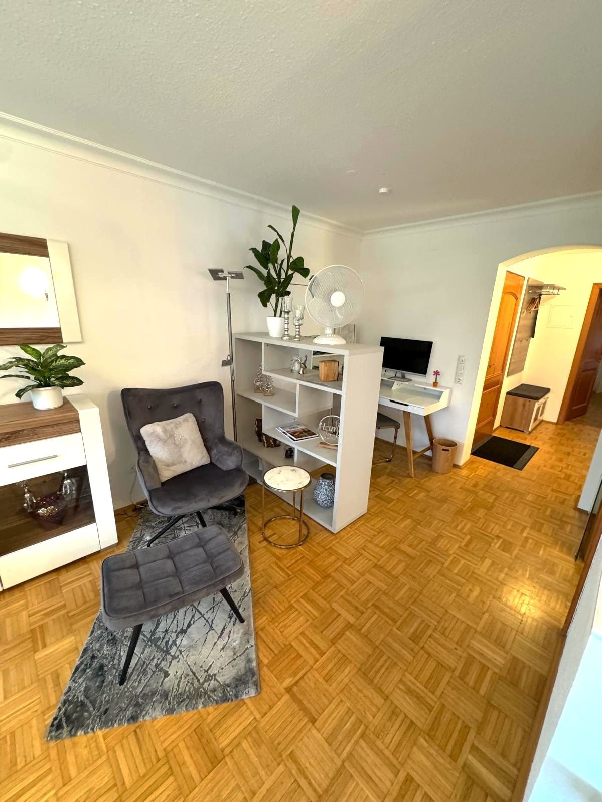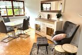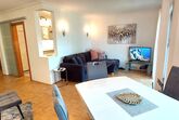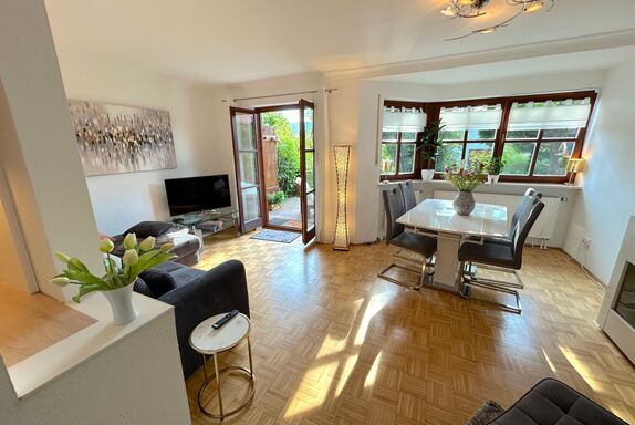 Vom Eingangsbereich mit Garderobe erreichen Sie alle Räume der Wohnung. Das geräumige Wohn- und Esszimmer ist mit einer bequemen Wohnlandschaft (Schlafcouch für eine zusätzliche Person), einer gemütlichen Leseecke sowie einem separaten Schreibtischbereich ausgestattet, ideal für konzentriertes Arbeiten. Das schnellste WLan ermöglicht auch die Nutzung als Homeoffice. Vom Wohnzimmer aus gelangen Sie auf die teilüberdachte Lounge-Terrasse, mit Blick wunderbaren Blick ins Grüne.