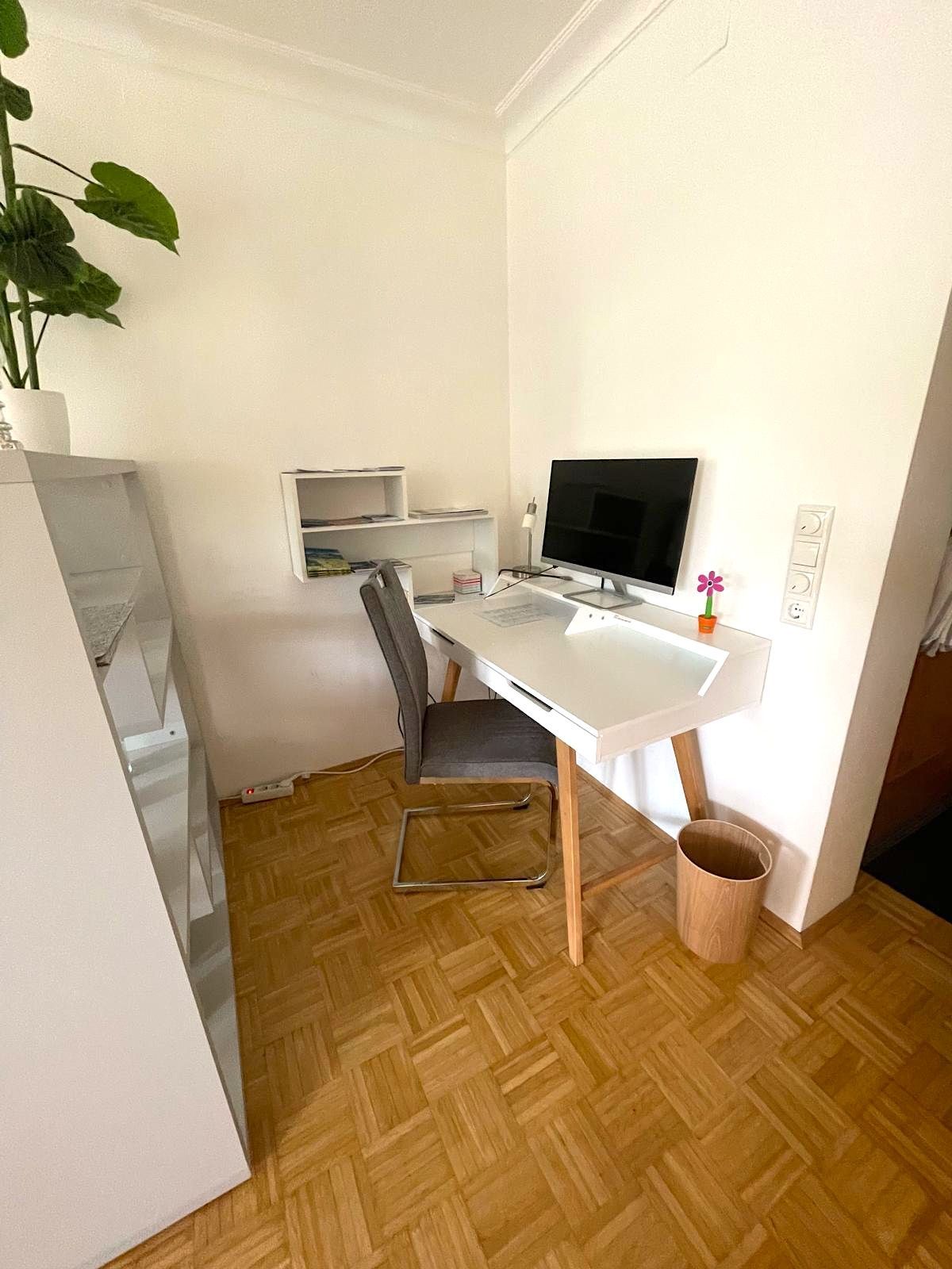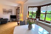 From the entrance area with cloakroom you can reach all the rooms in the flat. The spacious living and dining room is furnished with a comfortable living area (sofa bed for an additional person), a cosy reading corner and a separate desk area, ideal for concentrated work. The high-speed WiFi also enables use as a home office. From the living room, you can access the partially covered lounge terrace with a wonderful view of the greenery.