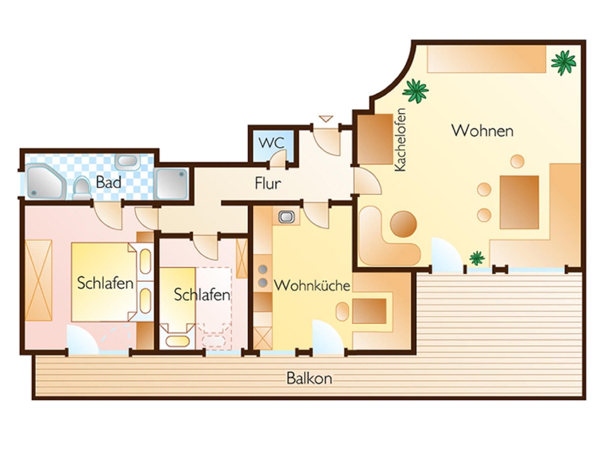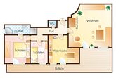 Komfortwohnung mit Südbalkon und eigener Terasse, 2 Schlafräume, große Küche, Wohnraum mit Kachelofen, Bad mit Wanne/Dusche und WC, sep. WC