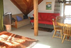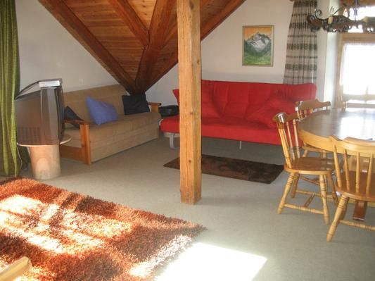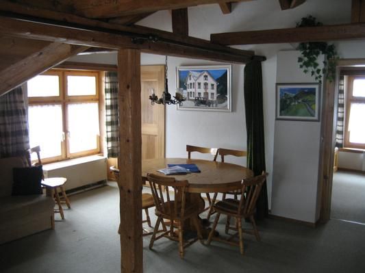 Sehr gemütliche rustikale Wohnung mit viel Charme, Dachwohnung mit schönem altem Gebälk,zentral elektrisch geheizte Räume,teils antike Möbel, separate Küche mit Keramikherd und Gechirrspülmaschine, Kaffeemaschine, separates Doppelzimmer mit direktem Zugang zum Badezimmer, Badezimmer (mit Bad,Dusche und WC) zugänglich separat vom Gang. Satelliten-TV, WLan-Internet-Anschluss. Endreinigung 2 Personen CHF: 100.00,4 Personen/4 Nächte CHF 120.00, 4 Personen/7 Nächte CHF 140.00.