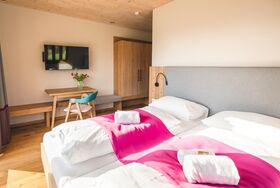 Dieses neue, komfortable Zimmer Bergblick ist eine Oase der Ruhe, in der Sie sich vom ersten Moment an wohlfühlen werden. Es wurde mit größter Sorgfalt und ausschließlich aus ausgewählten Naturmaterialien gestaltet, was sich in den edlen Holzböden und der hochwertigen Verarbeitung widerspiegelt.