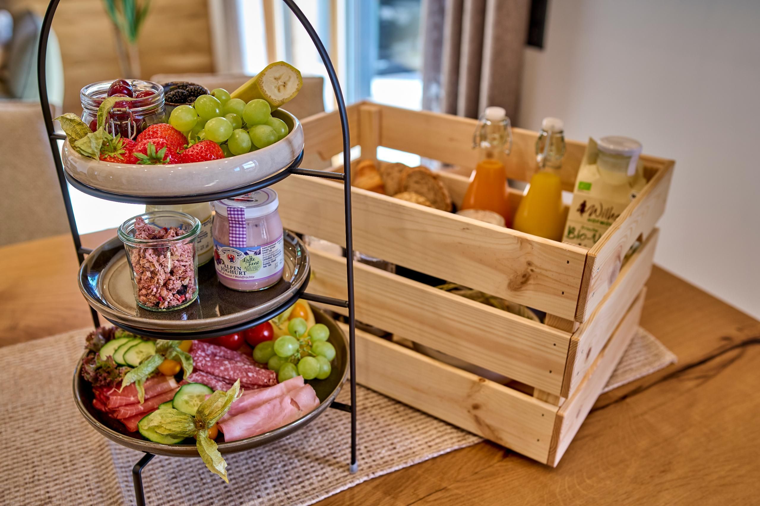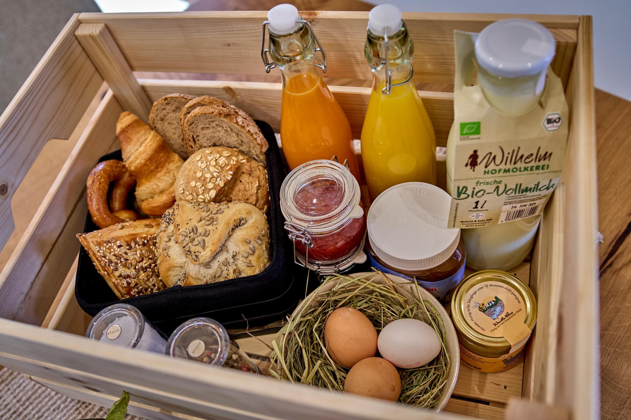 Frühstückskorb mit regionalen Spezialitäten und vielem mehr hinzugebucht werden.