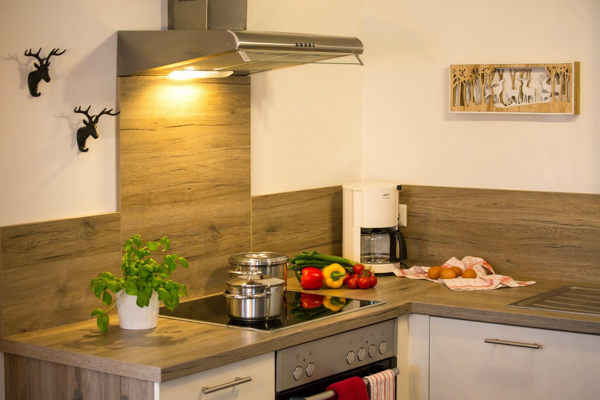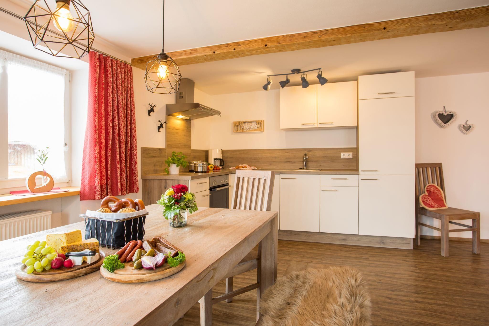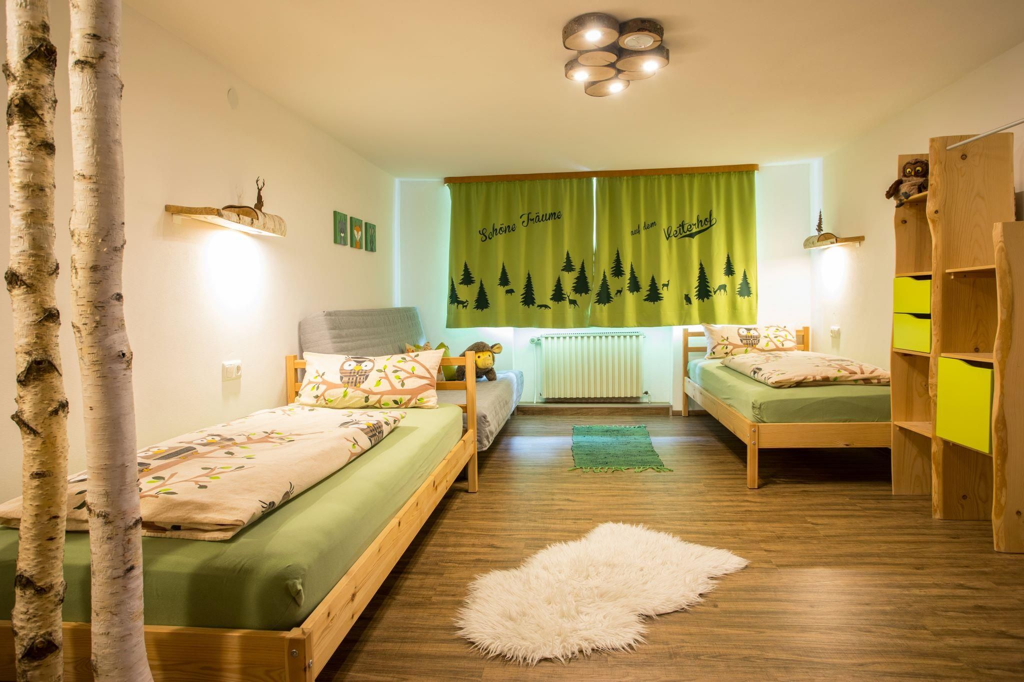 Unsere neu renovierte, helle und sonnige 3-Zimmer-Ferienwohnung Alpspitz (65 qm) ist bestens geeignet für 4 Personen. Es gibt zwei Schlafzimmer. Das Elternschlafzimmer mit Zirbenwand ist mit einem Doppelbett ausgestattet. Eine Liege oder ein Kinderbett kann noch hinzugestellt werden. Im großen Kinderschlafzimmer gibt es zwei Einzelbetten und eine Schlafcouch (140x200cm). Die gemütliche Wohnküche mit komplett ausgestatteter Küchenzeile (Spülmaschine, Kühlschrank, Backofen, Kaffeemaschine, Wasserkocher, Toaster, Eierkocher etc.), großer Essgruppe, Couch, Radio und Sat-TV lädt zum Verweilen ein. Das Badezimmer mit Dusche und WC rundet das Gesamtbild ab. WLAN, Parkplatz, Bettwäsche und Handtücher stehen Ihnen kostenfrei zur Verfügung.