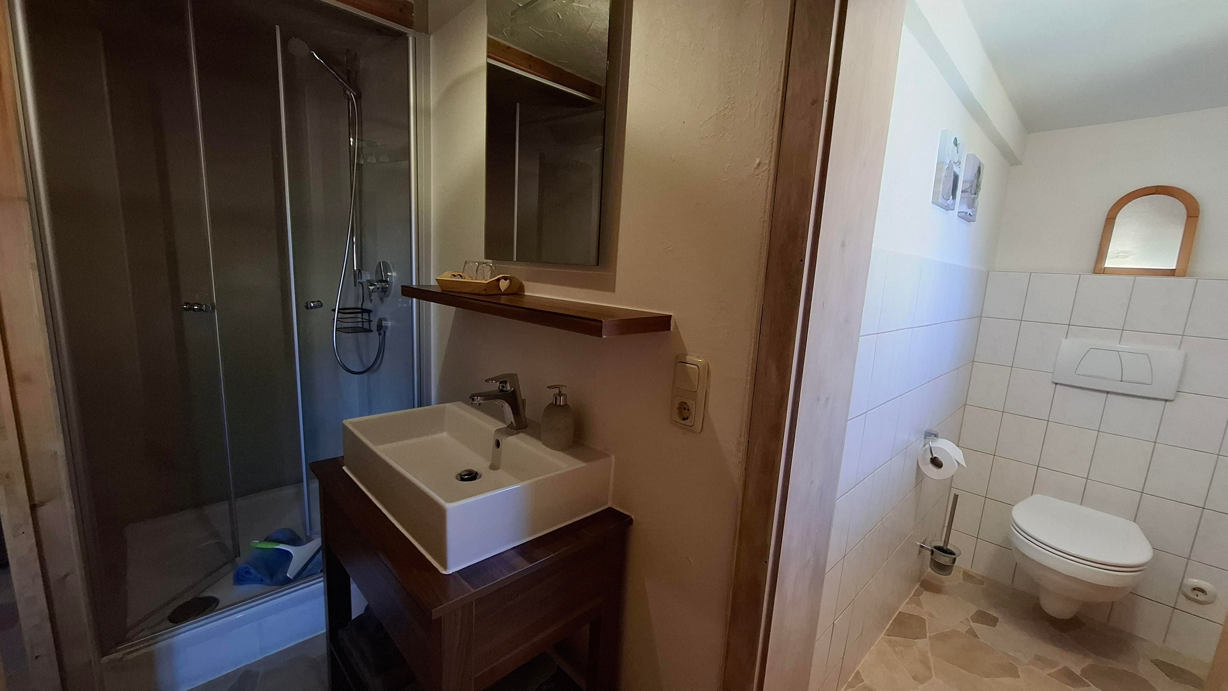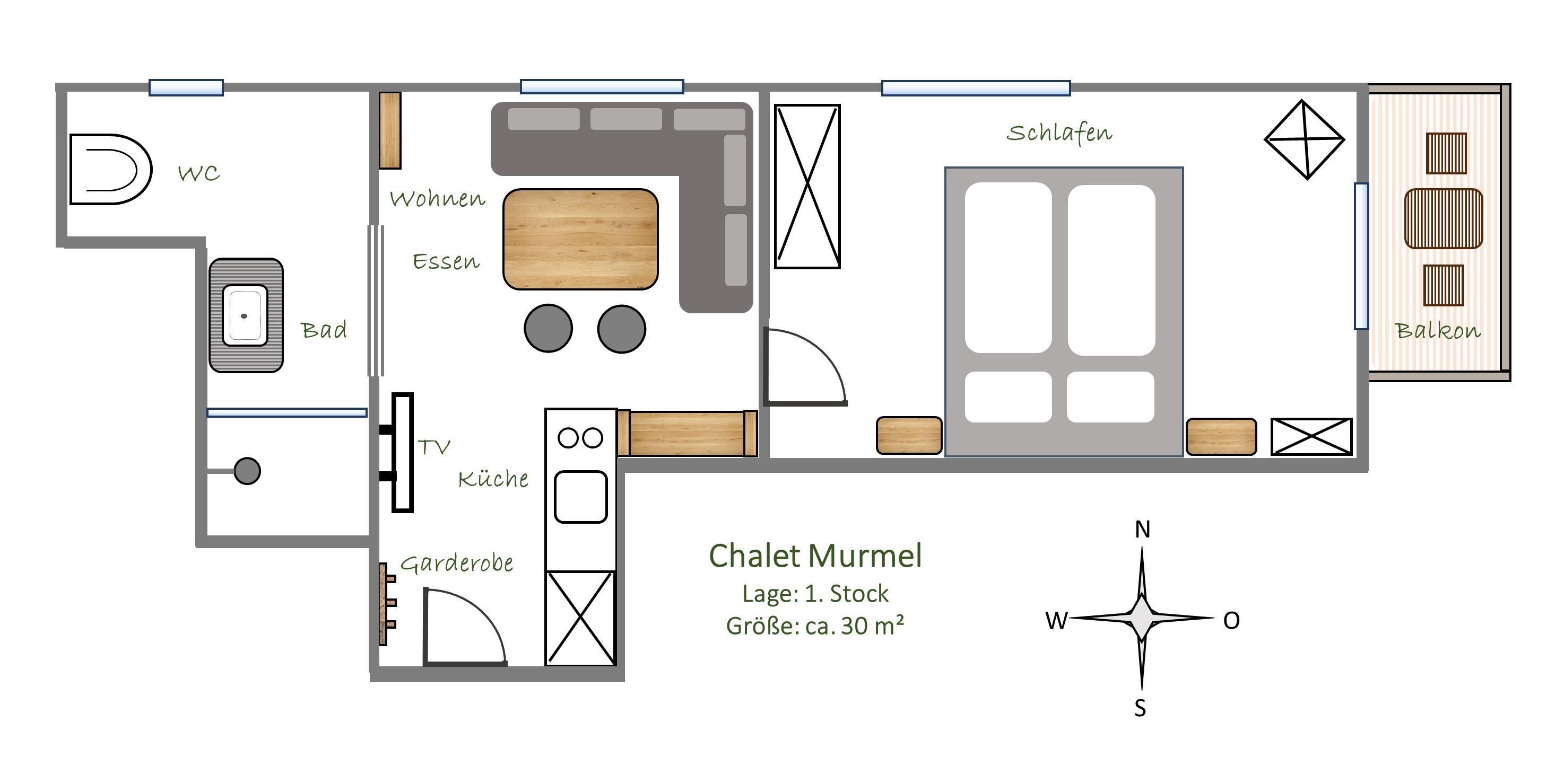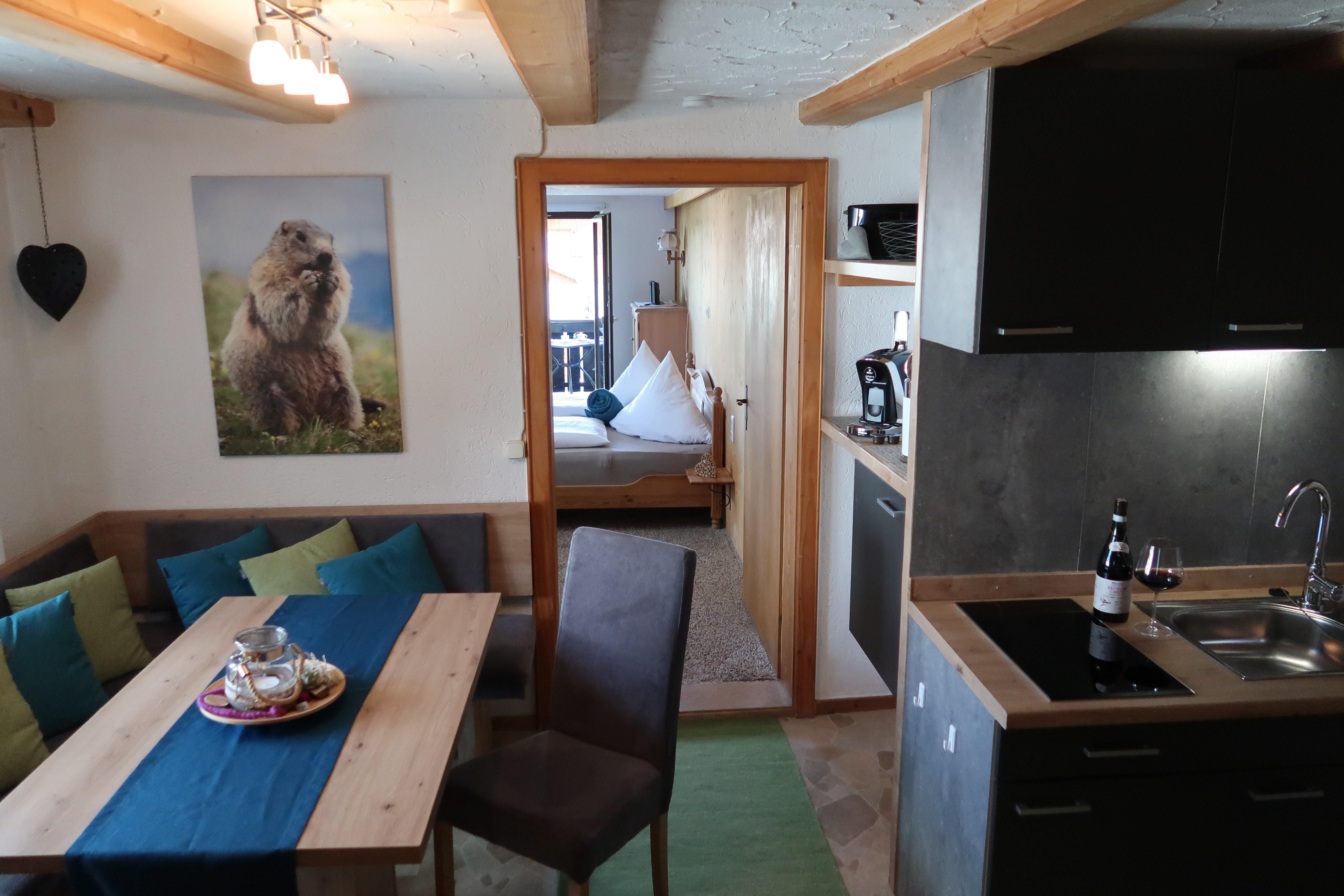 Das renovierte Chalet Murmel für 2 Personen befindet sich im 1.Stock des Altbaus und ist nach Nord-Ost ausgerichtet. Es besticht durch das geräumige Schlafzimmer mit privatem Balkon nach Ost-Süd gerichtet. Somit steht einem entspannten Frühstück in der Morgensonne mit Blick in die Berge nichts im Wege.