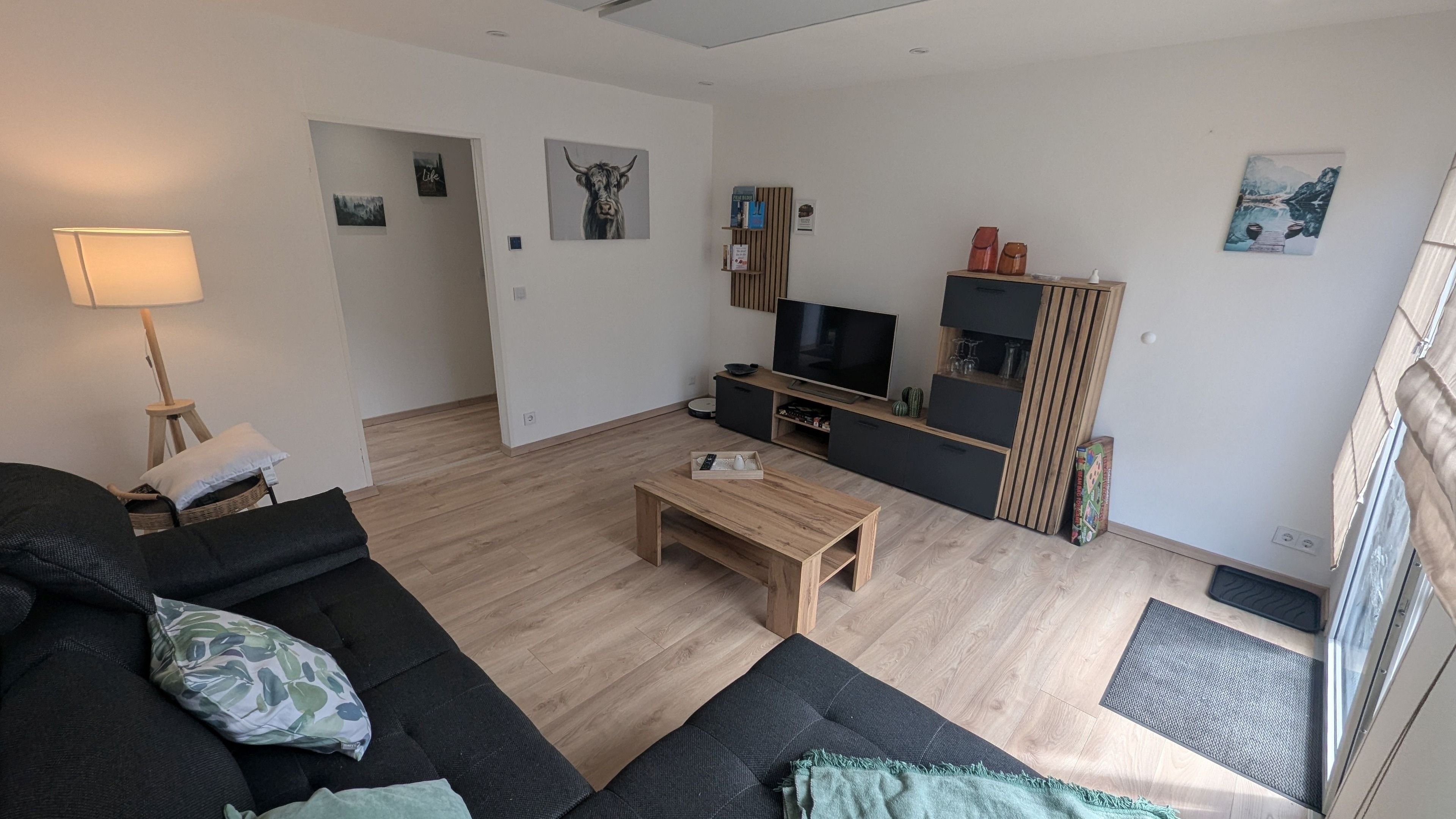 Ein Schlafzimmer + gemütliche Schlafcouch im Wohnbereich. Voll ausgestattete Küche mit Spülmaschine, modernes Bad mit großer Dusche und Waschtrockner, WLAN und TV – alles da für entspannte Urlaubstage.