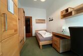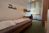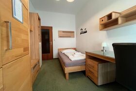 Ihr Einzelzimmer Nr. 011 ist ausgestattet mit einem Einzelbett, TV, WLAN, Duschbad/WC sowie einer Miniküche. Das Pensionszimmer befindet sich auf der Seite einer bverkehrsberuhigten Einbahstraße. Die schalldichten Fenster sorgen für eine angenehme Nachtruhe.