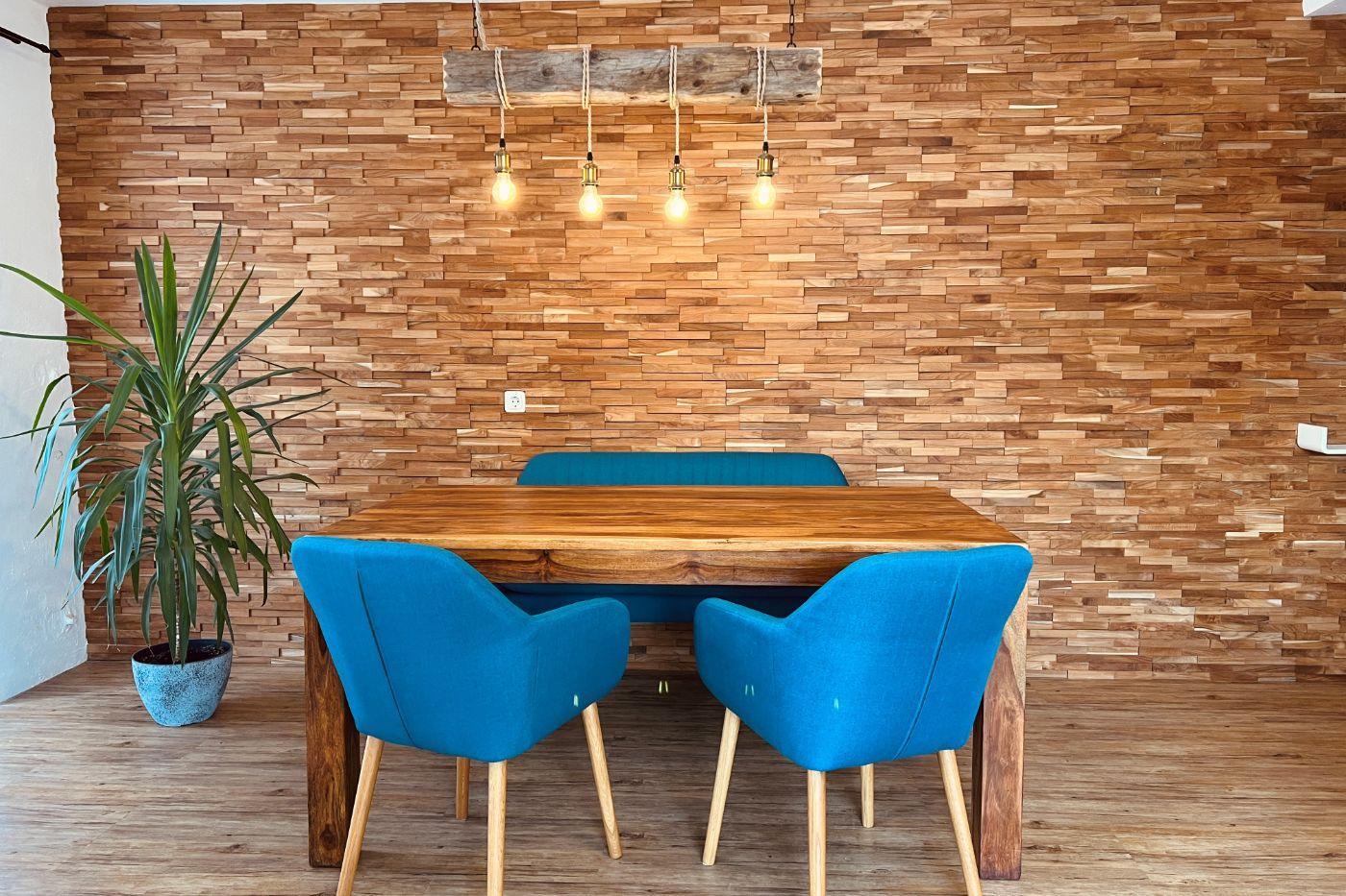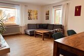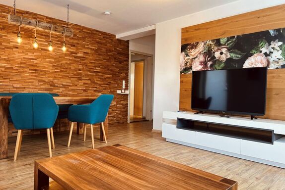 Suite mit Badewanne und Dusche/WC, Fön, Wohnzimmer mit gemütlicher, großer Couch, Esstisch mit Bank und Stühlen, Safe