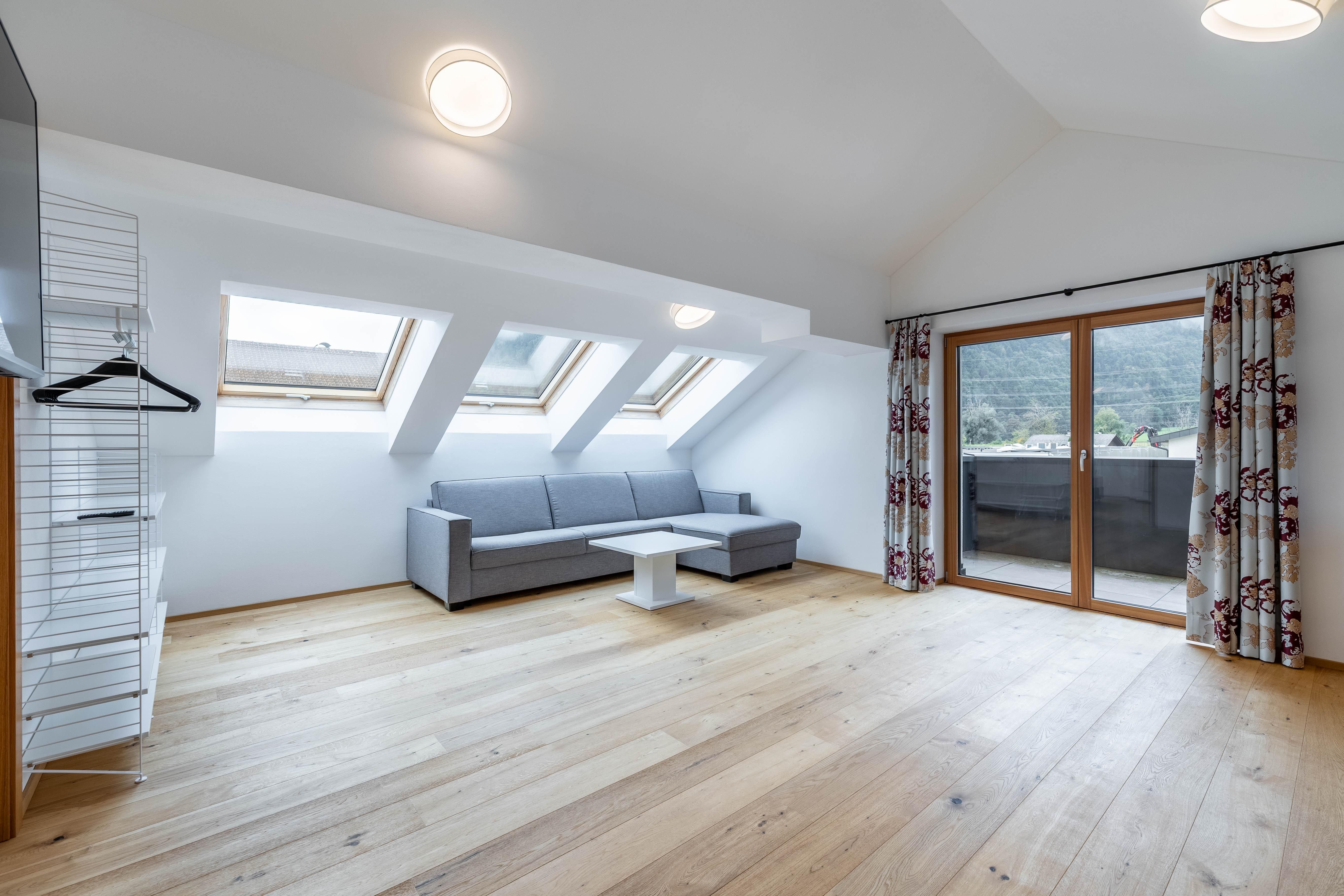 Die sonnige Luxuswohnung im Dachgeschoss bietet auf 51 m² eine moderne Wohnküche, eine Schlafcouch für zwei Personen, ein separates Schlafzimmer mit Doppelbett und ein Badezimmer. Zusätzlich steht ein 6 m² großer Südbalkon zur Verfügung. Die Wohnung ist modern eingerichtet und ideal für einen komfortablen Aufenthalt.