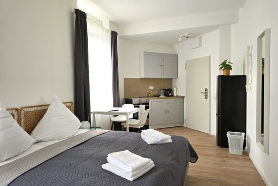 Aparthotel im Zentrum von Schwandorf. Unsere modernen und gemütlichen Studio-Apartments für 1-2 Personen bieten Boxspringbetten, eine voll ausgestattete Küchenzeile, kostenfreies WLAN, einen 43 Zoll Smart-TV und ein En Suite Bad. Die dort vorhandene große Dusche können Sie mit unseren hochwertigen Pflegeprodukten genießen.