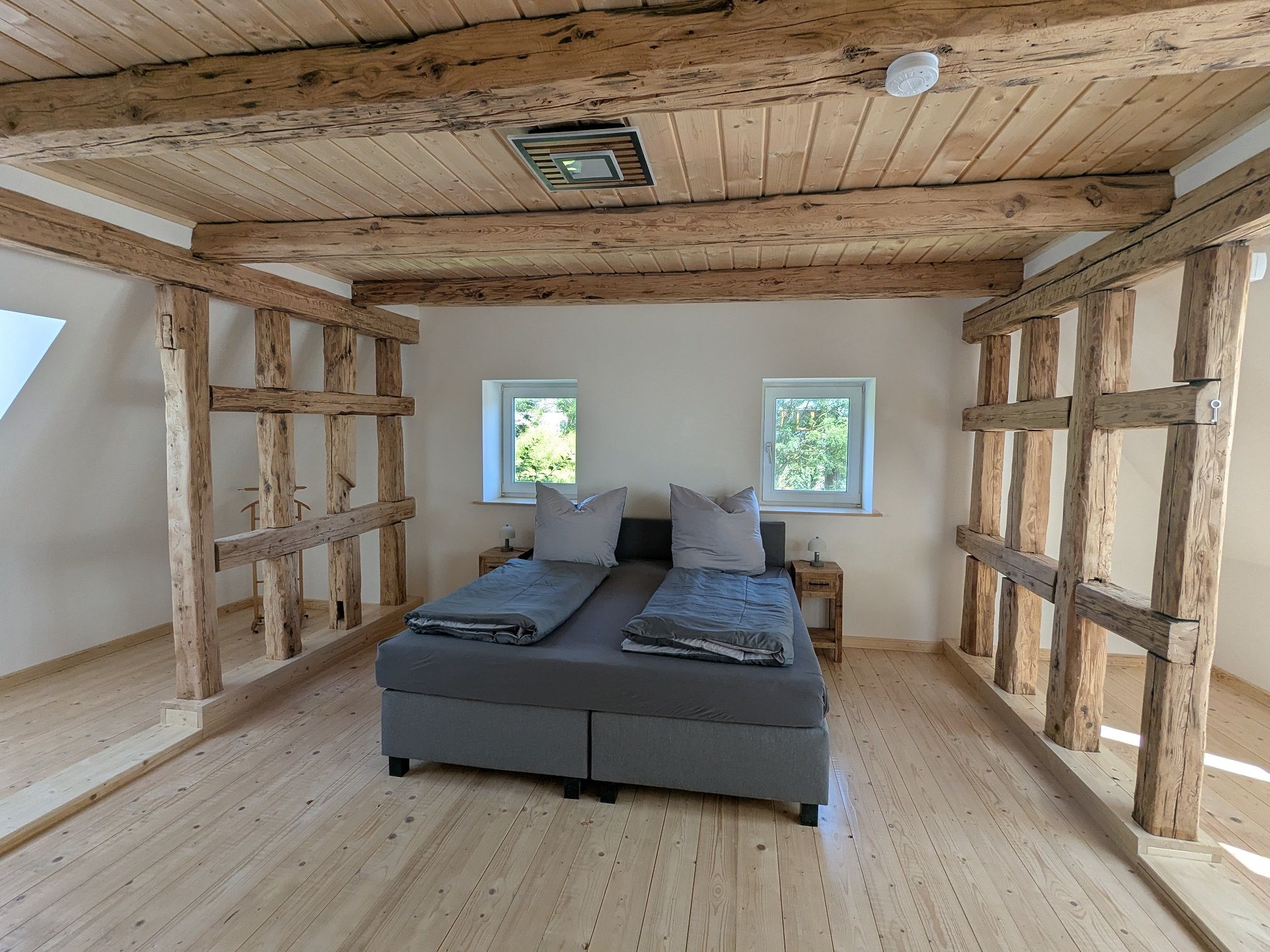 In der Ferienwohnung Funkenstube stehen auf 90 qm ein Schlafzimmer mit Ehebette, sowie drei Schlafsofas im Wohnzimmer und Nebenzimmer zur Verfügung. Im Wohnzimmer befindet sich ein Fernseher für gemütliche Filmabende, die Fußbodenheizung sorgt für ein angenehmes Raumklima, der Schwedenofen ergänzt die gemütliche Atmosphäre. Das Badezimmer verfügt über eine Walk-In-Dusche. Zusätzlich steht ein weiteres separates WC zur Verfügung. Wir leben die Energiewende: Auf dem Parkplatz steht eine Ladesäule für Ihr E-Auto bereit!