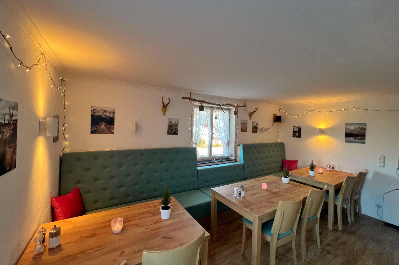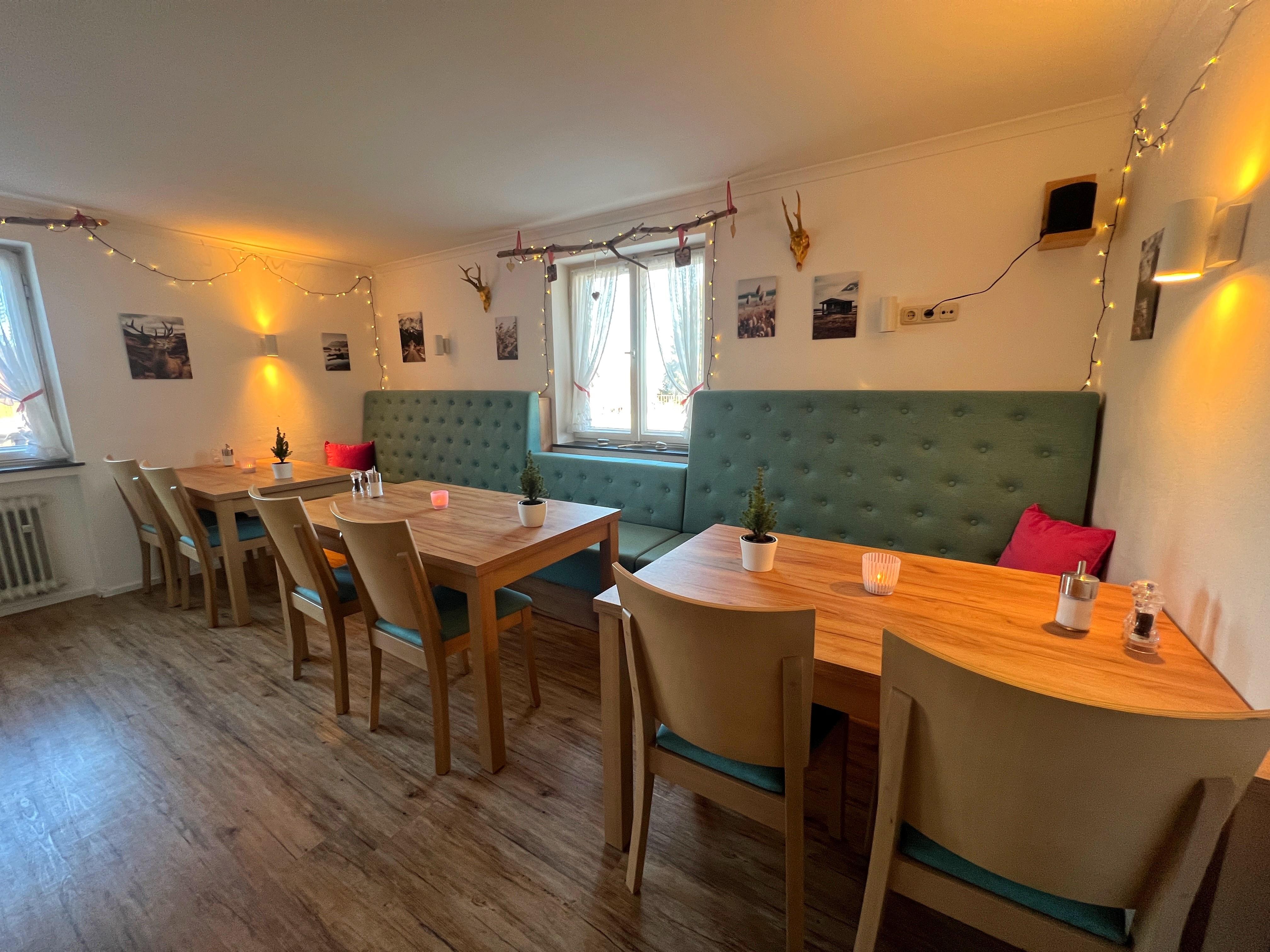 In unserem Restaurant gibt es zurzeit wegen Personalengpässen leider nur mittwochs Pizza, Flammkuchen und verschiedene Salate aber Fußläufig in ca. 8 Minuten haben wir die Guggenberg Alm, diese bietet eine große Auswahl an bayrischen, regionalen, vegetarischen und Saisonalen Speisen. Mit dem Auto sind auch einige Restaurants in 3-5 Minuten erreichbar.