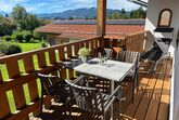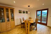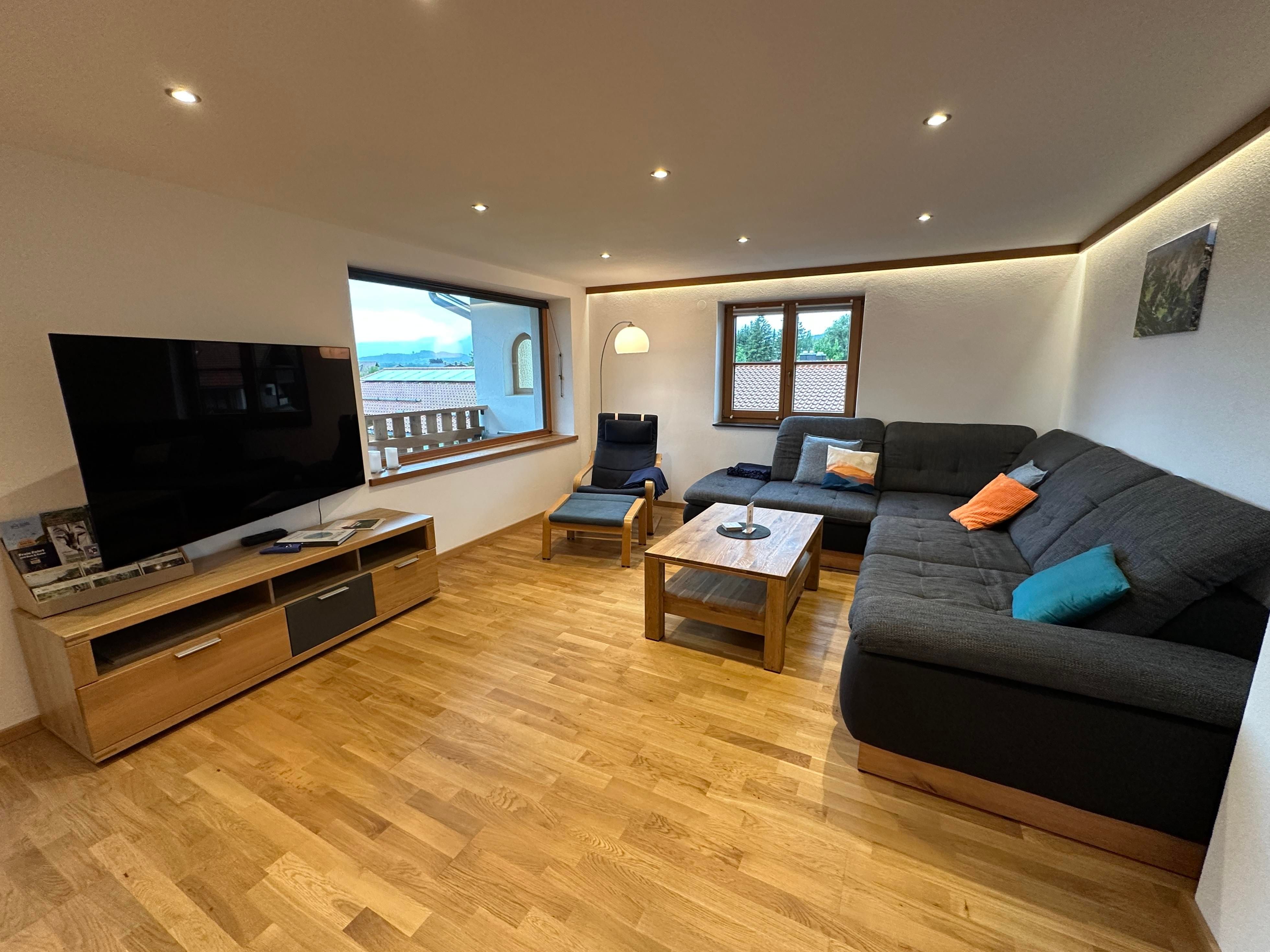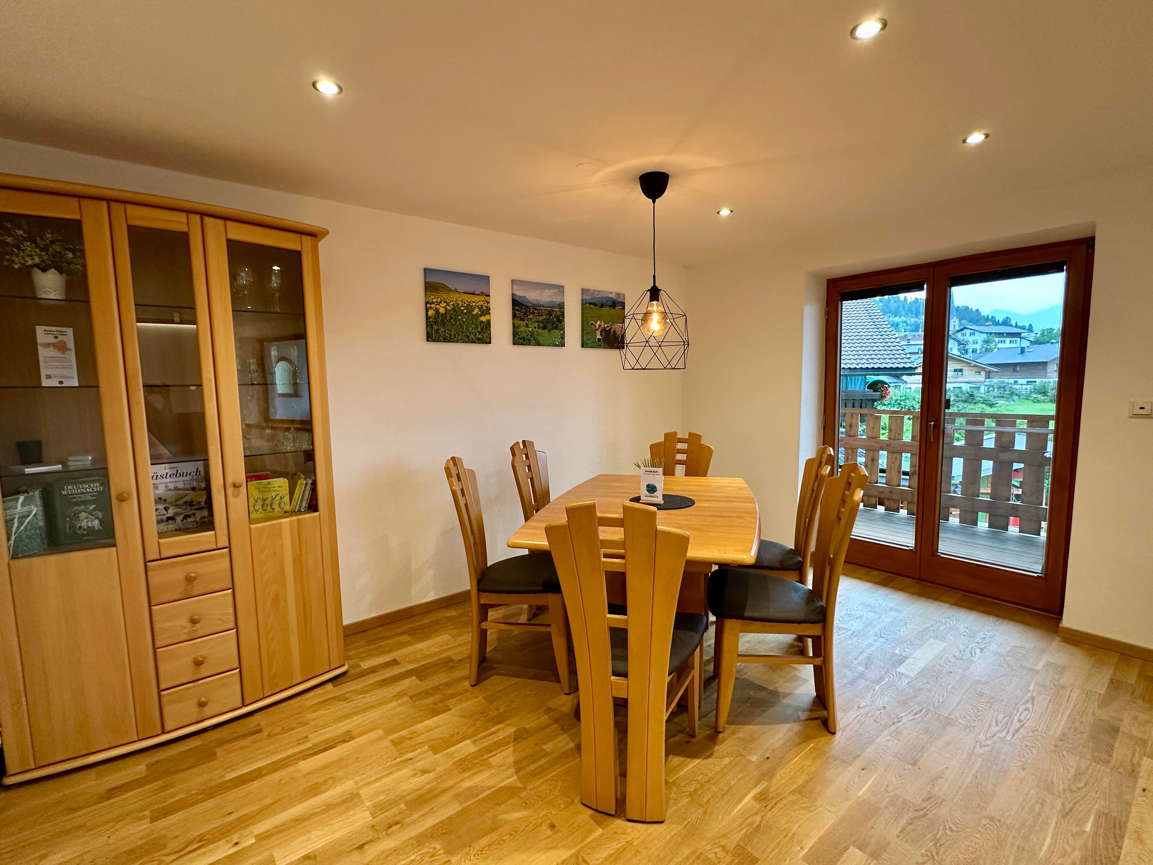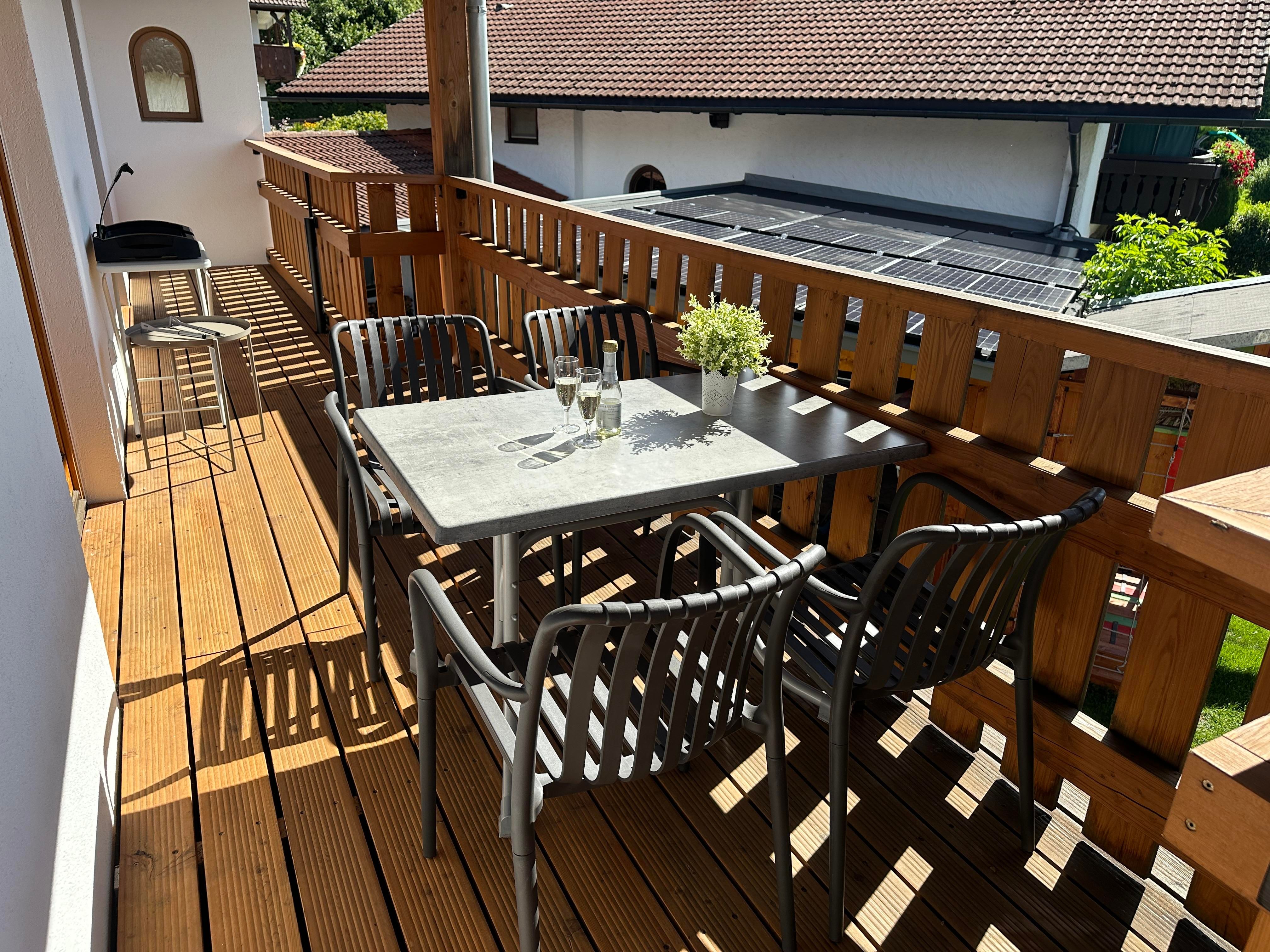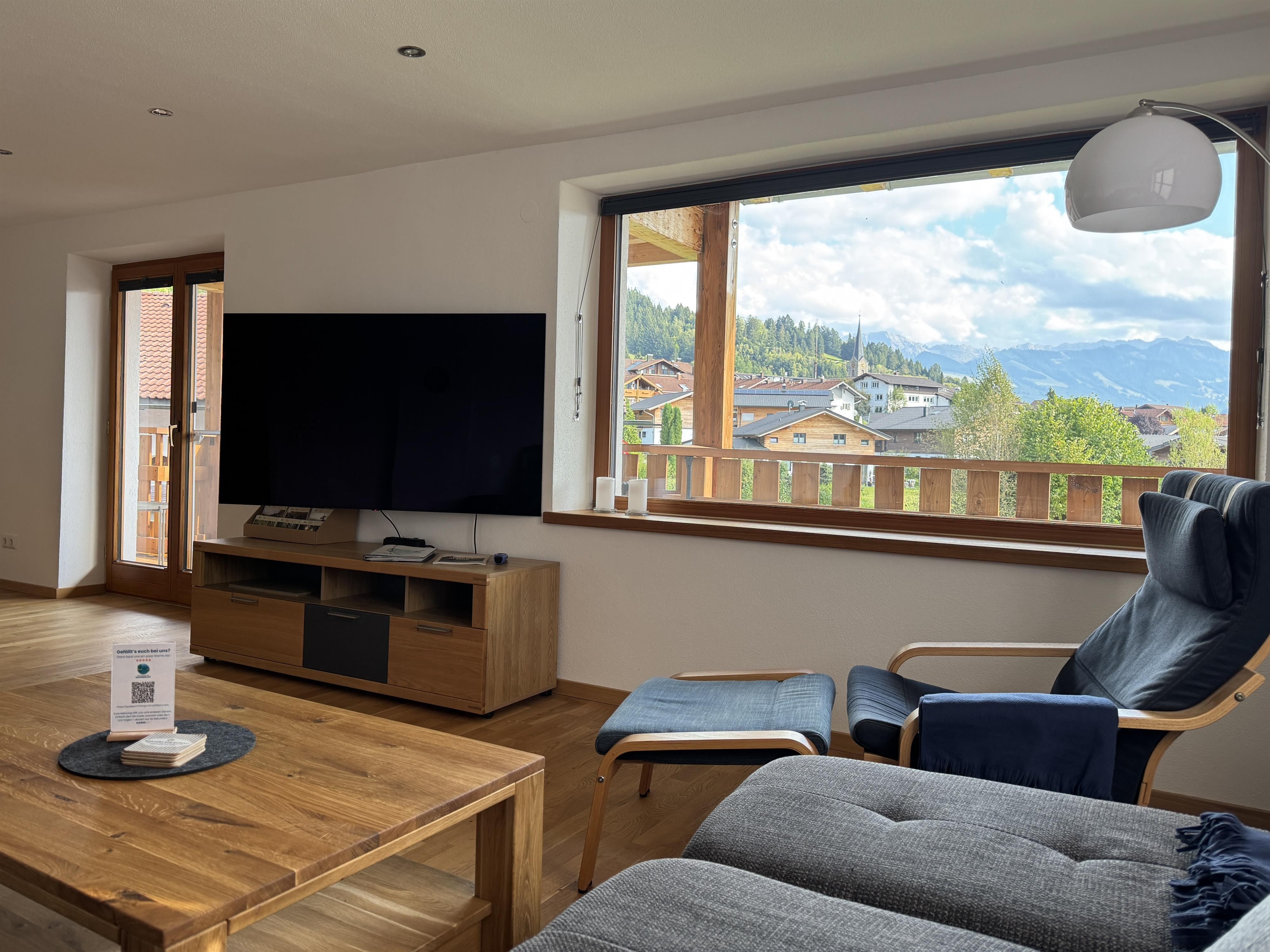 Im geräumigen Wohnzimmer findet ihr einen großen Esstisch, eine gemütliche Couch und einen Smart-TV. Flyer und Infomaterial zu Wanderungen, Radtouren, Restaurants und Erlebnissen in der Region stellen wir euch hier auch zur Verfügung. Von hier gelangt ihr auch auf den Balkon mit Essbereich, Liege und Elektrogrill.