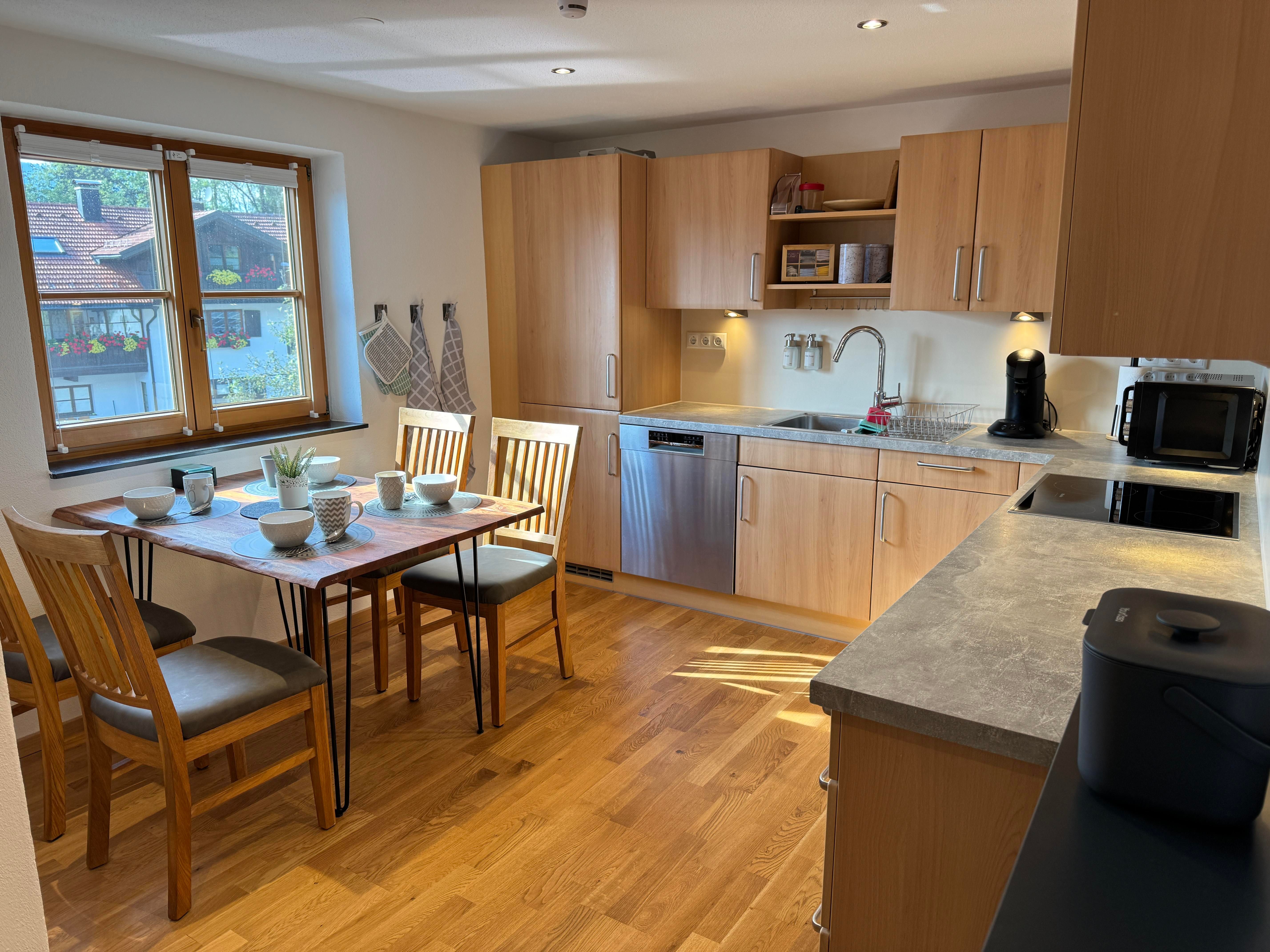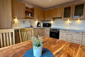 Zudem bieten wir euch eine voll ausgestatte Küche mit Herd, Backofen, Spülmaschine, Kühlschrank, Gefrierschrank, Mikrowelle, Wasserkocher, Toaster, Eierkocher, Senseo-Kaffeemaschine und Filterkaffeemaschine, allen möglichen Kochutensilien und Geschirr/Gläser, Müllbeutel, Putzlappen, Zewarolle, etc. Zum Start erhaltet ihr auch etwas Kaffee, Tee, Salz, Pfeffer, Essig und Öl. Ein kleiner Essbereich rundet die Küche ab.