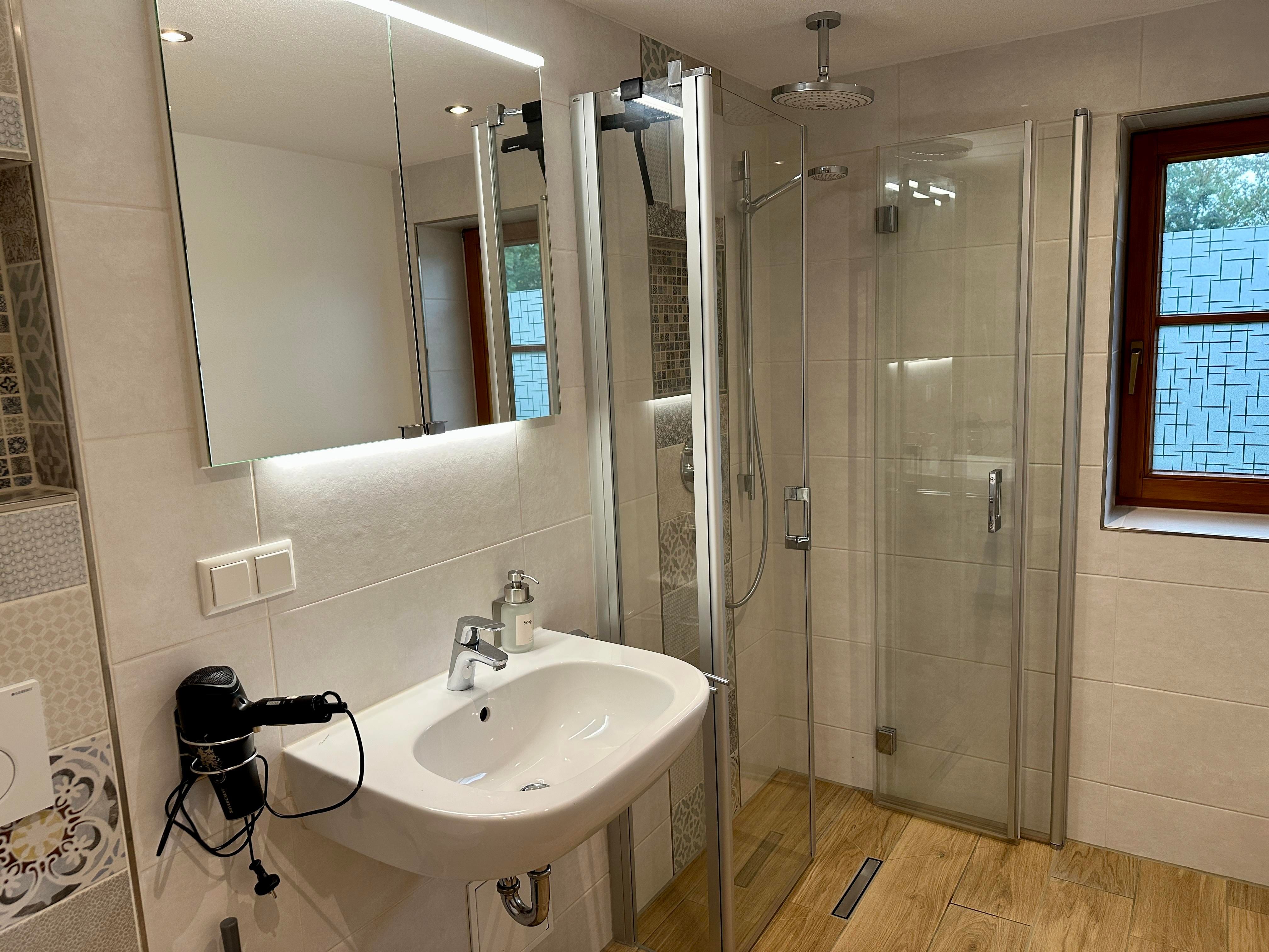 • Bad mit Toilette, Waschbecken und begehbarer Dusche