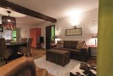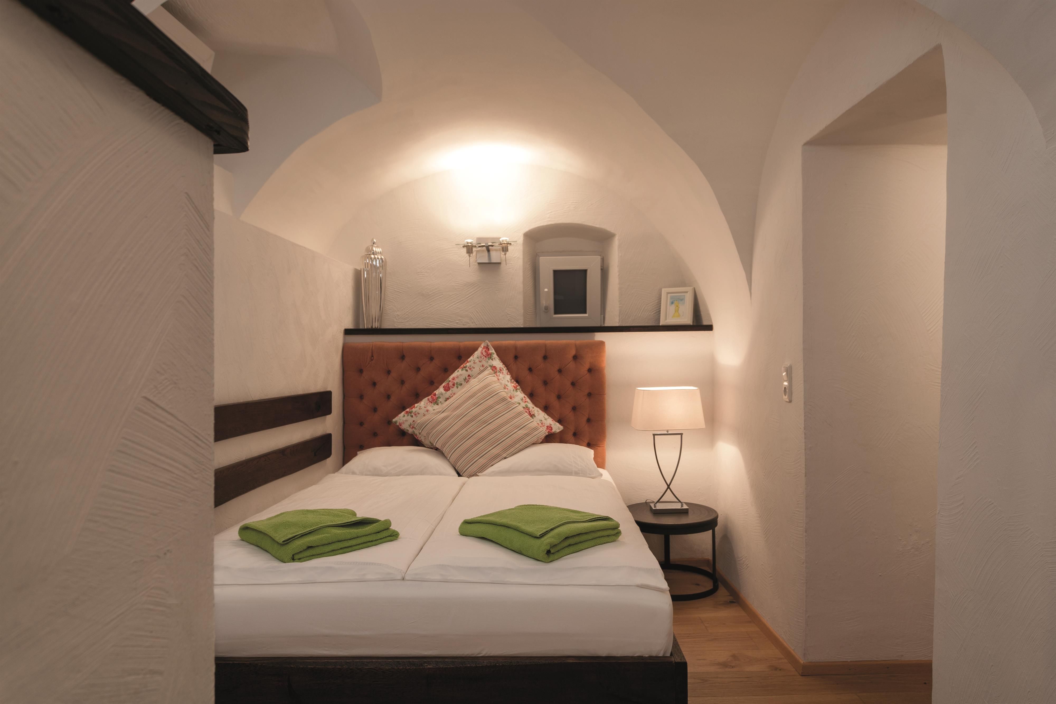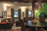 Apartment 1 im ersten Stock bietet auf 45 m² Platz für bis zu vier Personen. Es verfügt über ein Schlafzimmer mit Doppelbett sowie ein Schlafsofa im Wohnbereich. Eine Küchenzeile und ein Essbereich sind ebenfalls vorhanden, und die Fenster bieten Blick auf die alten Marktstraßen von St. Wolfgang. Das eigene Badezimmer ist mit Dusche, Waschbecken und WC ausgestattet. Ein besonderes Highlight ist die Decke mit freiliegenden Holzbalken aus dem Jahr 1416.