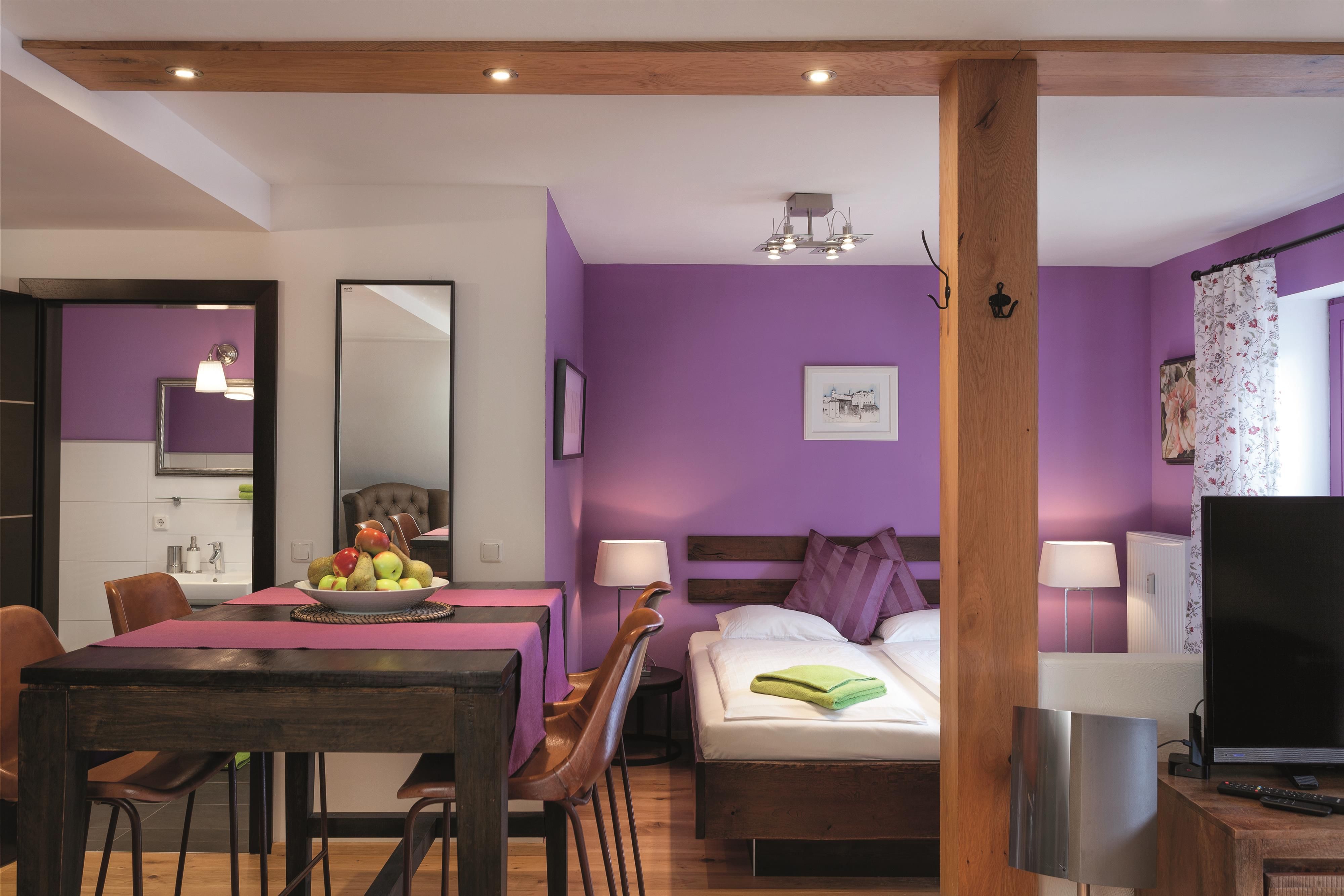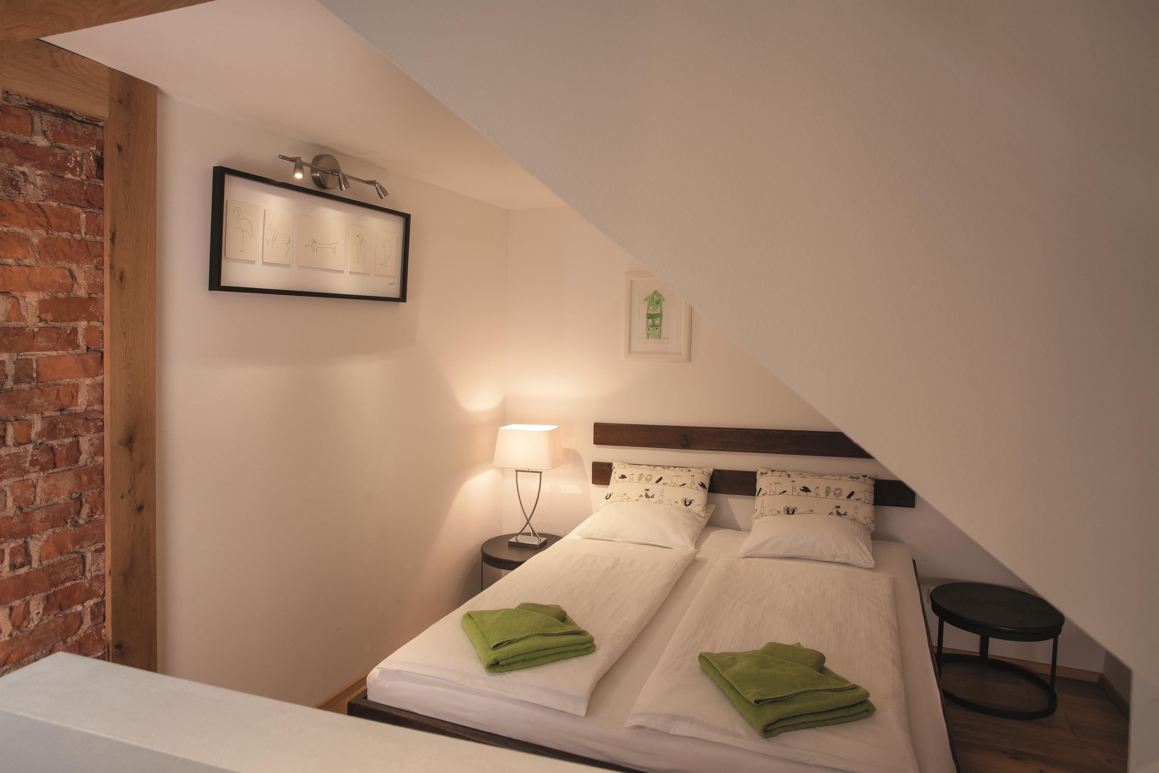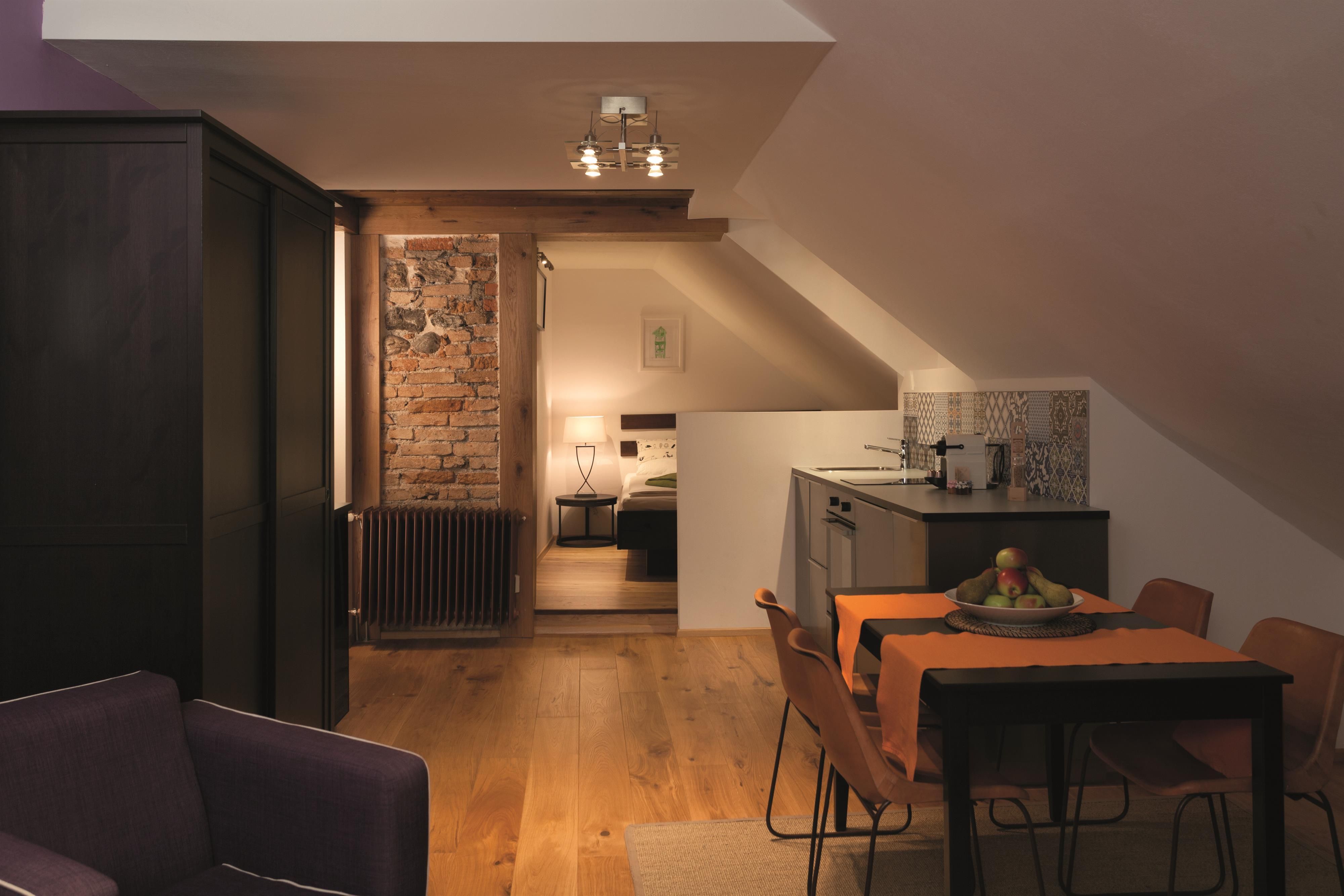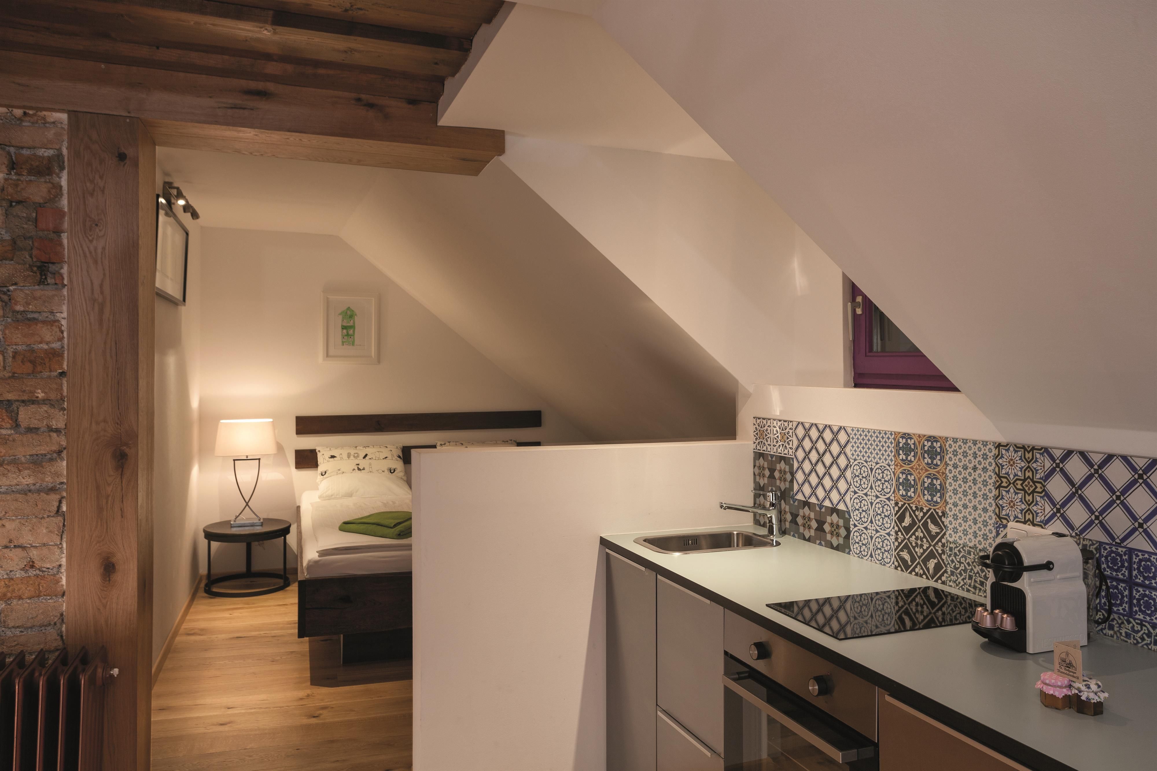 Im 3. Stock bietet das Studio-Apartment auf 35 m² Platz für bis zu vier Personen. Es verfügt über ein Doppelbett und ein Schlafsofa sowie eine kleine Küchenzeile und einen Essbereich. Der Balkon bietet Aussicht auf die Altstadt. Außerdem gehört ein privates Badezimmer zur Ausstattung.