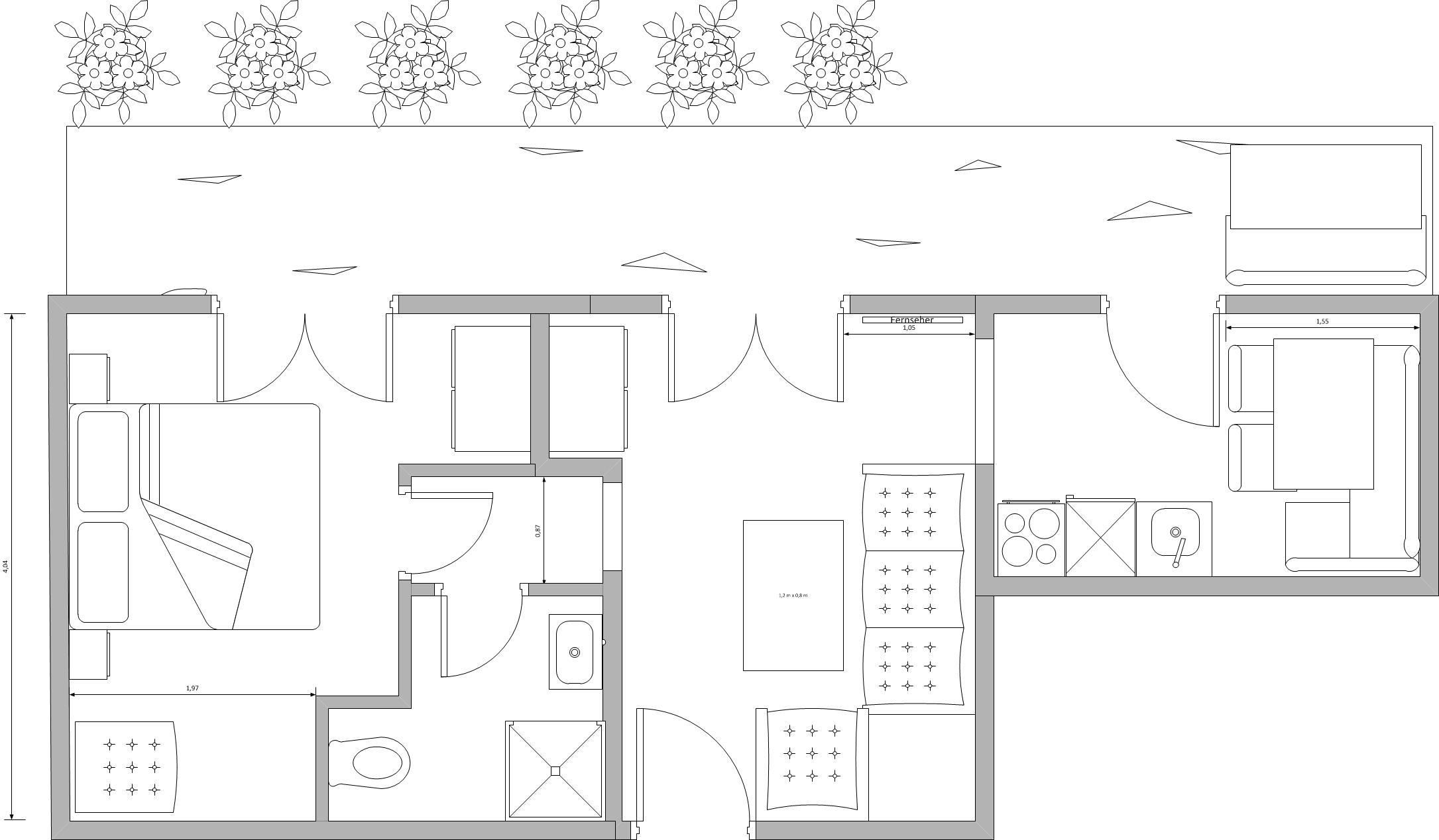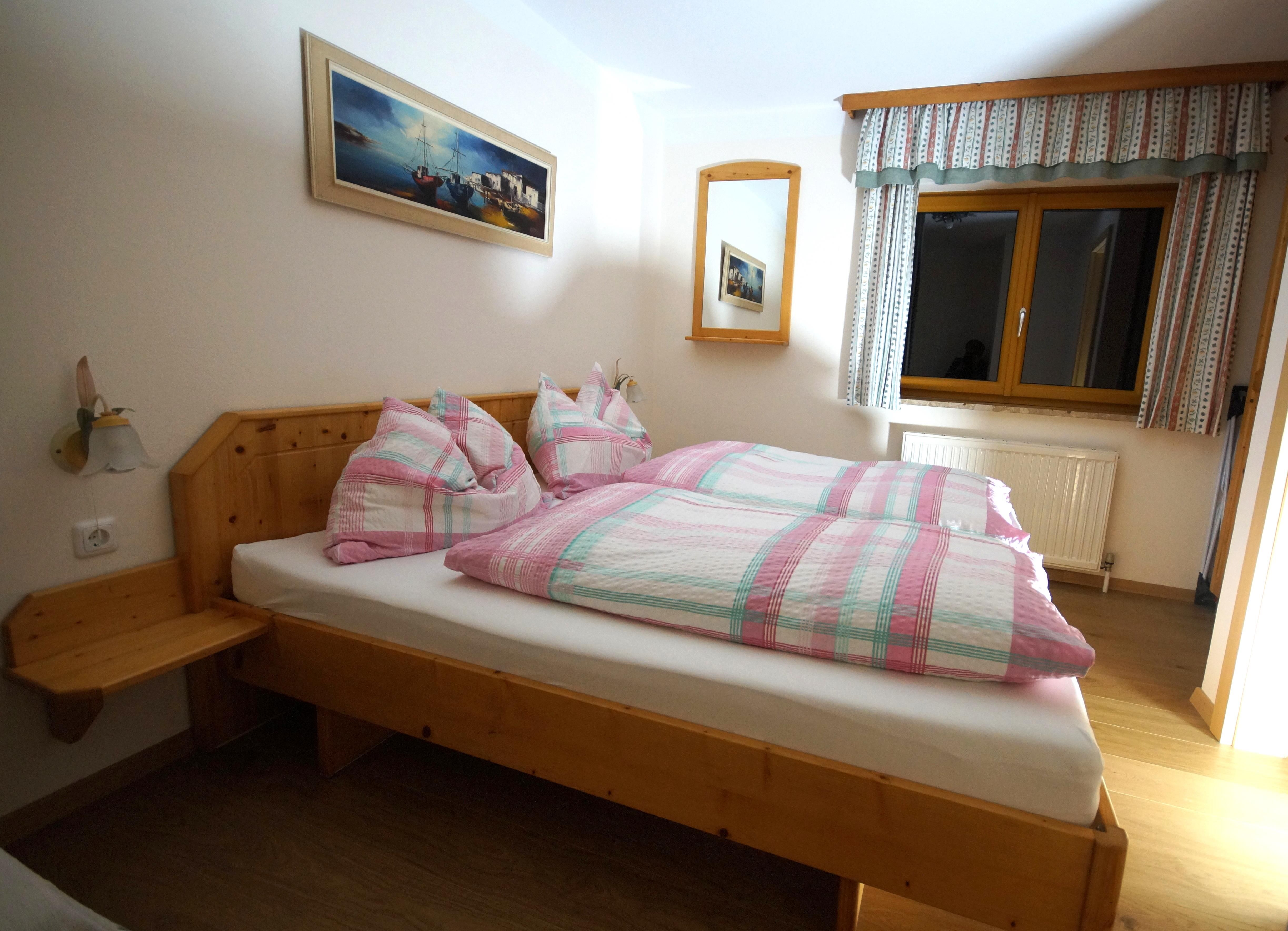 2 getrennte Schlafräume, ein Schlafzimmer mit Doppelbett und ausziehbarem Zusatzbett, ein Wohnschlafraum mit grosser, ausziehbarer Doppelbettcouch (1,75x2,00m) und offener Zugang zur Ess-Küche, Bad mit Dusche u. WC.