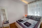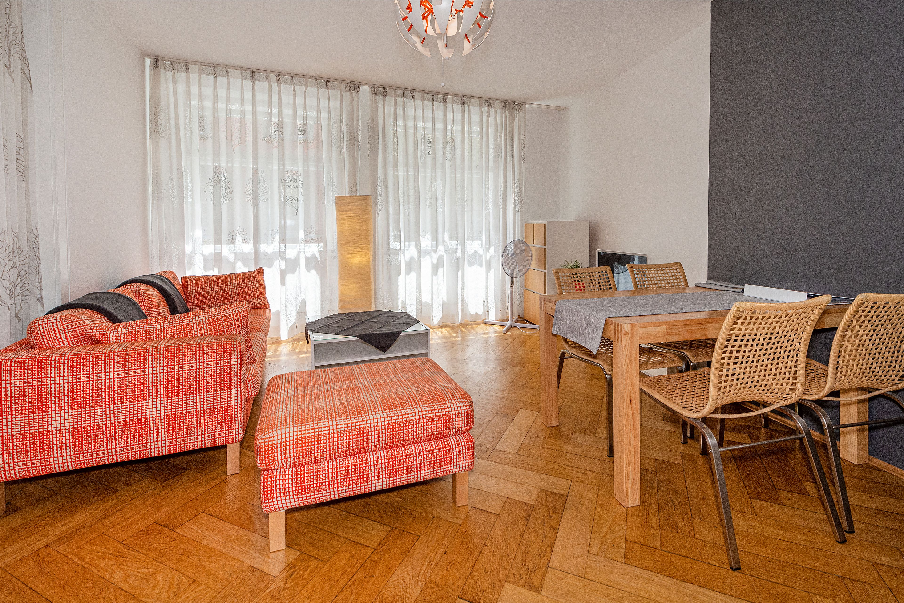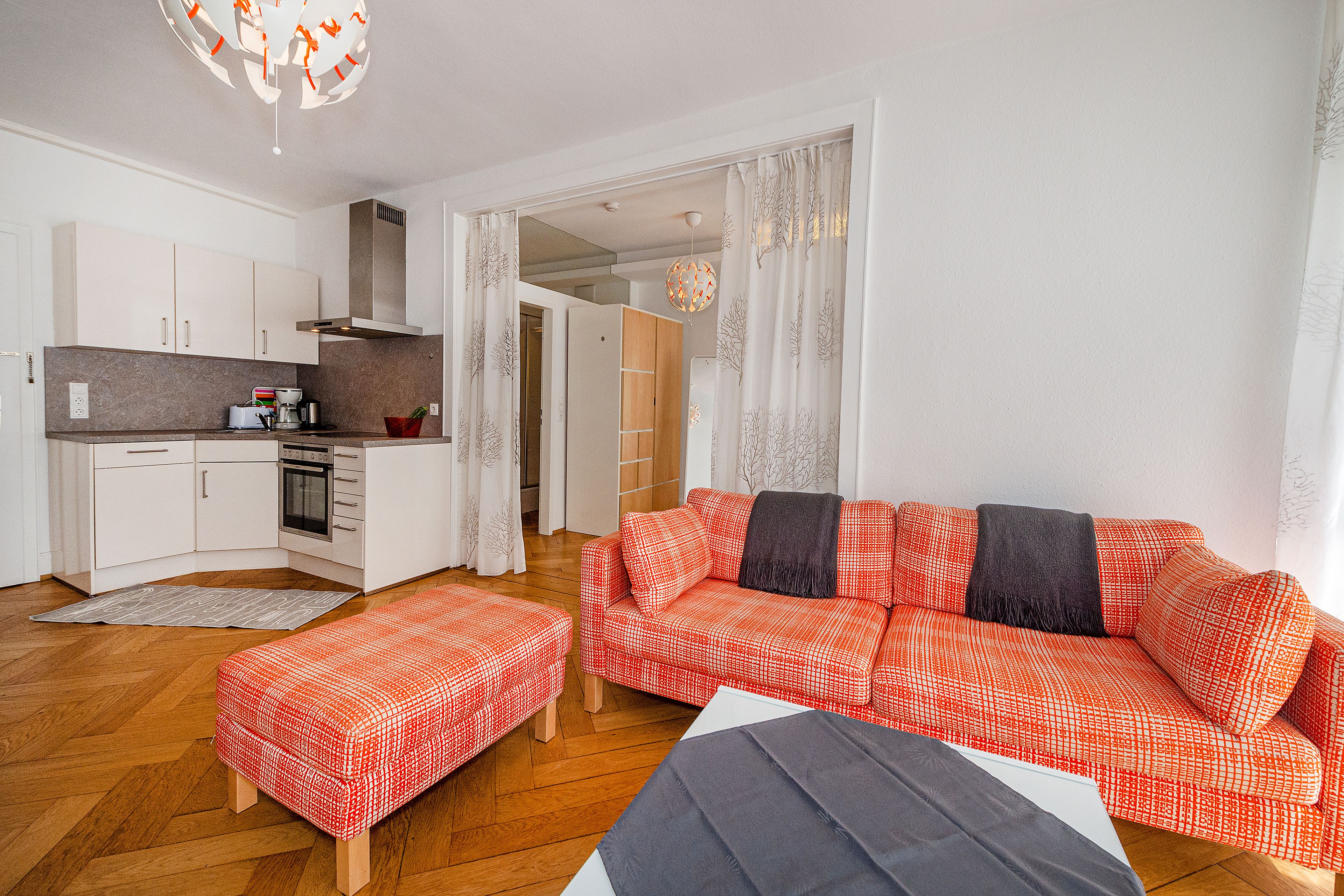 Die beiden Räume sind durch einen Vorhang unterteilt, was tagsüber für optische Großzügigkeit sorgt und durch die hohen Decken noch betont wird.