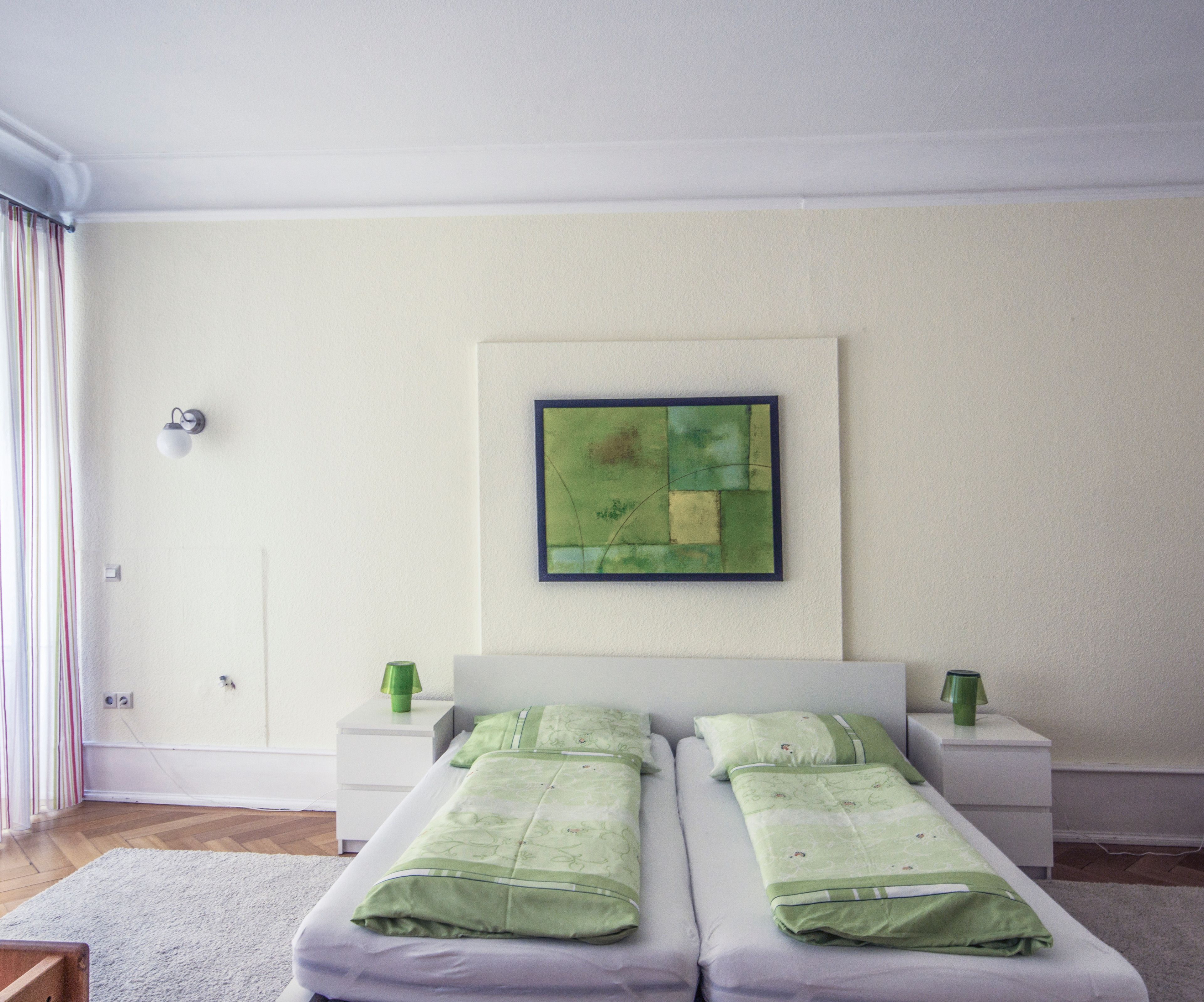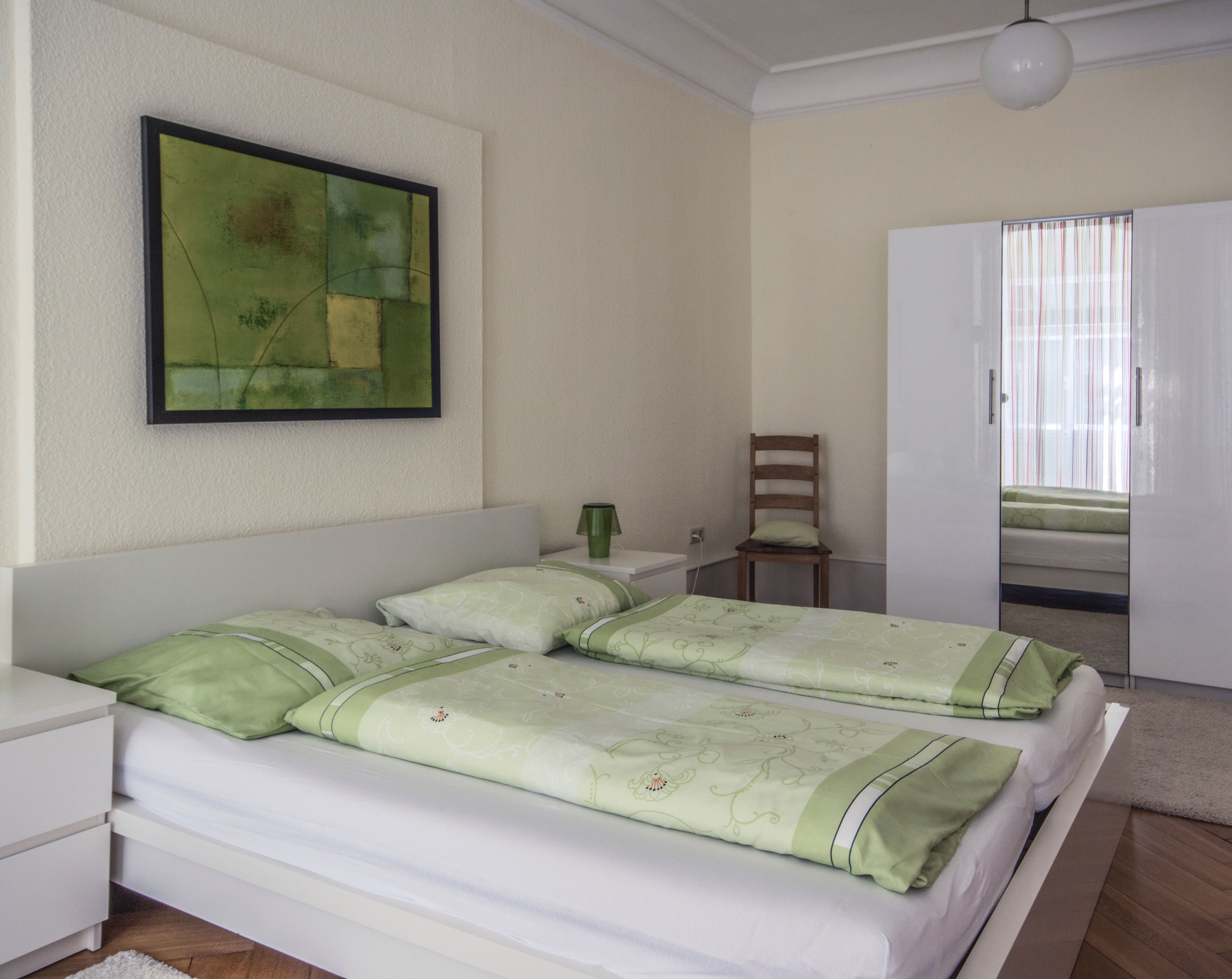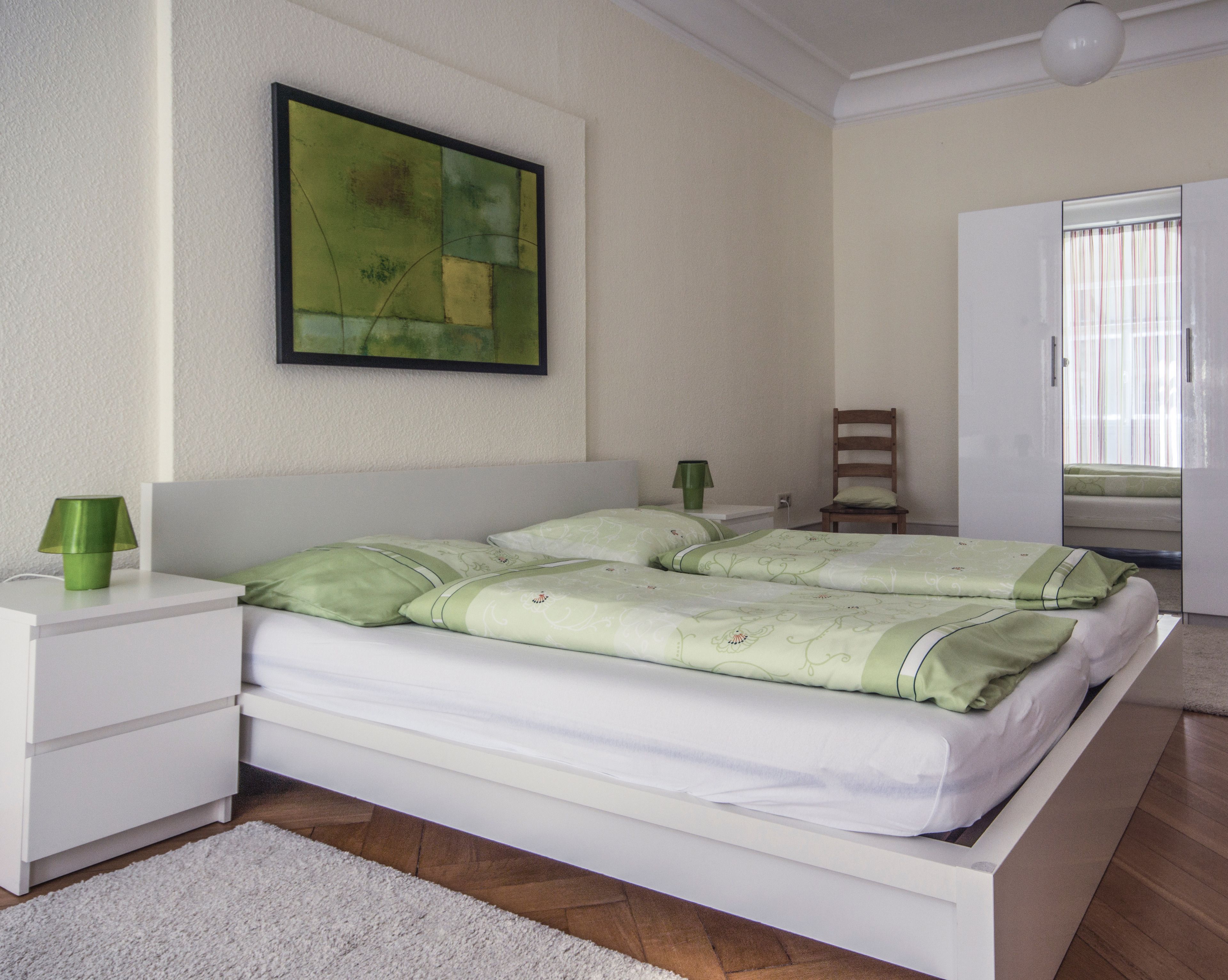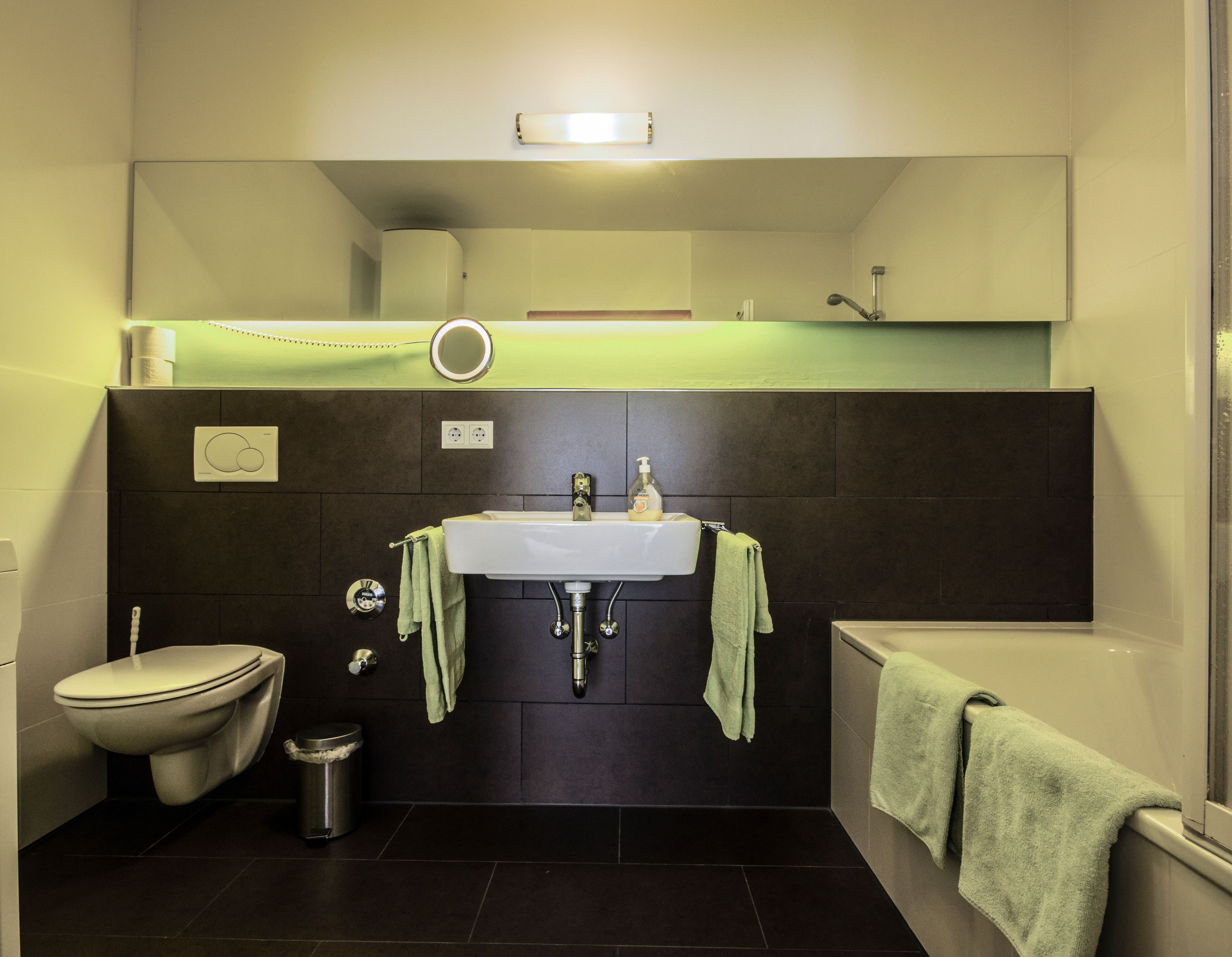 Im Privatbereich erwarten Sie ein wohldimensioniertes Schlafzimmer mit Doppelbett sowie ein modernes Wohlfühlbad mit Duschwanne und Waschmaschine.