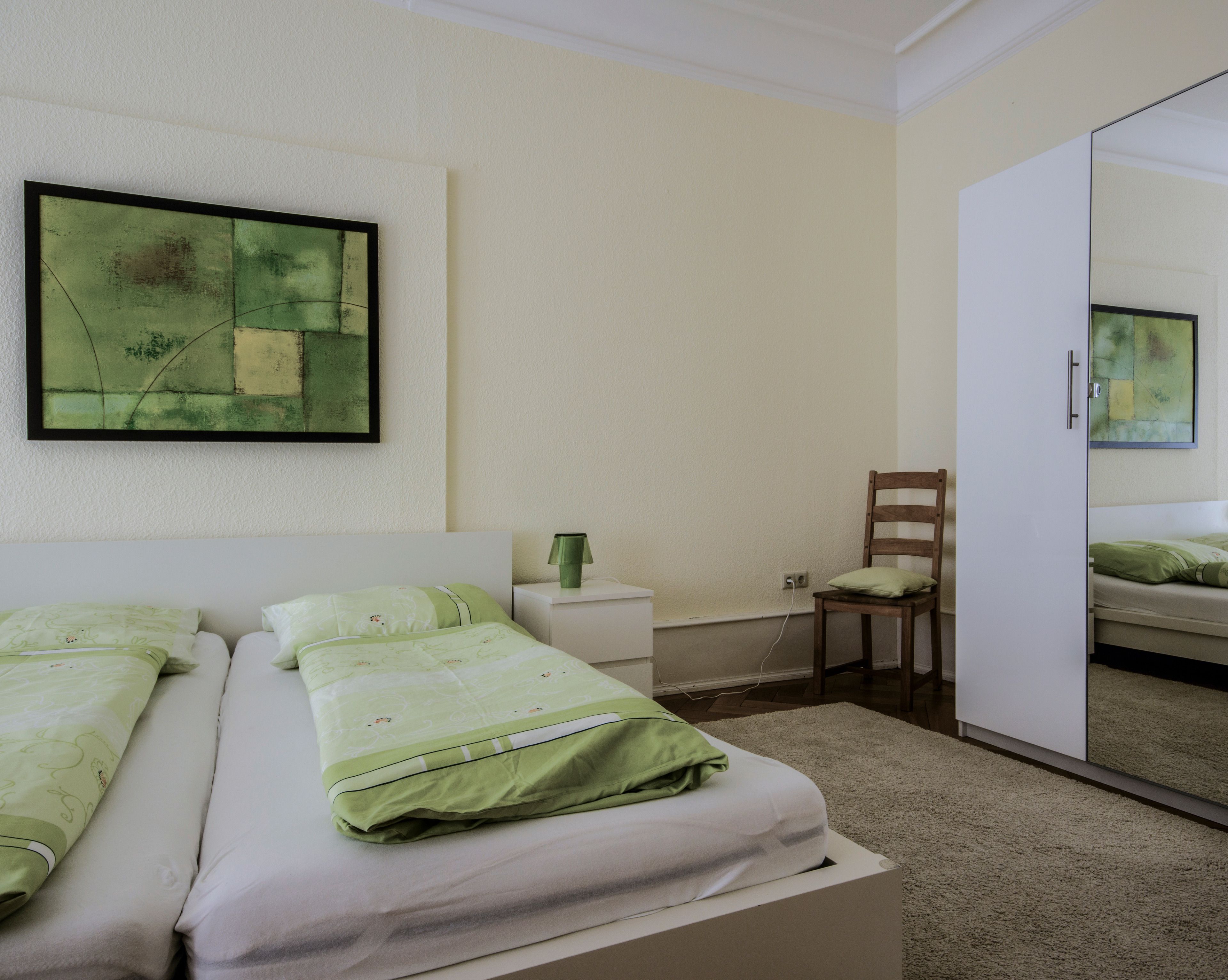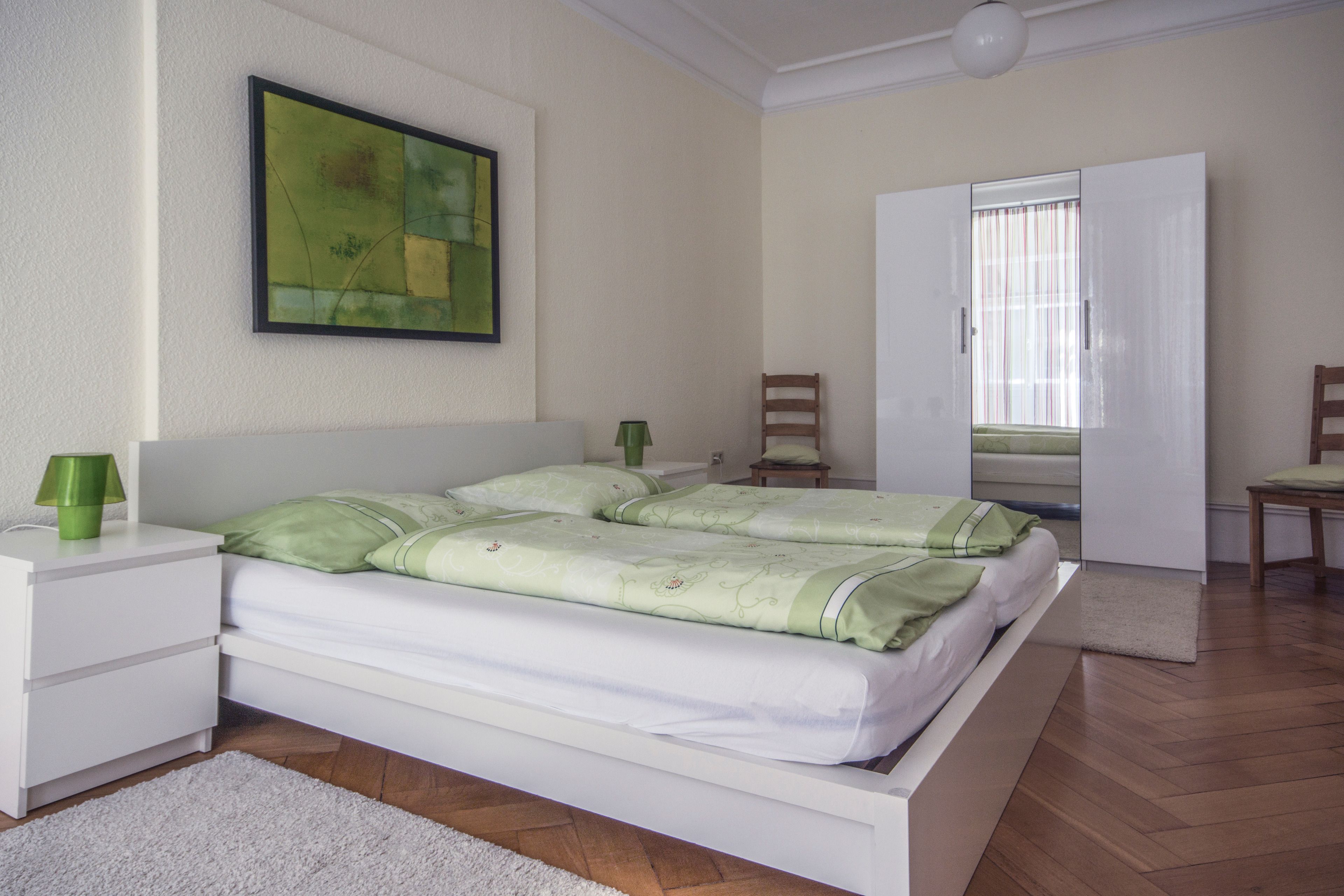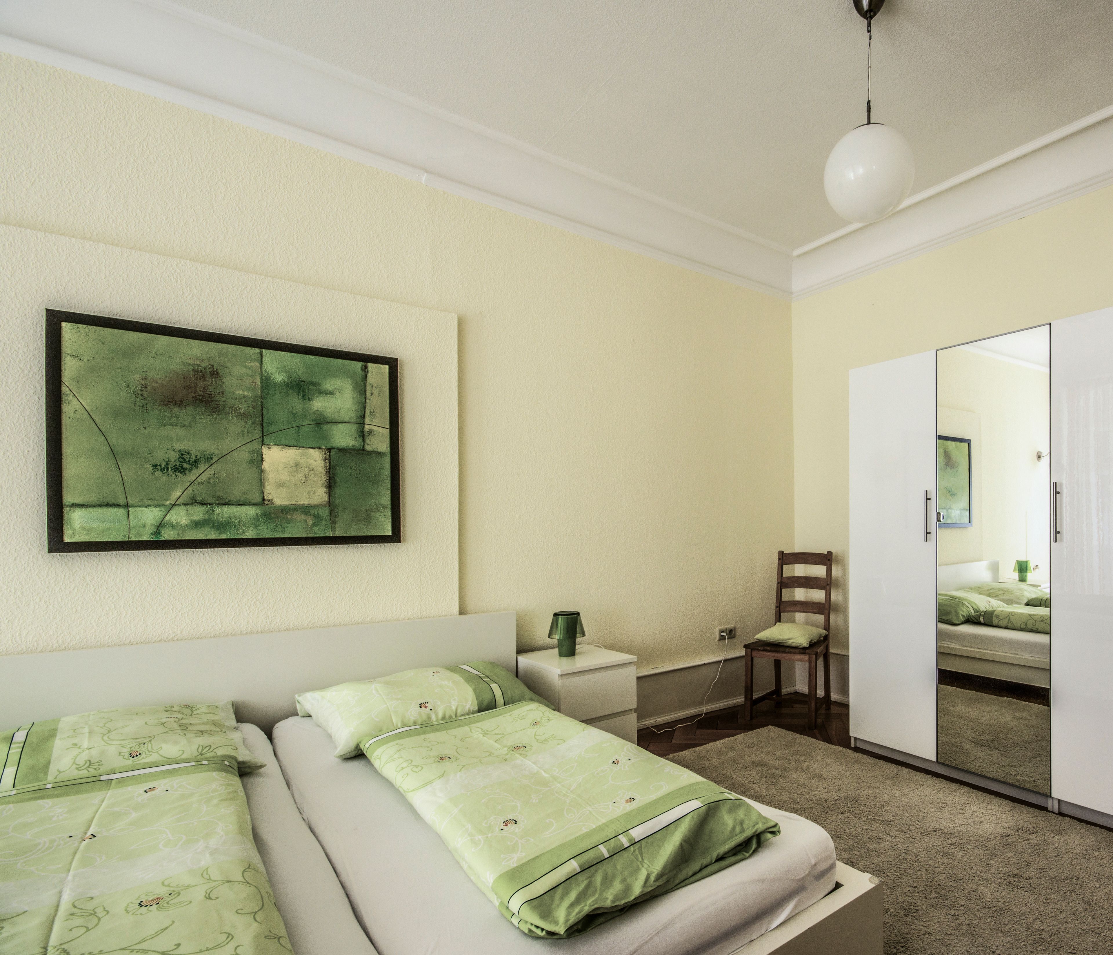 Im Privatbereich erwarten Sie ein wohldimensioniertes Schlafzimmer mit Doppelbett sowie ein modernes Wohlfühlbad mit Duschwanne und Waschmaschine.