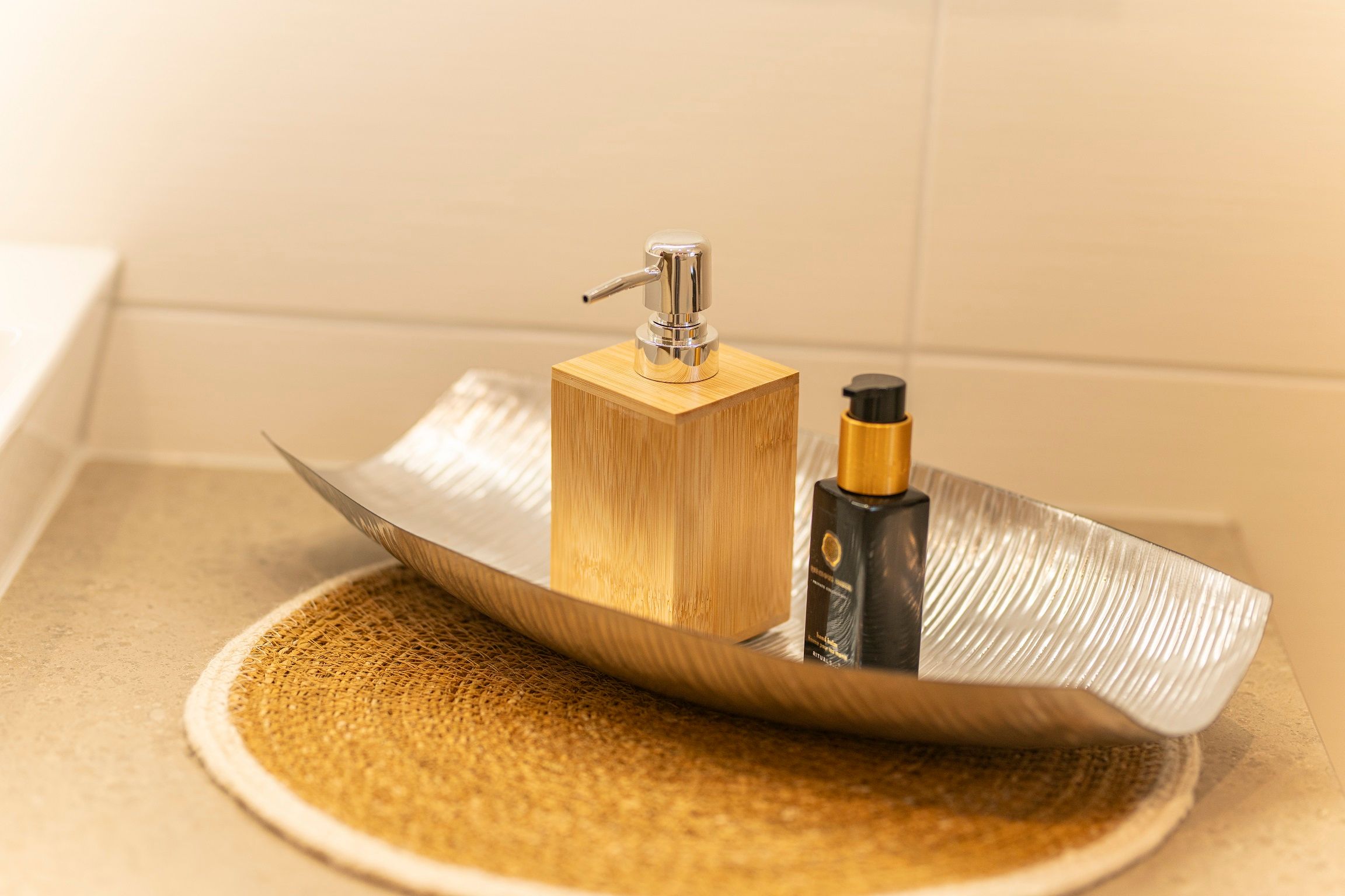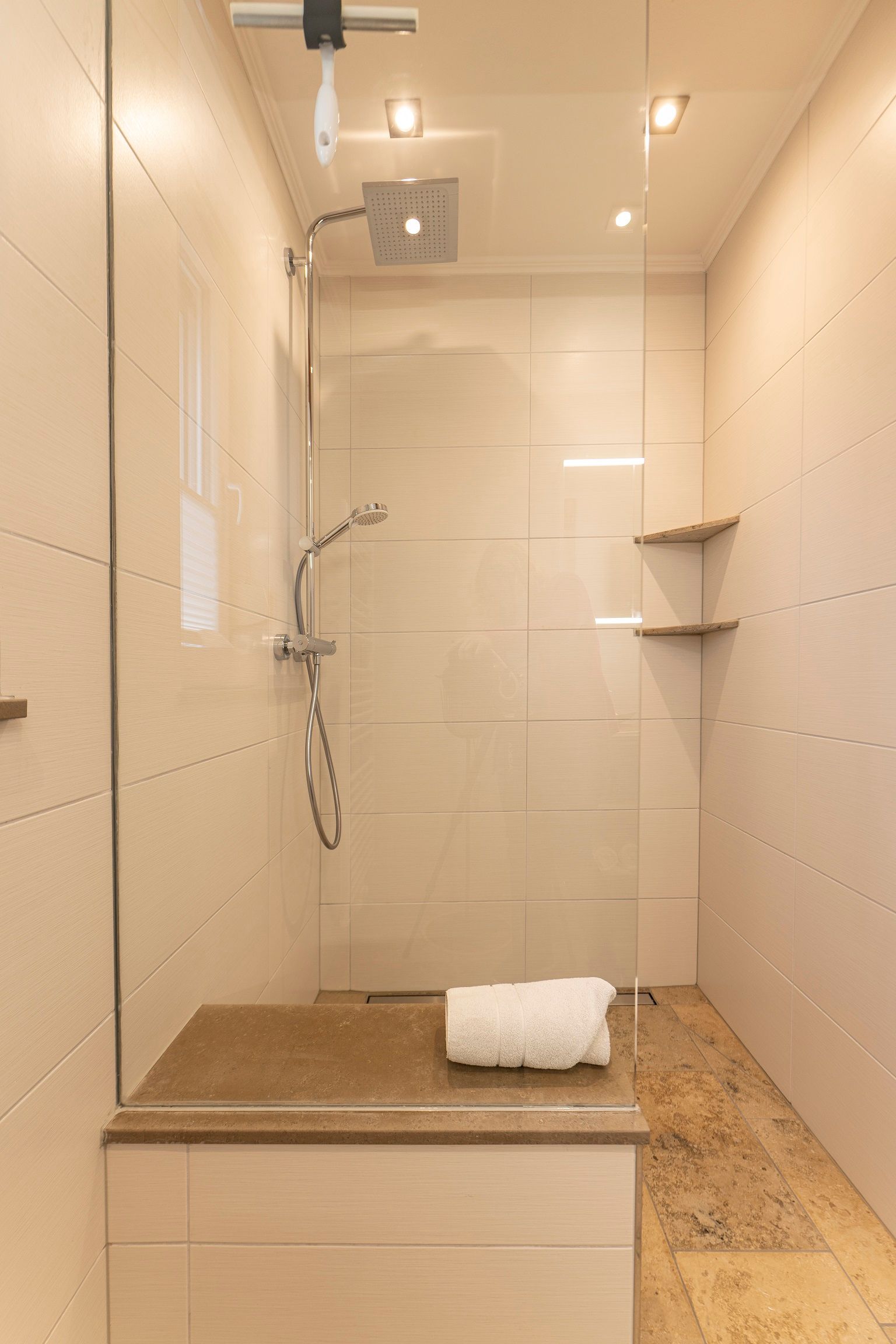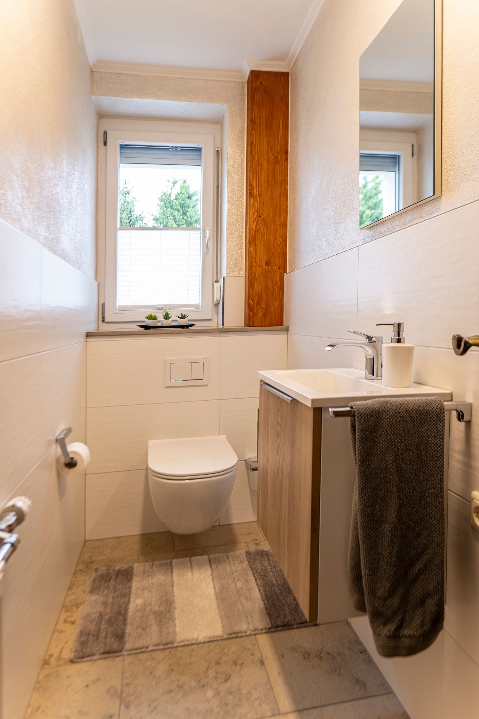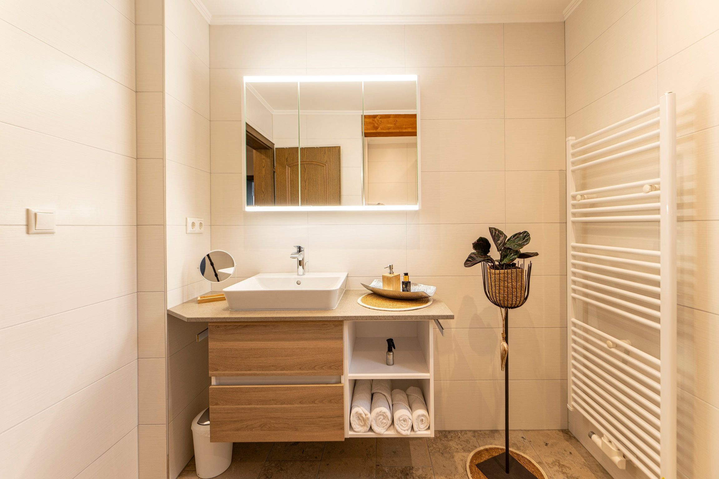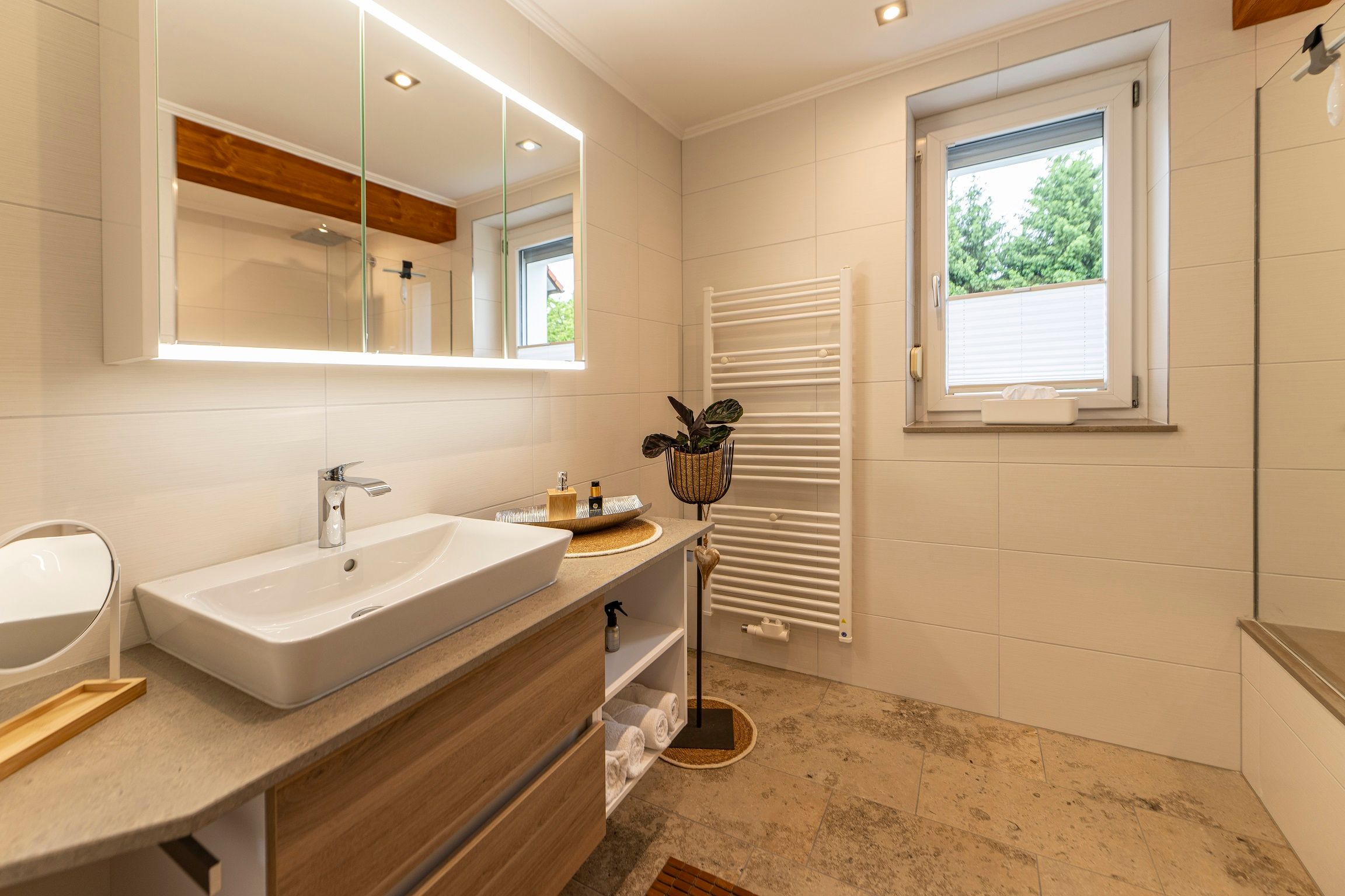Das moderne Bad bietet eine ebenerdige Dusche mit Regenwaldfunktion, Waschtisch mit Spiegelschrank sowie Pflegeprodukte. Ein separates WC mit Waschbecken ergänzt den Sanitärbereich.