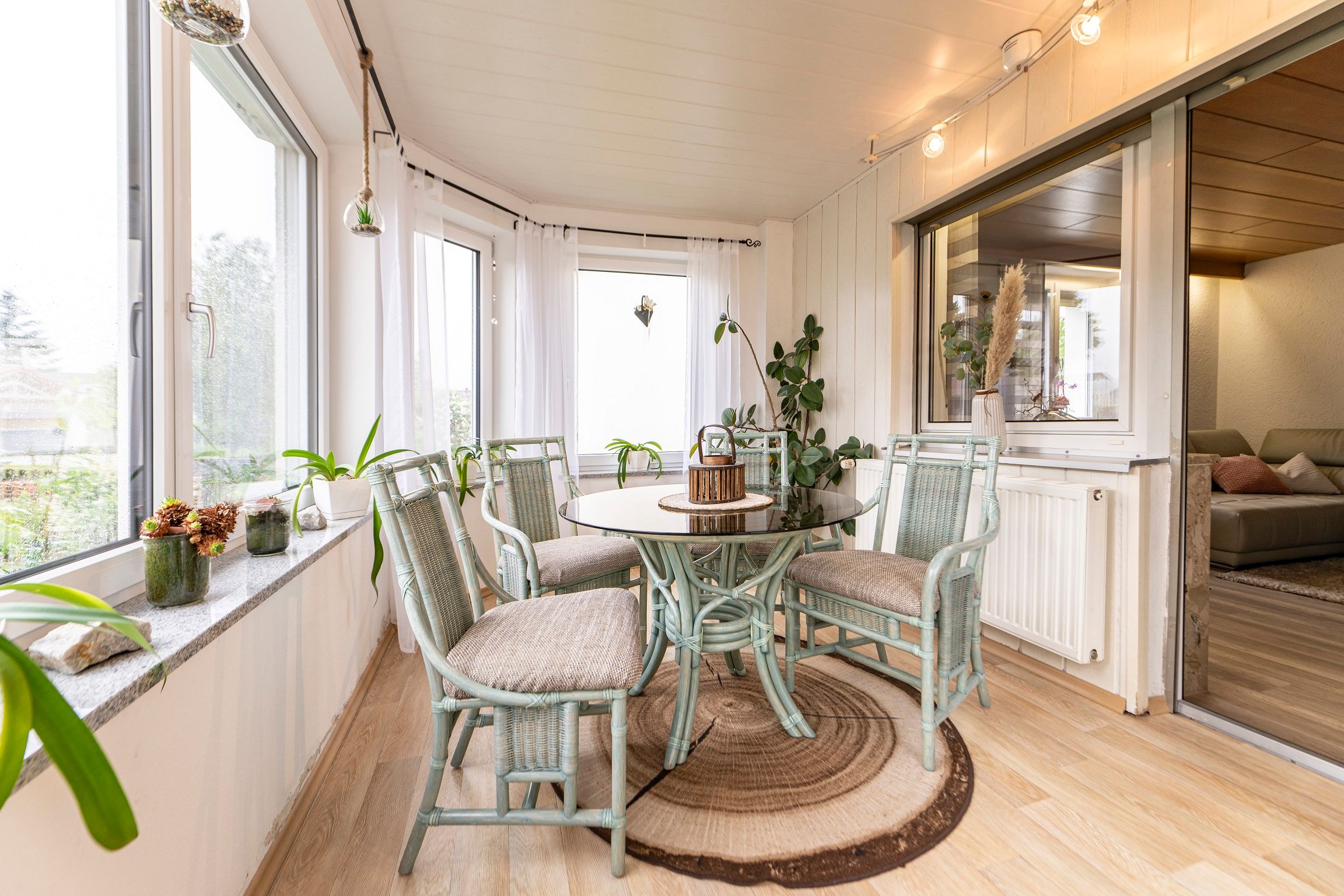 Im Wohnzimmer lädt ein bequemes Echtledersofa mit Couchtisch und Wand-TV zum Entspannen ein. Gesellschaftsspiele stehen ebenfalls bereit. Der helle Wintergarten mit Sitzgruppe ist der perfekte Ort für gemütliche Stunden.